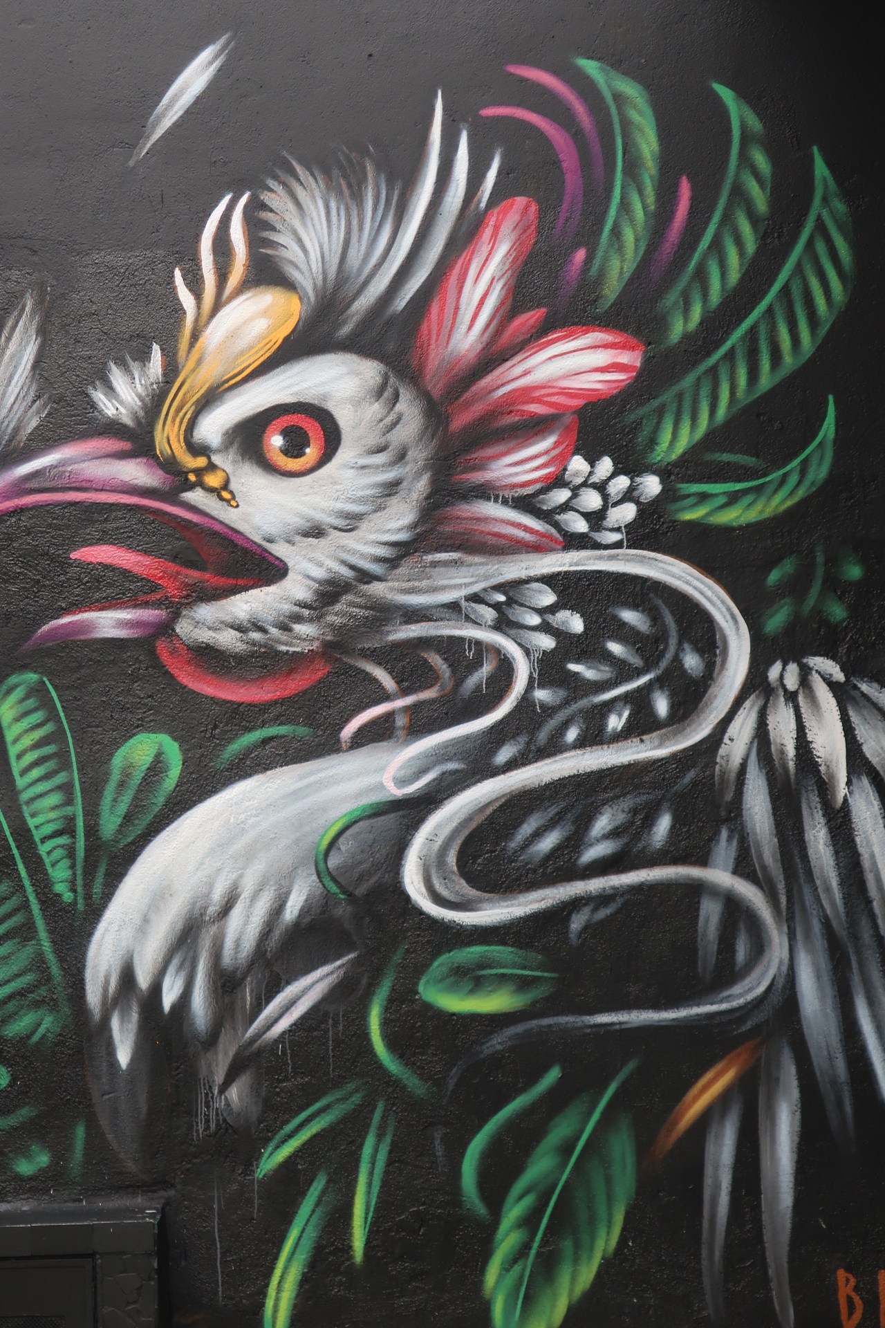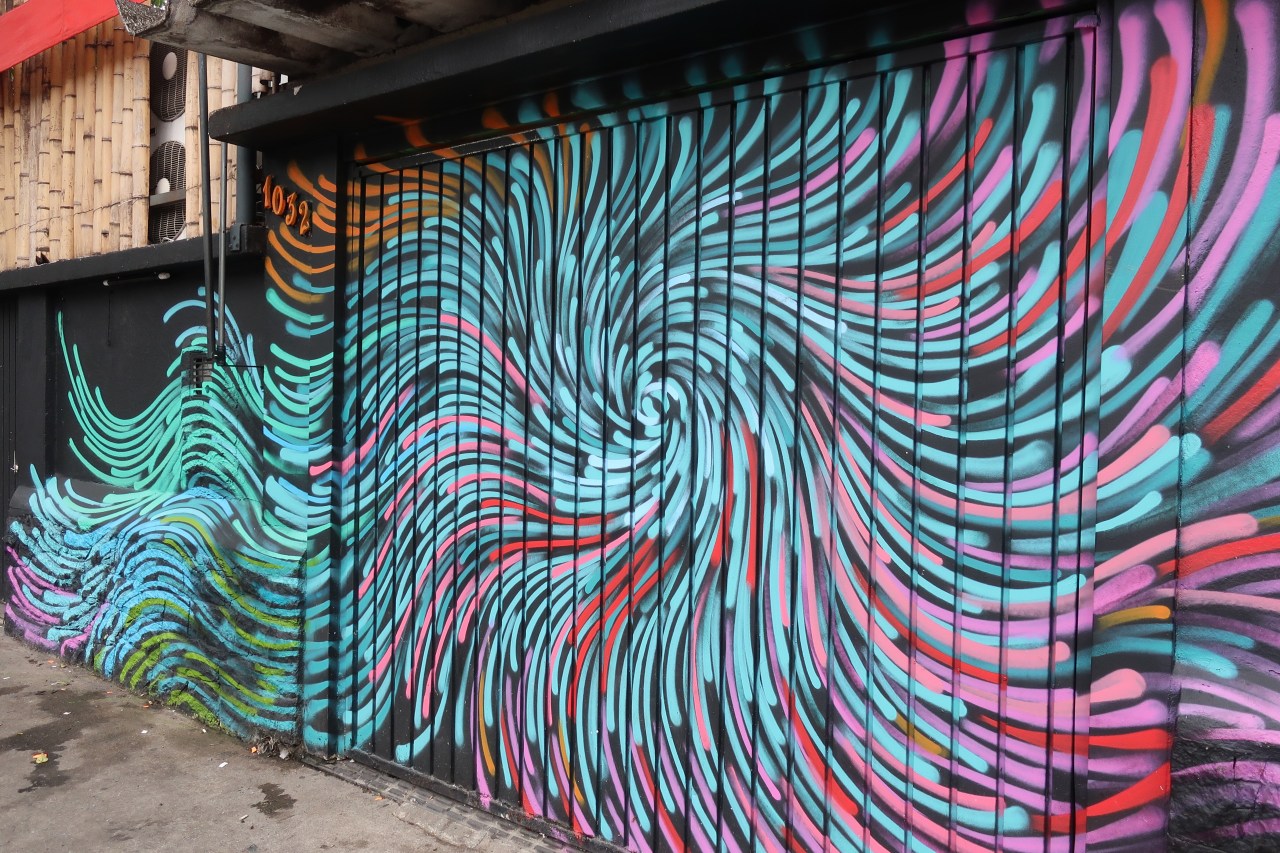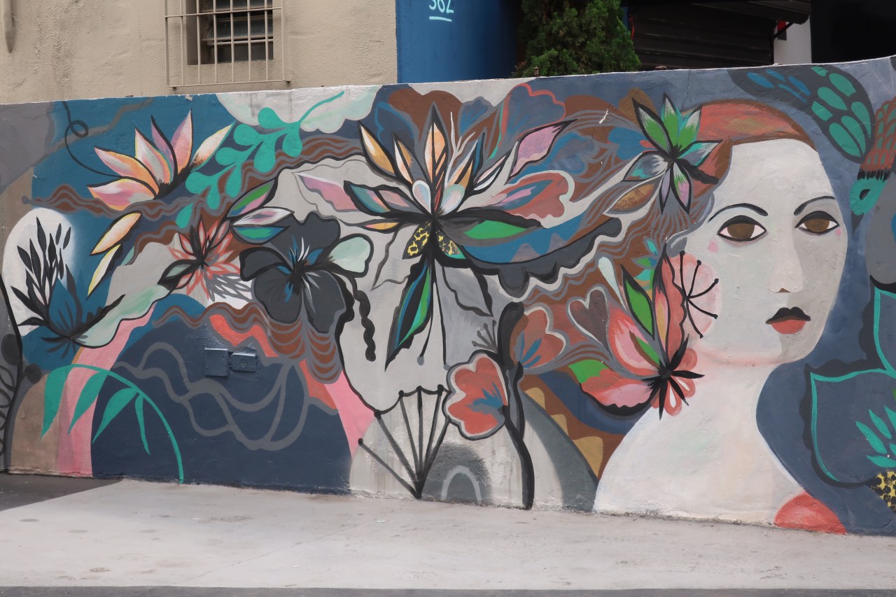 Beaucoup de murs avec des fleurs et des femmes ou des femmes-fleurs ou bien homme et oiseau ! Ou bien des vagues-fleurs qui colorent les portes des garages et donnent une impression de mer, de vent et de fraicheur. D’autres représentant des plongeurs dans un monde marin où les chats côtoient les poissons ou des chats.