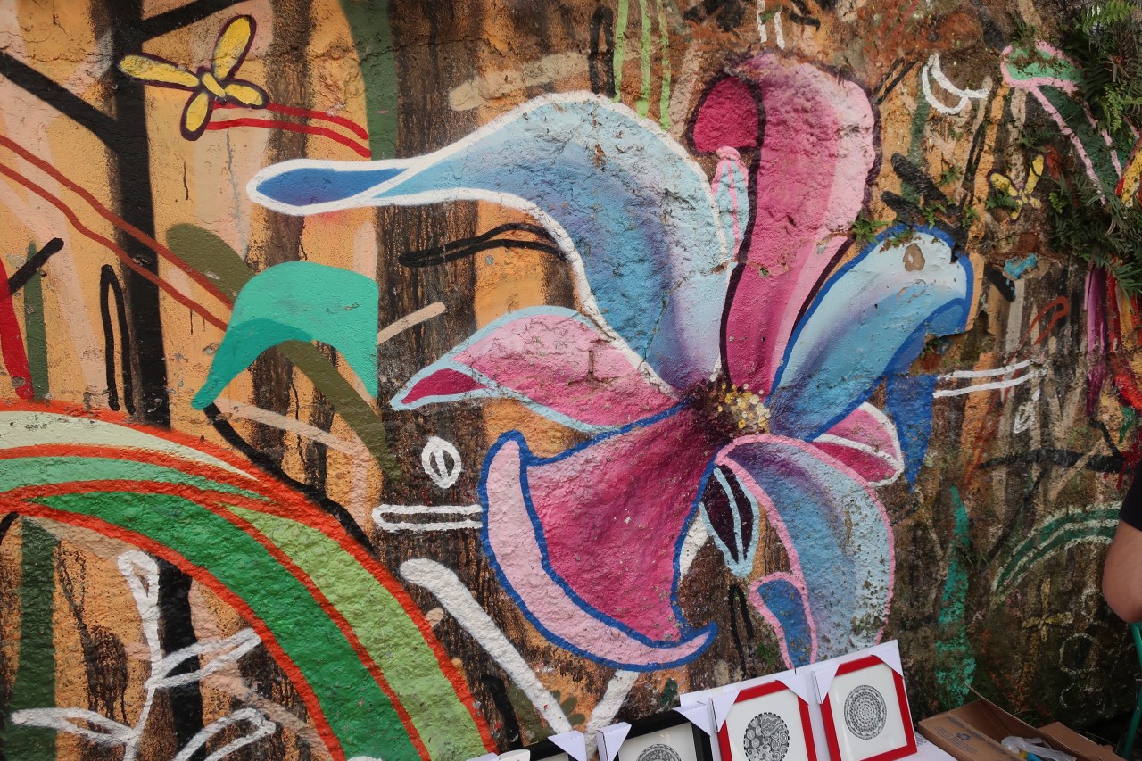 Beco de Batman et Beco de Aprendiz sont les lieux où les murs sont recouverts des dessins et où pas un morceau de murs n’est resté vierge. C’est assez enchanteur. Chaque pan de mur est détenu par un artiste qui vient le colorier et y mettre son empreinte. En 2002 Beco de Aprendiz qui veut dire « ateliers des apprentis » a permis à des jeunes artistes qui n’avaient pas la place de s’exprimer sur Beco de Batman de s’incruster à cet endroit. Là tous les styles se chevauchent et se partagent les murs : les fleurs comme les oiseaux sorte de colibris ; the beagles qui m’ont fait rire où les beatles sont représentés sous forme de tête de chiens – terriblement drôle ! Un paon où tout le monde se prend en photo pour faire la roue ; Même les éléphants font parties du paysage qu’ils soient roses ou gris marrons avec des fleurs ; un mur de fleurs où l’on se fait coiffer les cheveux pour faire des nattes africaines ! Des visages où la tristesse ou l’émerveillement se fréquentent. Trois doigts en l’air aussi disent je vous emmerde ! tout est dit dans ces graffitis. Et la liberté d’expression n’est pas censurée. Au contraire elle s’exprime en toute extraversion et dans toute sa sensibilité ! Elle y dépeint l’amour, la gentillesse, la tendresse, l’amitié, la parole. Et surtout ce lieu est un endroit où les gens vivent, viennent se promener le dimanche en amoureux ou en couple, et se faire photographier au milieu de ces dessins. Une vie s’organise autour.