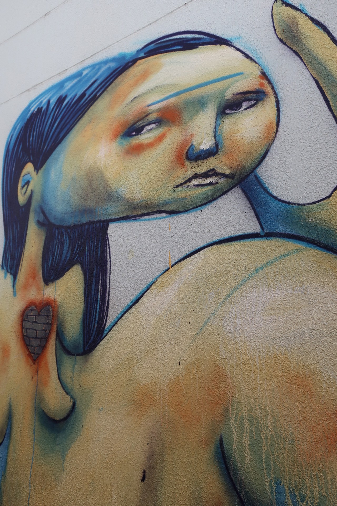 un mur de chats avec des empreintes de coussinets ; des peintures du dessinateur Kobra où la violence fait surface ; ou de Razir sur la maladie des femmes – je suppose sur le cancer – cri arrachant ; ou ce visage d’aztèque (mon imagination) entre deux arbres et le poisson noir avec des abandonnés de Dieux qui quémandent, au sol, juste en dessous de la peinture. Un homme et une femme par l’auteur Jotapëpax.