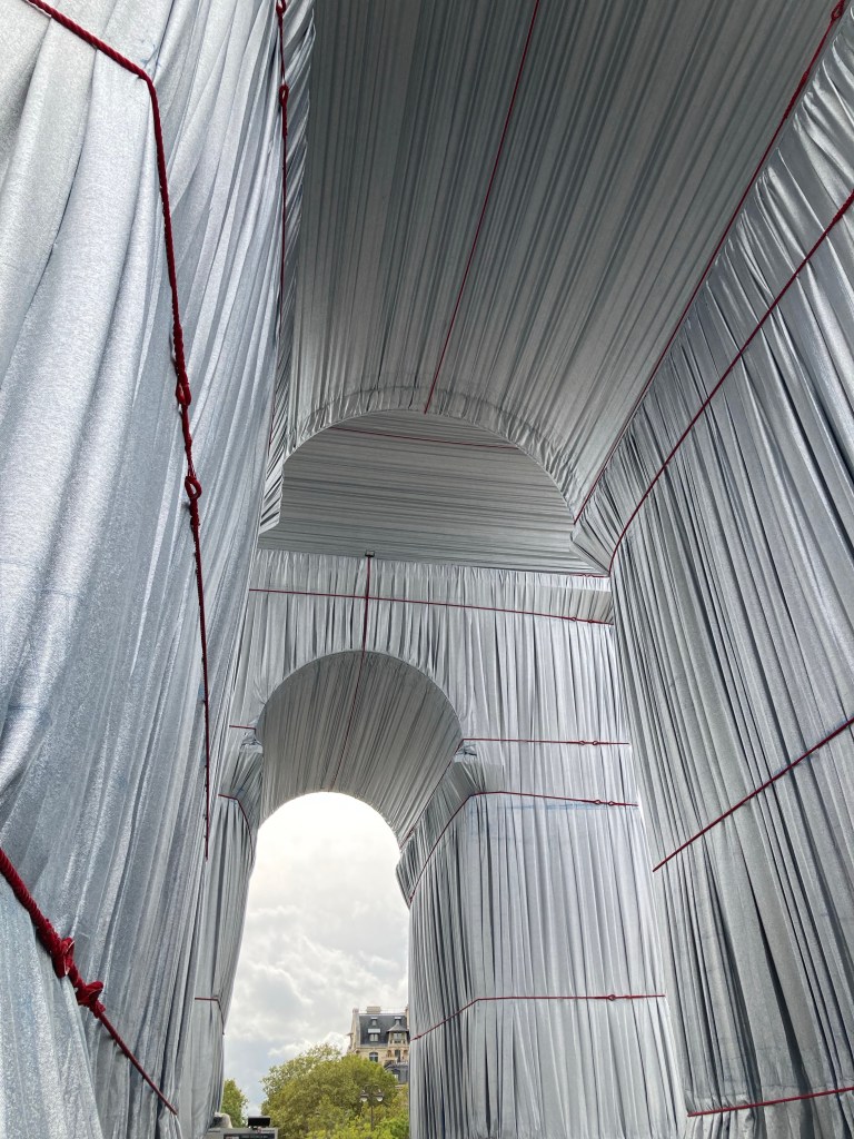 La dernière œuvre de land art a nécessité quelque 25 000 mètres carrés de tissu recyclable, 3 000 mètres de corde et plus d’un mois de travaux pour protéger les piliers de l’arc. Cette œuvre a été réalisée par le neveu de Christo, Vladimir Yarachev.