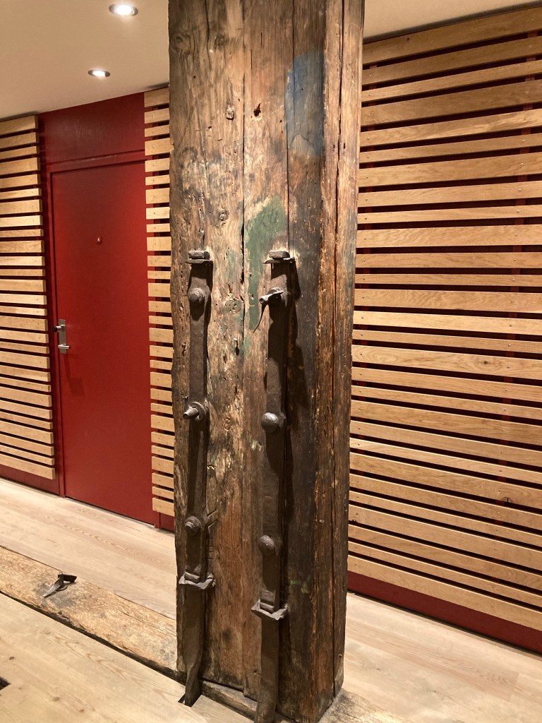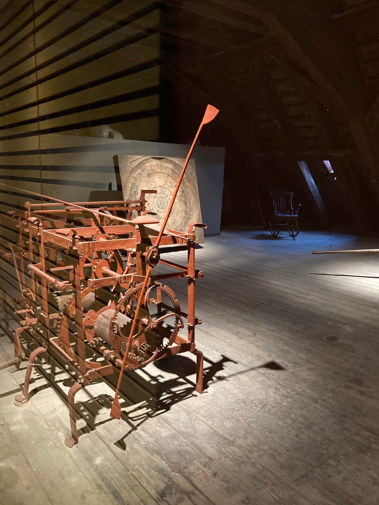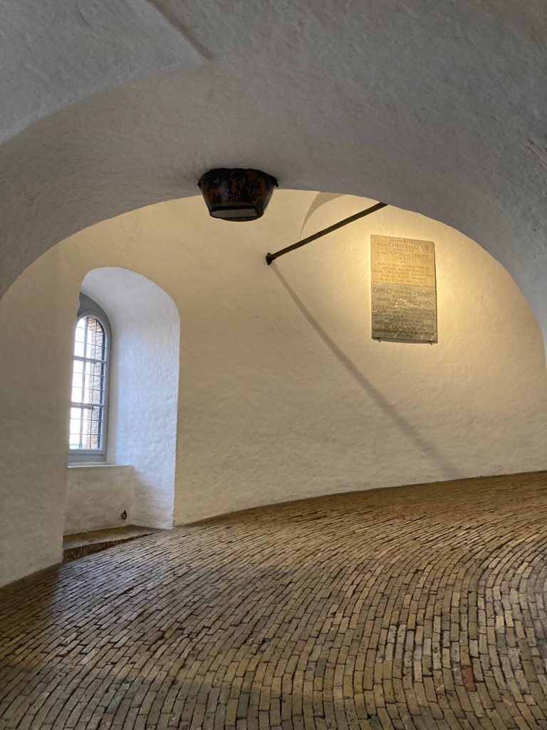 On grimpe et peut stopper à certain pallier pour pouvoir admirer la salle de la bibliothèque qui était en cours d’aménagement pour une exposition – dénommée ainsi car elle fut la bibliothèque universitaire jusqu’en 1861. L’étape suivante c’est le grenier que j’ai visité en redescendant. C’est une pure merveille. On peut y admirer la charpente du grenier de la cloche détruite au moment de l’incendie de Copenhague en 1728. On se trouve deux étages au-dessus de l’église La Trinité. On peut aussi y voir quelques très belles pièces sur la science et les poteaux qui soutiennent la charpente.