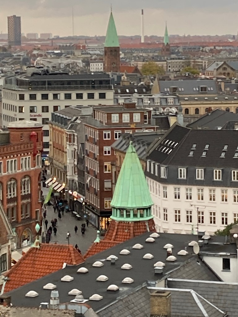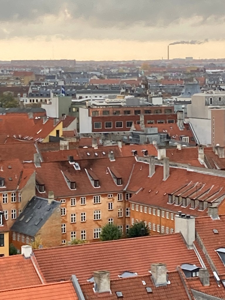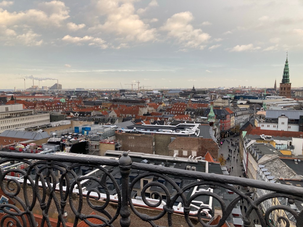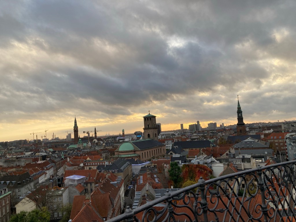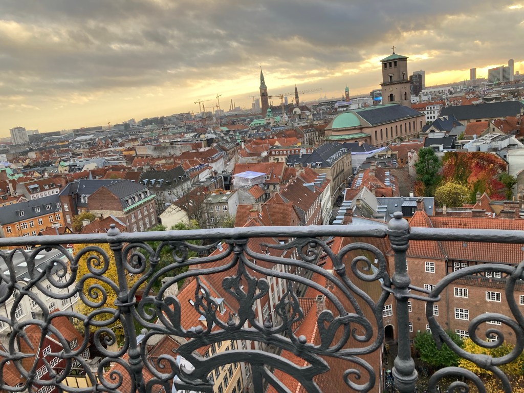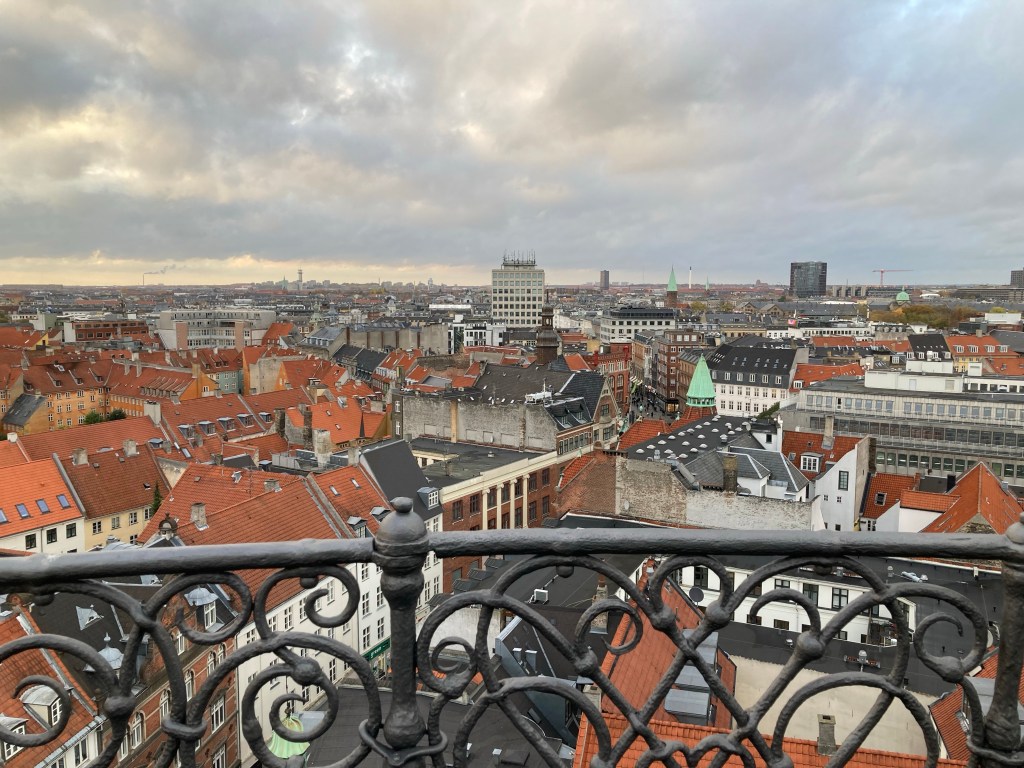 On est d’abord surpris par la vue à 360° sur la ville et puis on tourne autour de la tour pour admirer la vue et les bâtiments qui s’offrent à nos eux. Un peu de vent ce jour-là m’accompagnait, les nuages se jouaient de la vue et le soleil ainsi que le ciel bleu faisaient de brève apparition. Une très belle rambarde à claires-voies de Gaspar Fincke ornées du monogramme du roi Christian IV ainsi que sa devise « Regna Firmat Pietas » (soit la Piété fortifie les règnes) nous protégeait de l’appel du vide. Je vous laisse regarder les vues sur la ville à la limite du coucher du soleil.