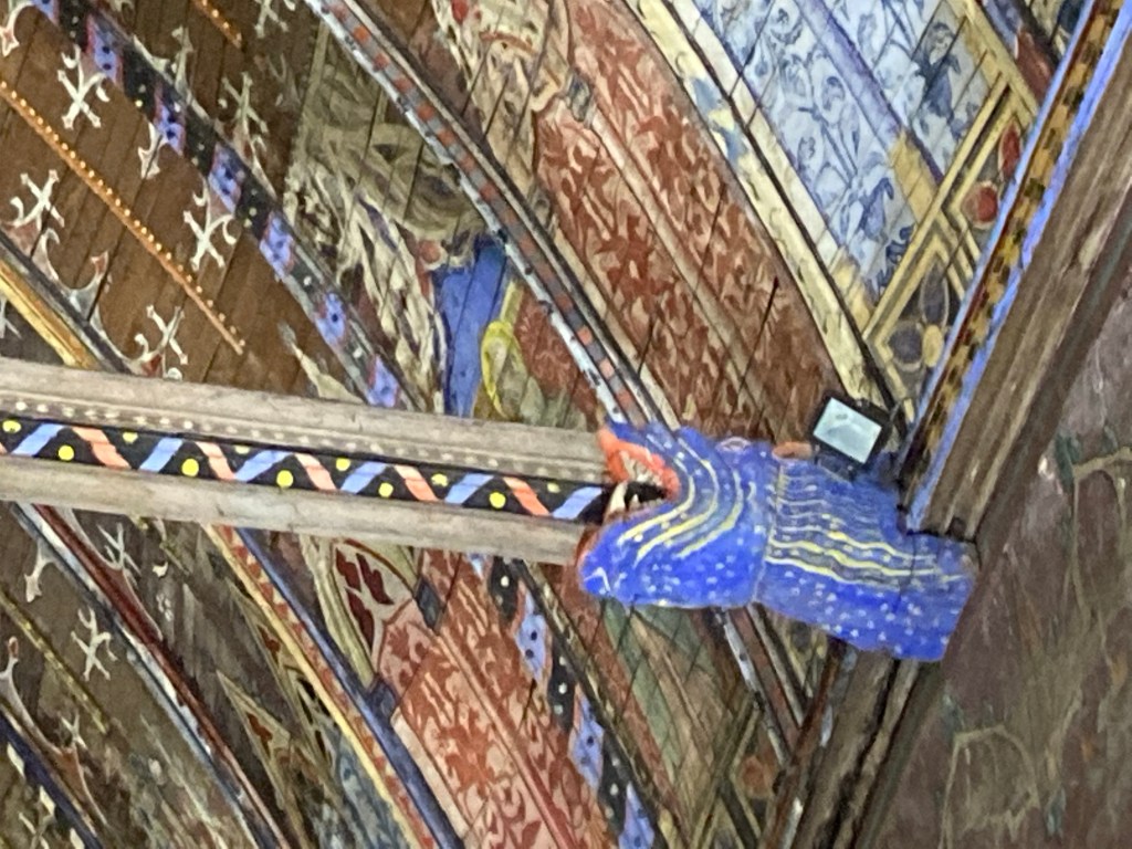 Deux grandes places entrecoupées par l’église Saint Jacques qui arbore un toit en forme de bateau renversé peint d’armoiries et de vitraux sur le bois. Une étincelle de beauté qui illumine cet écrin chrétien. Les poutres tenant cet édifice offrent des gueules de dragon rouge. Très dépaysant pour une église.