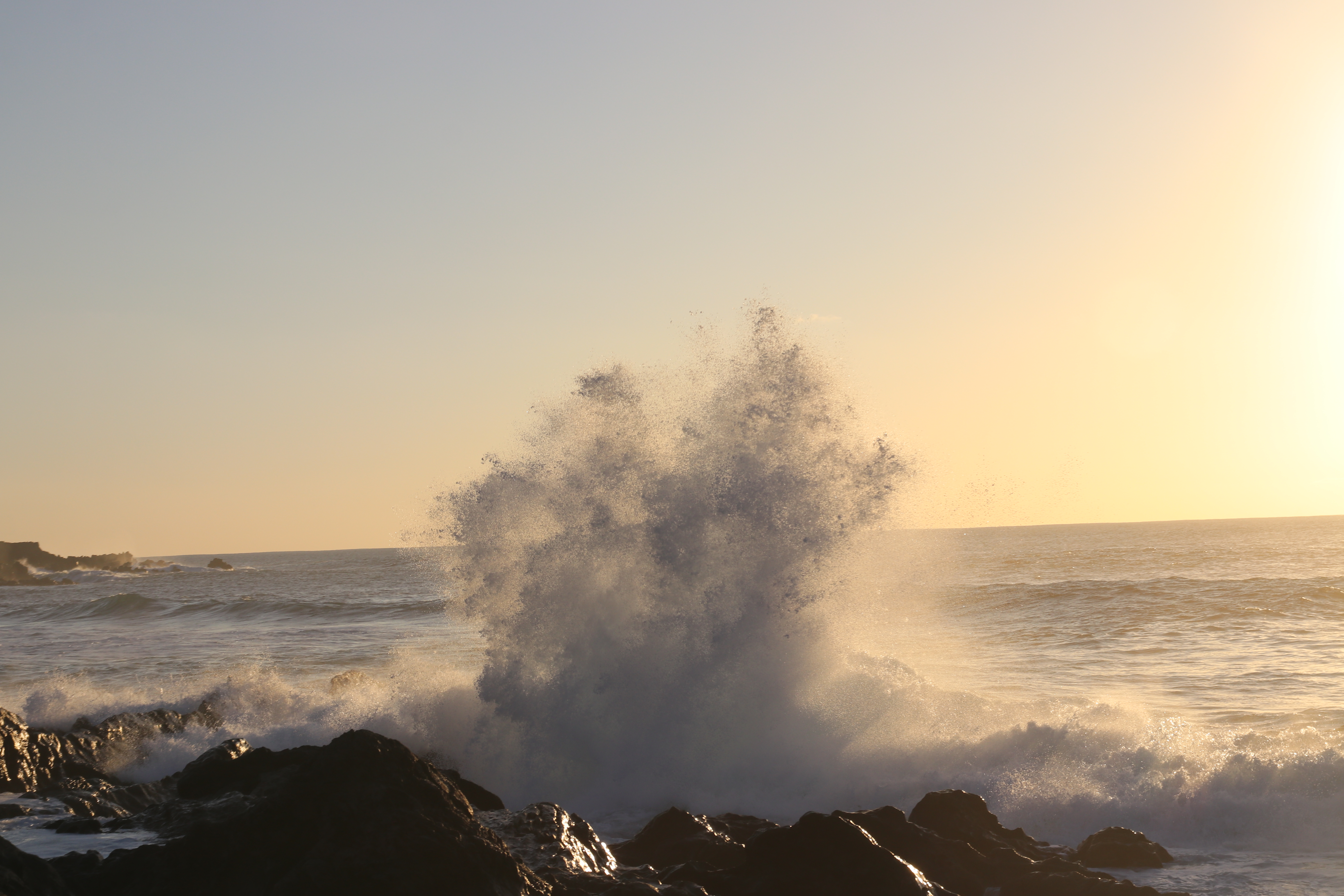 Par temps de grand vent les vagues viennent frapper les roches et s’incrustent dans les morceaux de pierre pour faire des rigoles. L’écume alors se soulève et forme des jets grandiloquents qui explosent. Et ce mouvement est incessant et vous agresse les oreilles. La mer devient démente et l’homme se sent tout petit et à sa merci. La mer s’échoue sur la baie en formant des bulles d’écumes et des stries arrondies donnant au paysage un aspect lunaire. Elle peut aussi lécher le sable noir en formant des reflets sur le sable et laissant des marques perceptibles, délébiles disparaissant et réapparaissant instantanément. Par endroit la mer s’engouffre dans les roches qui forment des avancées en forme de crocodile échoués attendant leurs proies.