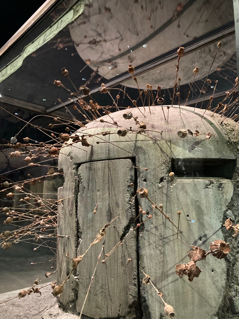 Le bunker planté au milieu de la salle prend toute son importance. Il en impose et vous fait sentir sa terrifiante réalité – guerre, jeux d’enfants sur les bunkers, bombes, morts…. Malgré des fleurs de pavot qui éclosent comme des dards attaquant la peau des hommes et des femmes peuplant ce monde.