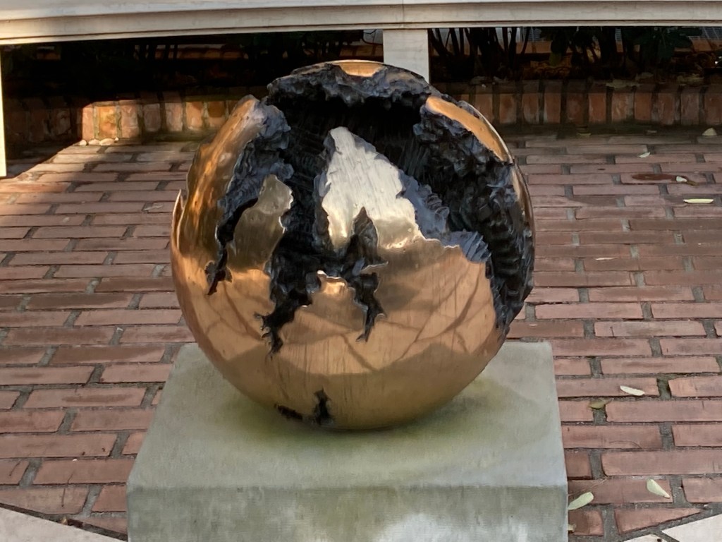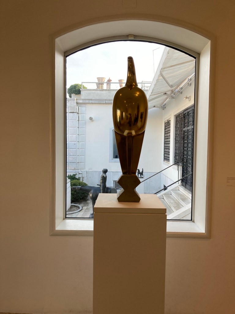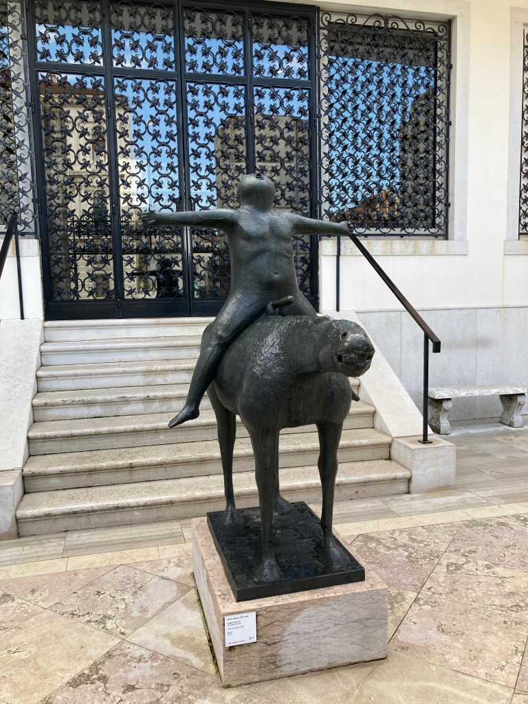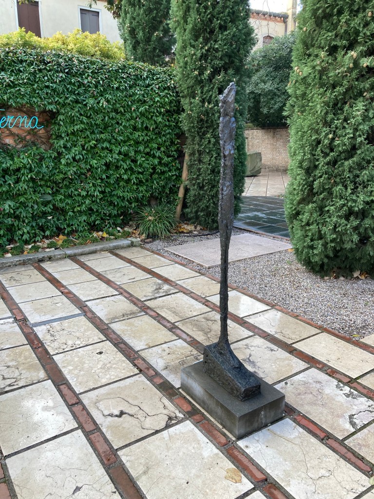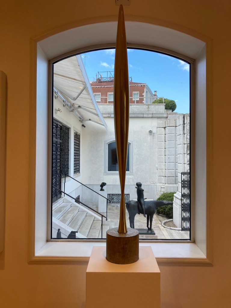 Aujourd’hui on doit réserver et passer un certain nombre de contrôles pour le Covid. Et puis on atterrit dans une première cour et on file par un escalier à travers une première entrée dans la cour intérieure où règne l’esprit de la créatrice Peggy Guggenheim. On y retrouve les œuvres de Max Ernst, art moderne surréaliste à côté d’œuvre purement vénitienne (le trône) et d’un Giacometti au corps élancé.