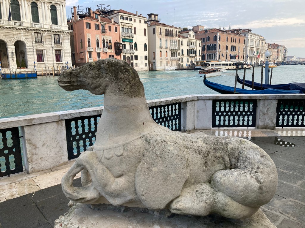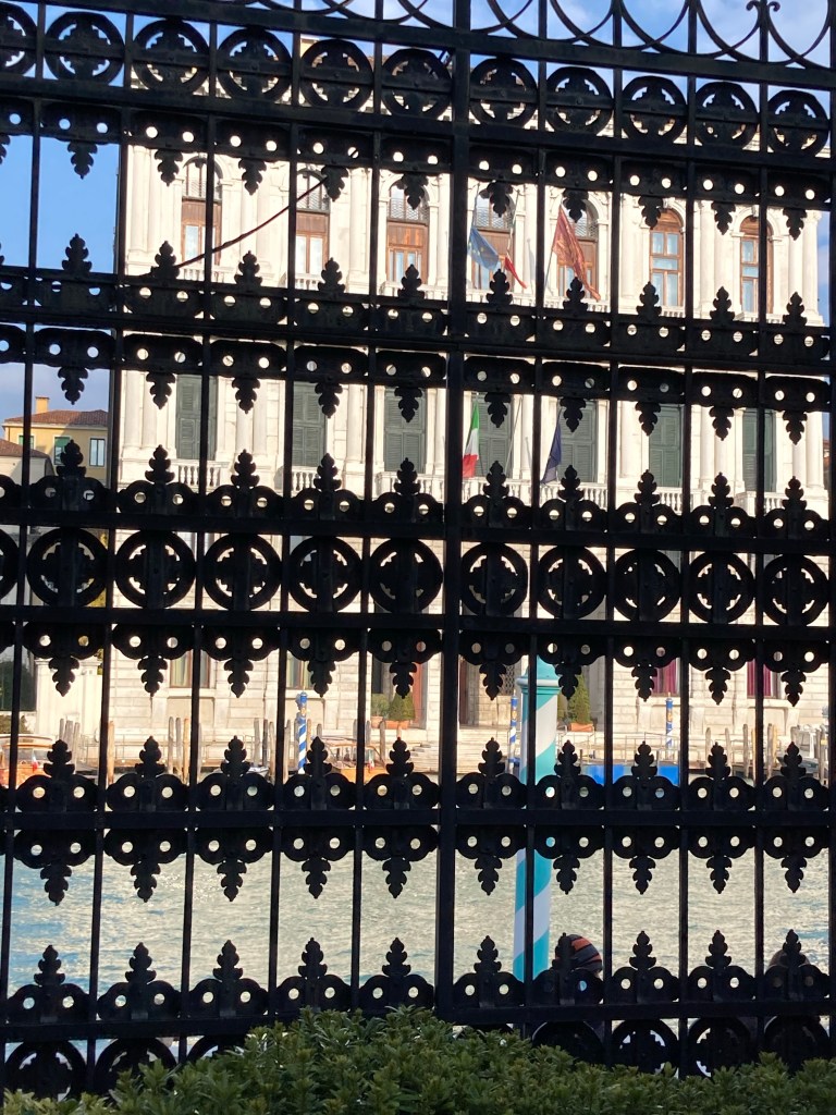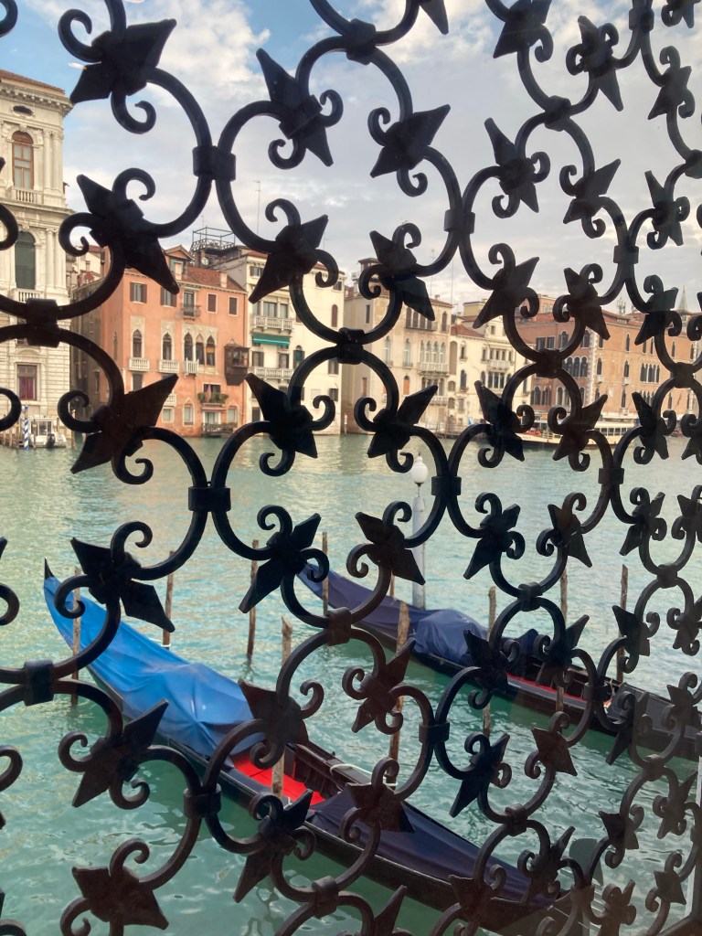 En sortant sur le ponton en pierre du Musée on peut alors admirer la vue de chaque côté sur le Grand Canal ; admirer les gondoles flottant, amarrées aux poteaux, gigotant aux passages des vaporetto. On peut aussi voir les têtes de lions et les chevaux qui sont de chaque côté de l’entrée. Les grilles font elles aussi une sorte de moucharabiés qui rend la ville et ses palais surréels et en superposition comme dans un kaléidoscope déformant la vue. N’est-ce pas tout Venise ?