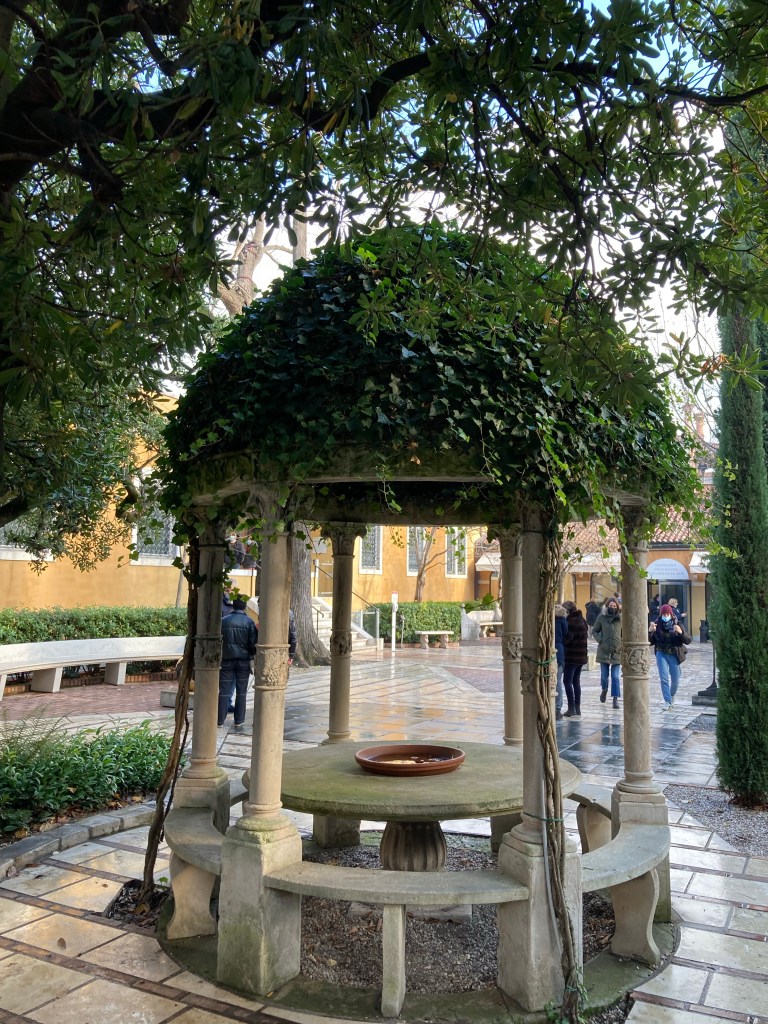 En ressortant je découvre le jardin avec ces cyprès pointus comme des i très fins. Une impression de Toscane et non de Venise. Et la rotonde donne une vue sur la maison jaune et une impression de calme malgré les nombreux visiteurs.