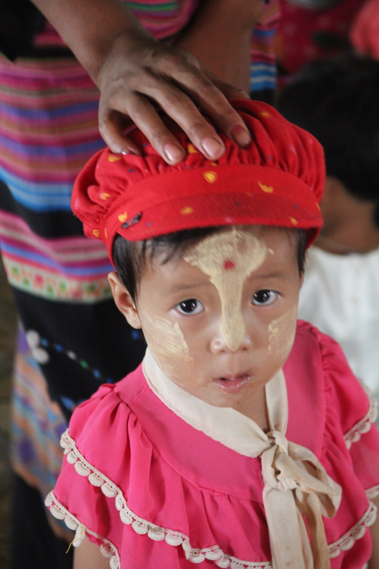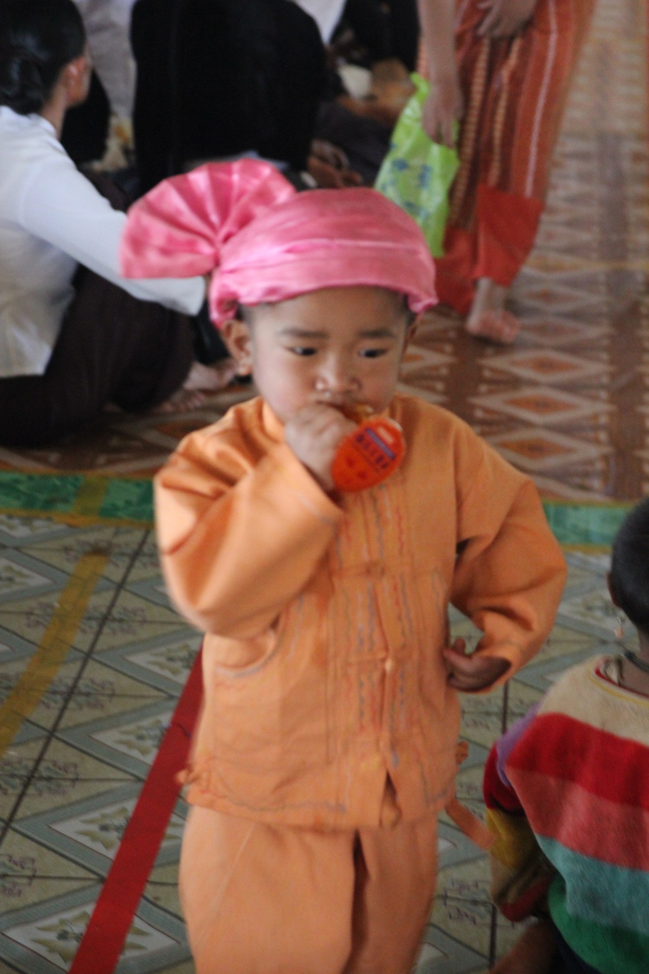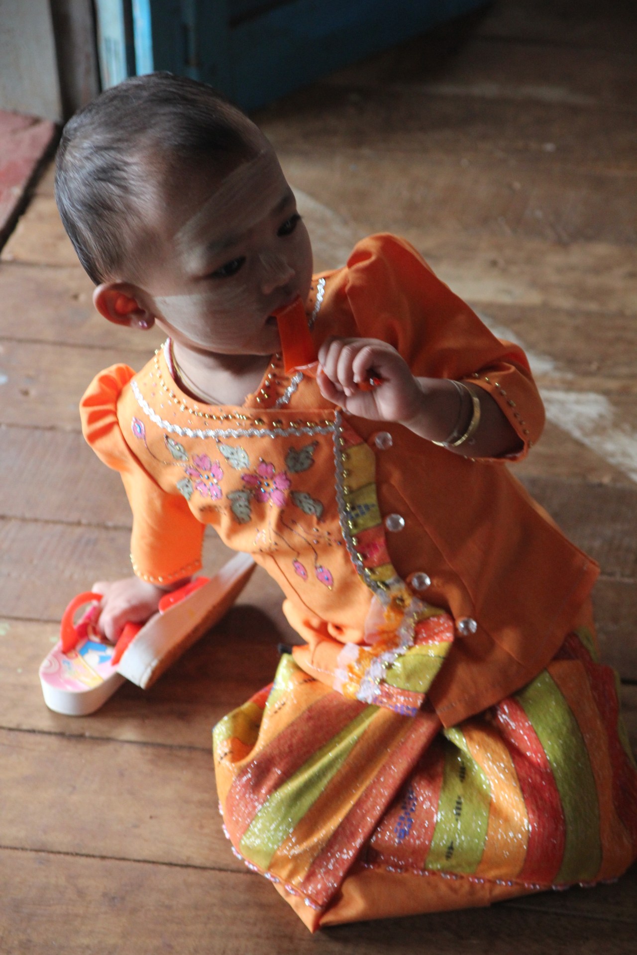 Les enfants plus ou moins sages écoutaient les paroles des mères et me regardaient avec curiosité, approchant ou reculant selon leur degré d’intrépidité. Les visages de ces derniers étaient recouverts de la crème blanche sur les joues, le nez rejoignant le front avec un joli point rouge si nécessaire. On aurait dit des mosaïques ou bien des mandalas blancs peints sur les visages des femmes et des enfants. Une fillette avait le visage tout blanc, joues et fronts complètement peints. Elle portait une robe orange, verte jaune avec un joli corsage brodé de fleurs roses. Cela lui donnait un éclat extraordinaire. On aurait dit une danseuse cambodgienne se tortillant sur ses jambes repliées et nous faisant un délié spécial. Elle suçait une sorte de long ruban rouge. Un petit garçon a déambulé tout le temps de la cérémonie le long de l’espace laissé à profit, en costume orange avec sur la tête un turban rose et une sorte d’aigrette arrondie. Il avait l’air pensif et surtout concentré sur le plaisir de sucer son bonbon rouge.