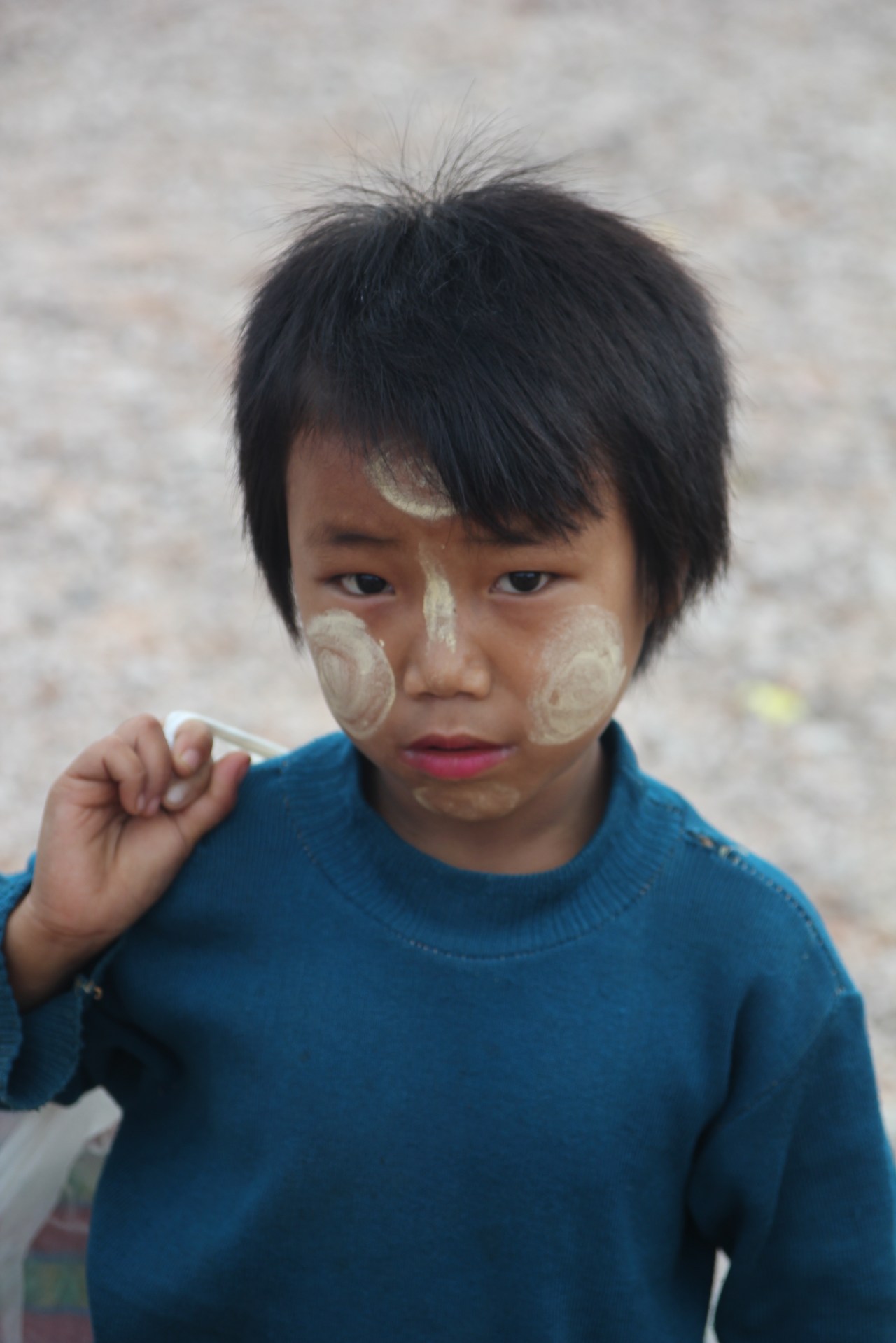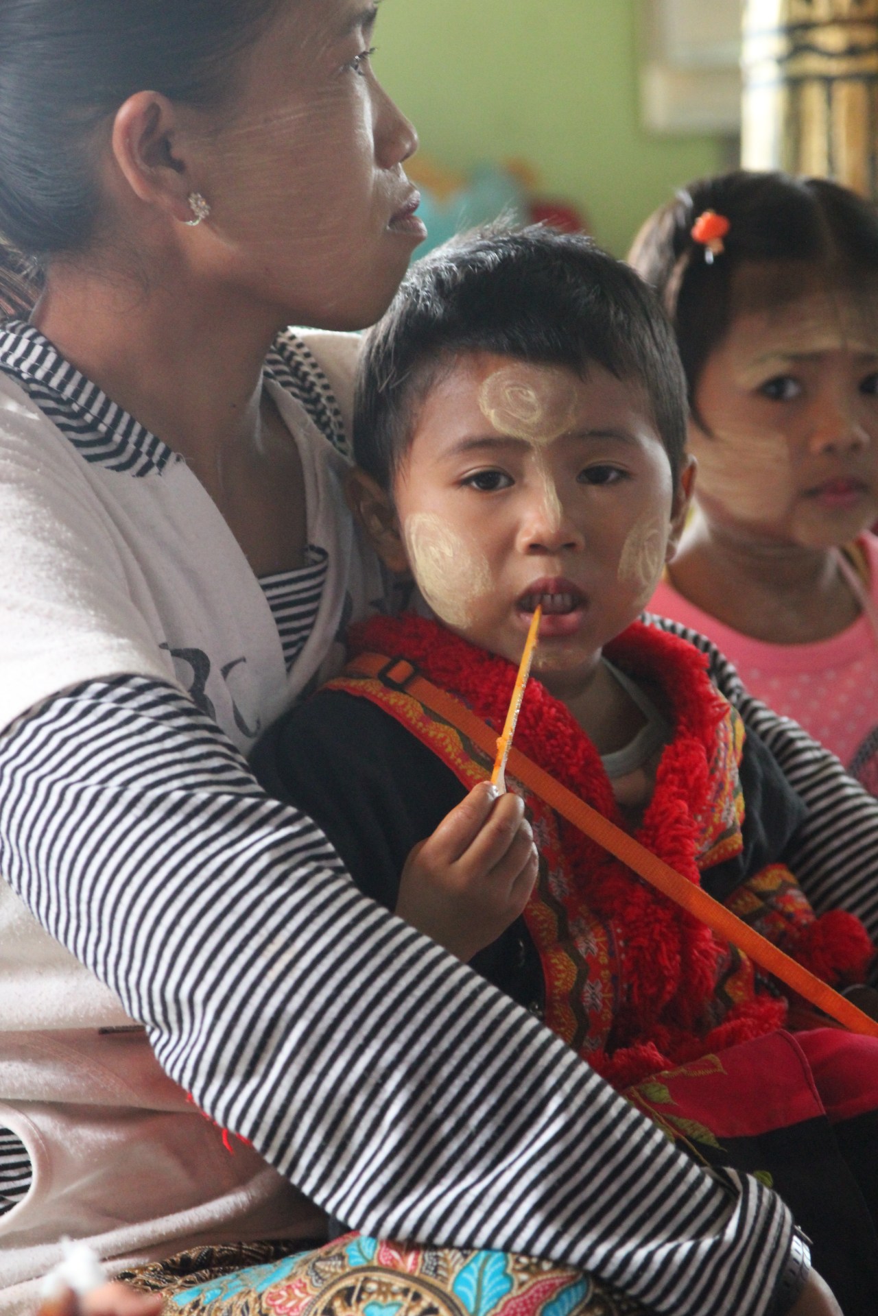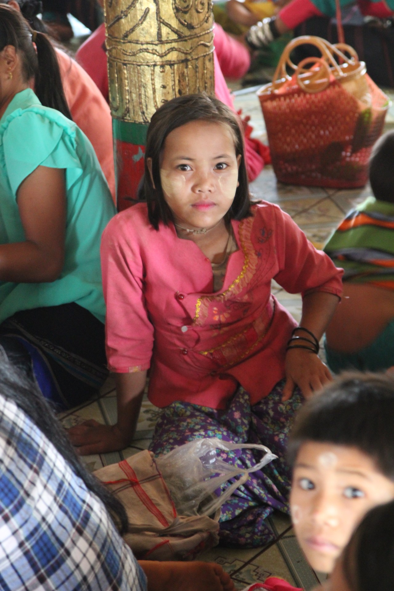 Les enfants plus ou moins sages écoutaient les paroles des mères et me regardaient avec curiosité, approchant ou reculant selon leur degré d’intrépidité. Les visages de ces derniers étaient recouverts de la crème blanche sur les joues, le nez rejoignant le front avec un joli point rouge si nécessaire. On aurait dit des mosaïques ou bien des mandalas blancs peints sur les visages des femmes et des enfants. Une fillette avait le visage tout blanc, joues et fronts complètement peints. Elle portait une robe orange, verte jaune avec un joli corsage brodé de fleurs roses. Cela lui donnait un éclat extraordinaire. On aurait dit une danseuse cambodgienne se tortillant sur ses jambes repliées et nous faisant un délié spécial. Elle suçait une sorte de long ruban rouge. Un petit garçon a déambulé tout le temps de la cérémonie le long de l’espace laissé à profit, en costume orange avec sur la tête un turban rose et une sorte d’aigrette arrondie. Il avait l’air pensif et surtout concentré sur le plaisir de sucer son bonbon rouge.
