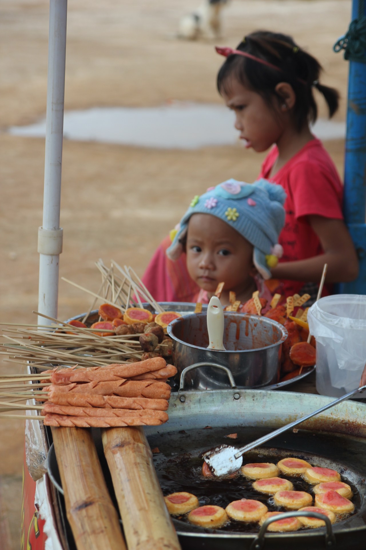 Elles se retrouvaient près d’une pagode et la joie de partager ce moment était écrit sur leurs visages. La fête était au rendez-vous et cela commençait dans l’aire du temple. Tout autour des sortes de guinguettes offraient aux arrivants de quoi manger ou se restaurer ; de quoi acheter des offrandes, de la nourriture et de l’eau purifiée. On pouvait se délecter des yeux mais du palais aussi : voir les saucisses attendant le chaland, des sortes de sucettes contenant je ne sais quel met mais dont la jolie petite fille au bonnet bleu, décoré de jolies fleurs en plastique jaune, rose et aux oreillettes recouvrant ses oreilles reluquait avec envie. Sa curiosité était aussi aiguillée par ma venue.