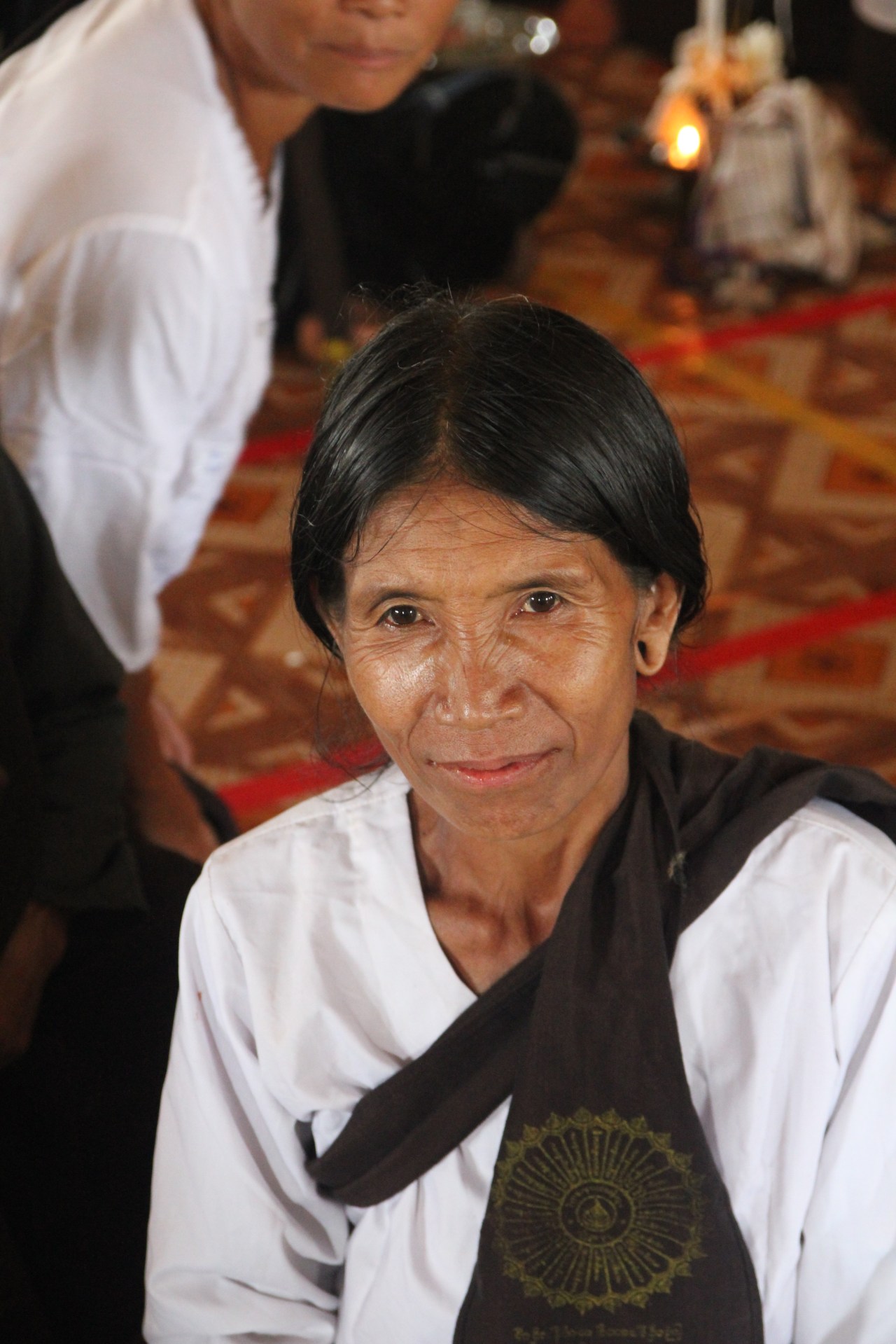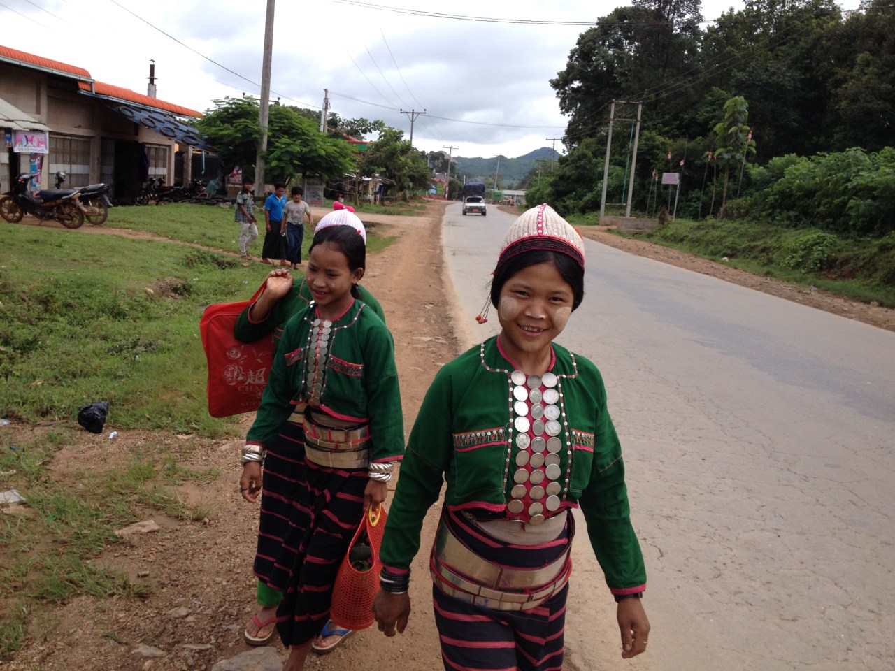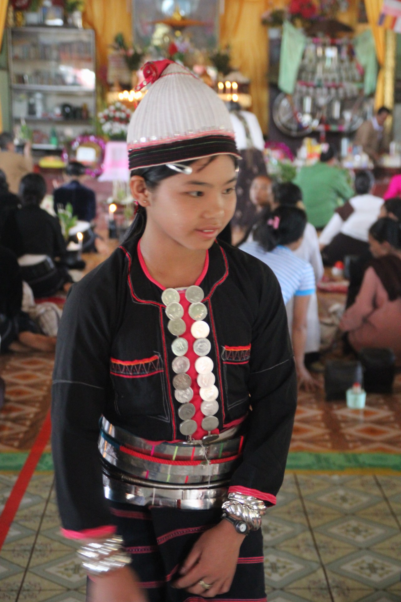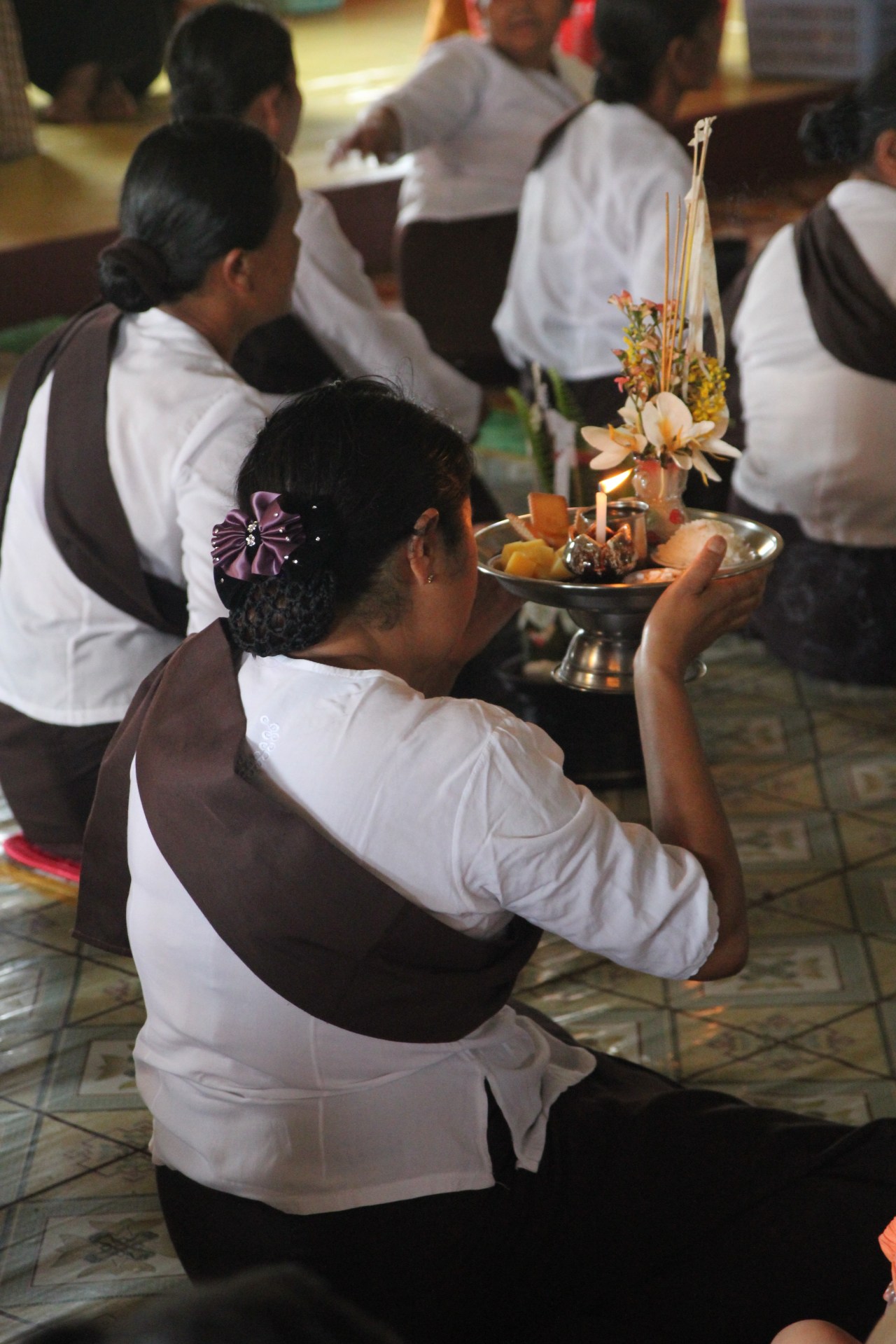 Ces femmes marchant sur leurs tongs, sur les chemins de terre, le long de la route, promenaient leurs paniers remplis d’offrandes, de fleurs, et bien d’autres choses. Elles faisaient une sorte de convoi, toutes plus colorées les unes que les autres. Cela égayait le paysage et me permettait d’admirer leurs costumes. Elles portaient des gilets roses ou verts et surtout sur la poitrine au centre elles avaient une rangée de pièces d’argent. Sur les hanches, des cercles d’argent leur entouraient le ventre, et tenaient les sarongs marron, vert ou noirs. De larges rangées en plastique noir et de très jolis bracelets torsadés en argent agrémentaient leurs hanches ou leurs poignets. Un petit chapeau pointu brodé de blanc, certain orné d’un joli pompon rose, leur donnait un port de tête admirable. Leurs visages étaient maquillés de la crème blanche pour les protéger du soleil. Certaines avaient un rond plein blanc, d’autres des points ou bien des sortes de labyrinthe. Une décoration supplémentaire qui les rendait toutes différentes. Elles déambulaient tout sourire sur le bord de la route ne prenant pas en compte les dangers du trafic. Une jolie troupe pour un rendez spirituel.