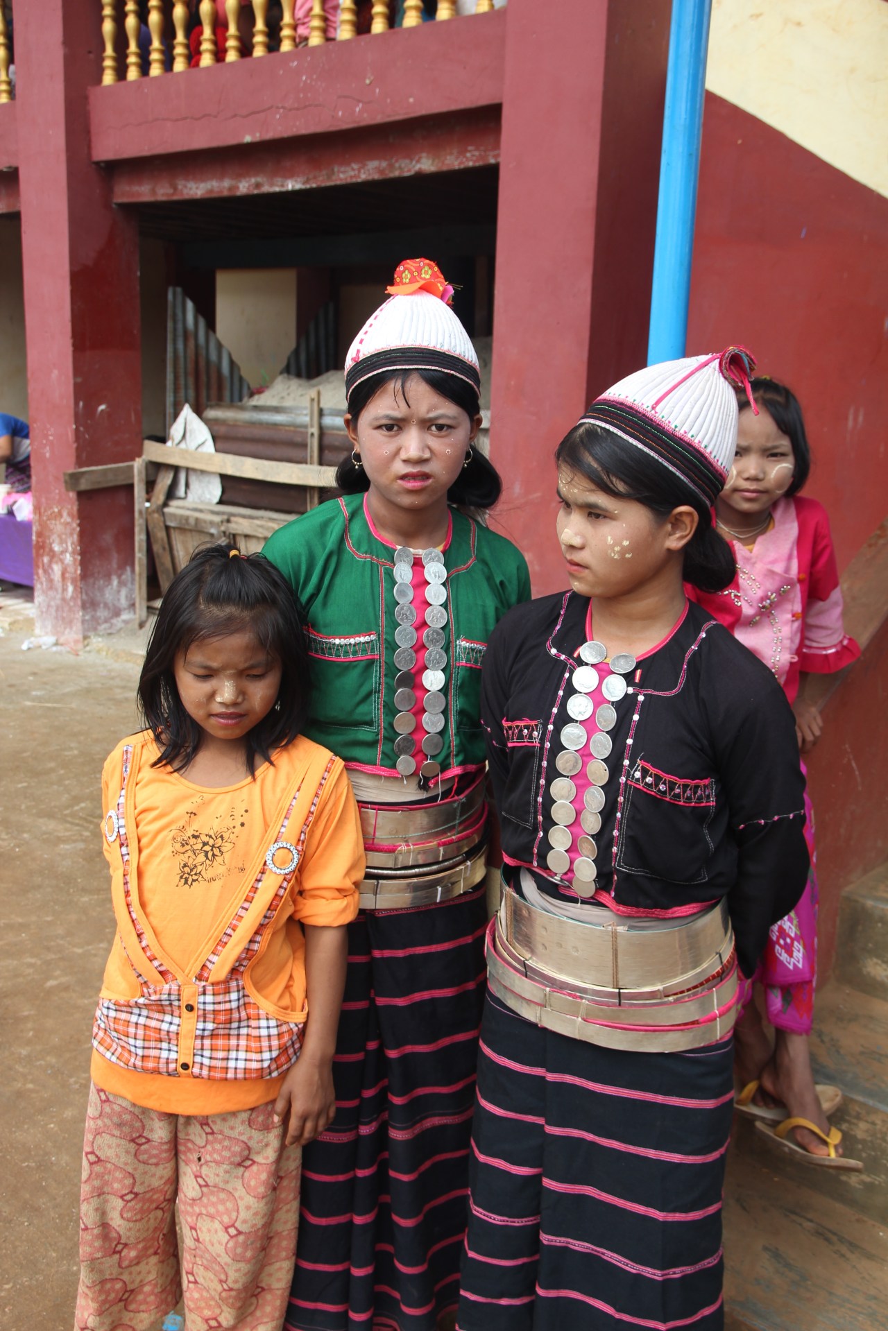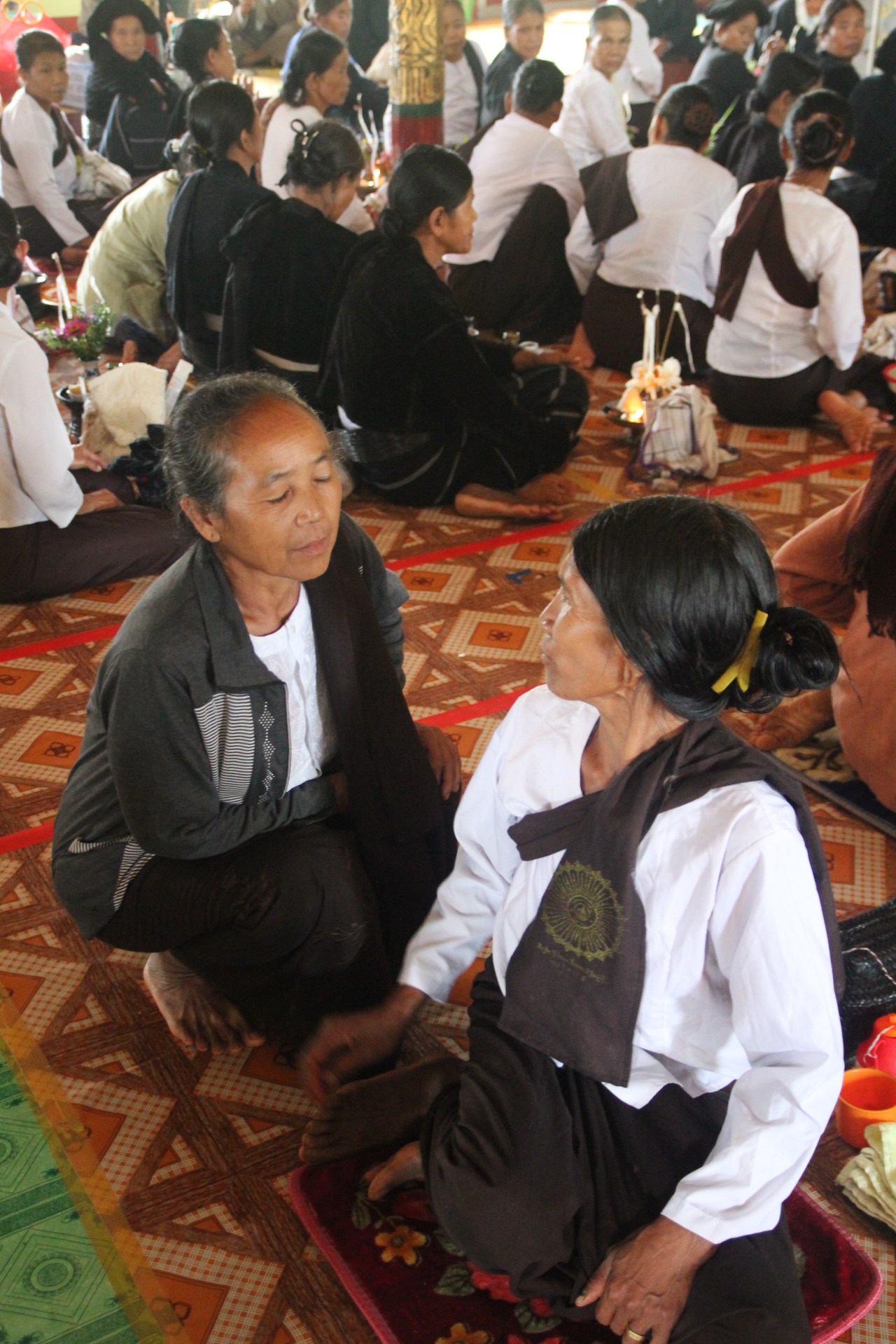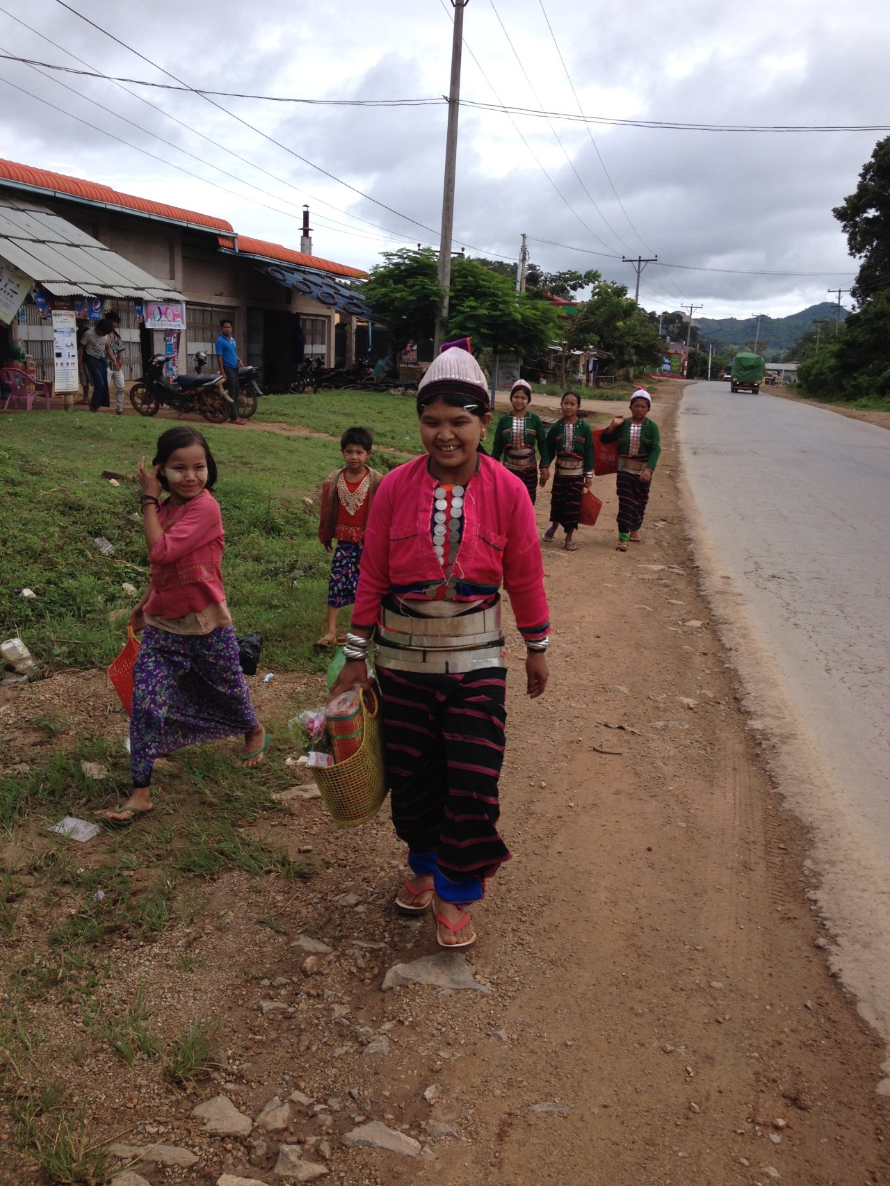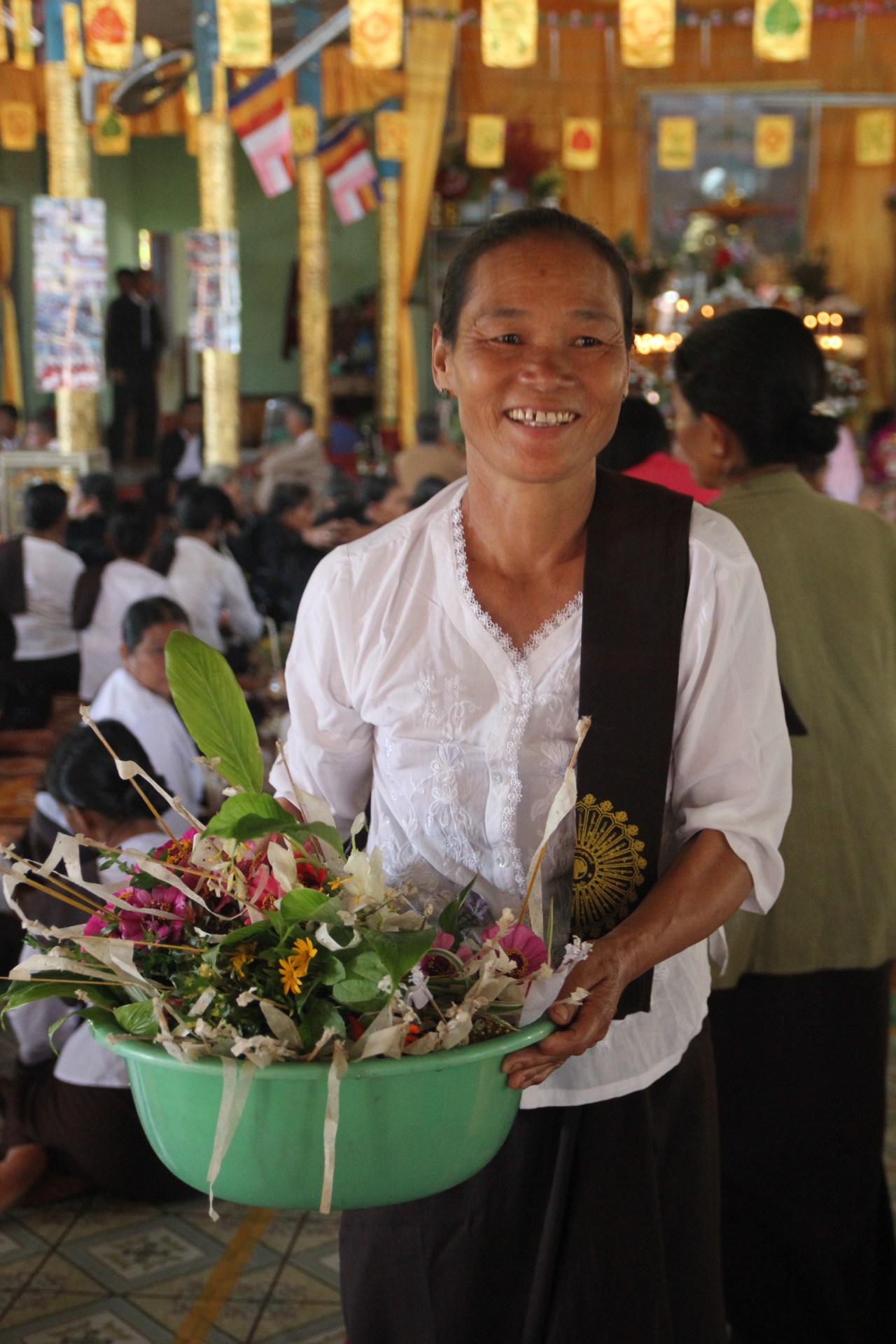Ces femmes marchant sur leurs tongs, sur les chemins de terre, le long de la route, promenaient leurs paniers remplis d’offrandes, de fleurs, et bien d’autres choses. Elles faisaient une sorte de convoi, toutes plus colorées les unes que les autres. Cela égayait le paysage et me permettait d’admirer leurs costumes. Elles portaient des gilets roses ou verts et surtout sur la poitrine au centre elles avaient une rangée de pièces d’argent. Sur les hanches, des cercles d’argent leur entouraient le ventre, et tenaient les sarongs marron, vert ou noirs. De larges rangées en plastique noir et de très jolis bracelets torsadés en argent agrémentaient leurs hanches ou leurs poignets. Un petit chapeau pointu brodé de blanc, certain orné d’un joli pompon rose, leur donnait un port de tête admirable. Leurs visages étaient maquillés de la crème blanche pour les protéger du soleil. Certaines avaient un rond plein blanc, d’autres des points ou bien des sortes de labyrinthe. Une décoration supplémentaire qui les rendait toutes différentes. Elles déambulaient tout sourire sur le bord de la route ne prenant pas en compte les dangers du trafic. Une jolie troupe pour un rendez spirituel.