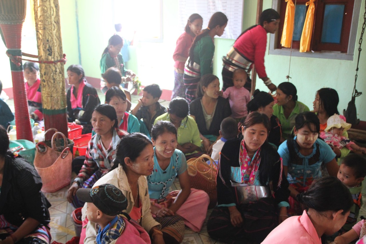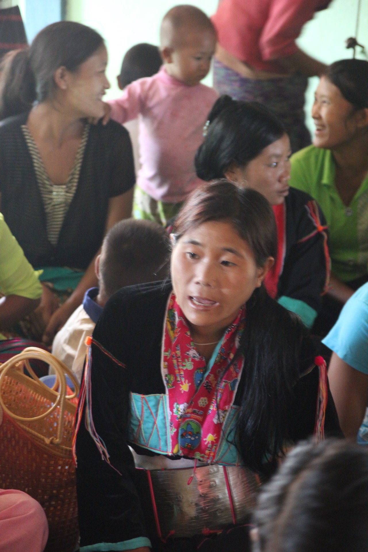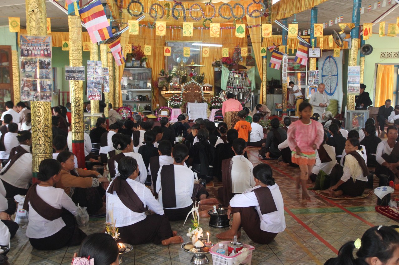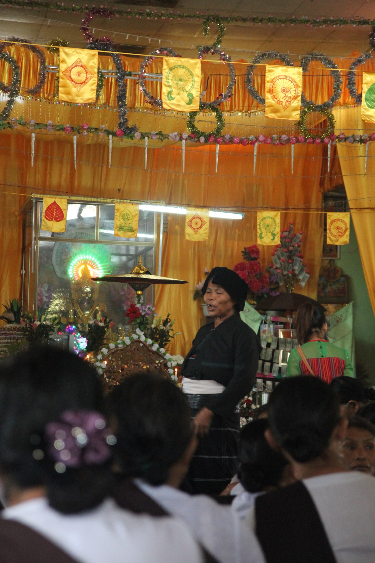 Sur la route, à 20 kms de Lashio, étant entre Lashio et Hsipaw nous sommes tombés nez à nez sur des femmes qui se rendaient à une cérémonie toute vêtues de magnifiques habits colorés de rose et avec des chapeaux brodés. Je n’ai pas pu résister à l’appel du large et filer rejoindre ces femmes à l’office du samedi..