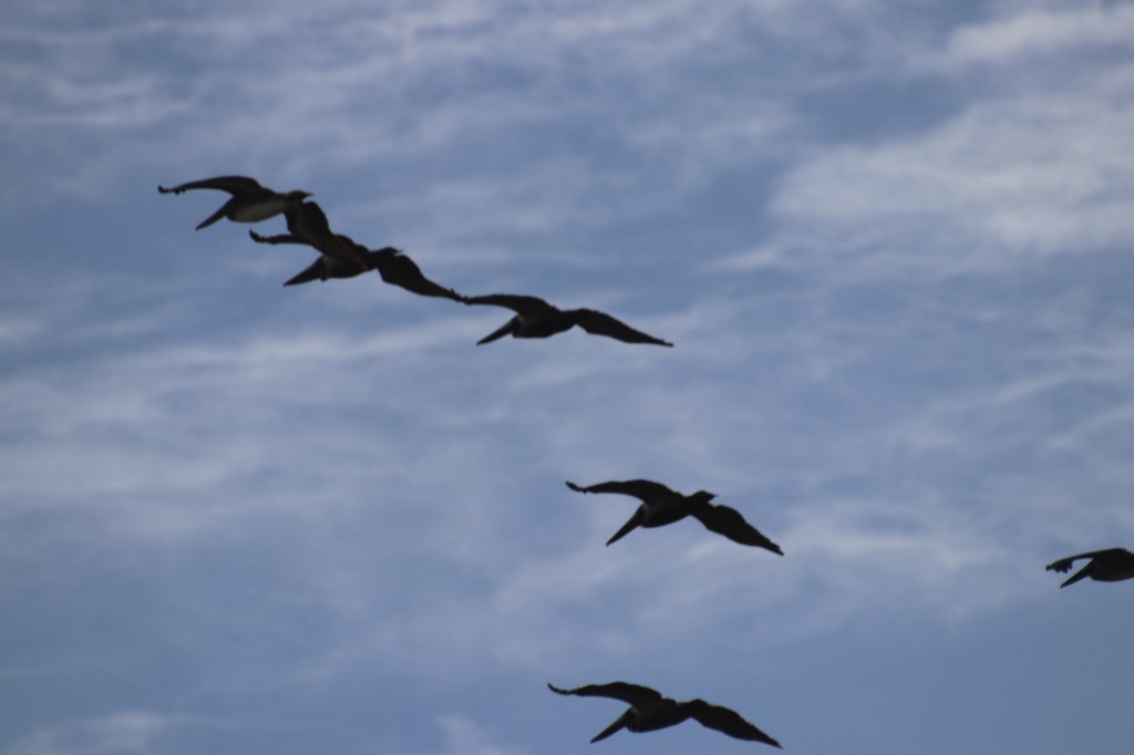Au-dessus de vos têtes des escadrilles de pélicans volent et ressemblent à une armée espionne. Ils volent dans un sens pour à contre-sens et vous épient. Ils forment de jolis dessins en forme de triangle ou bien de ligne droite ou encore de doux mélange de style comme des zigzags sorte de grands serpents aériens. Impressionnant à regarder. Voir perturbant !