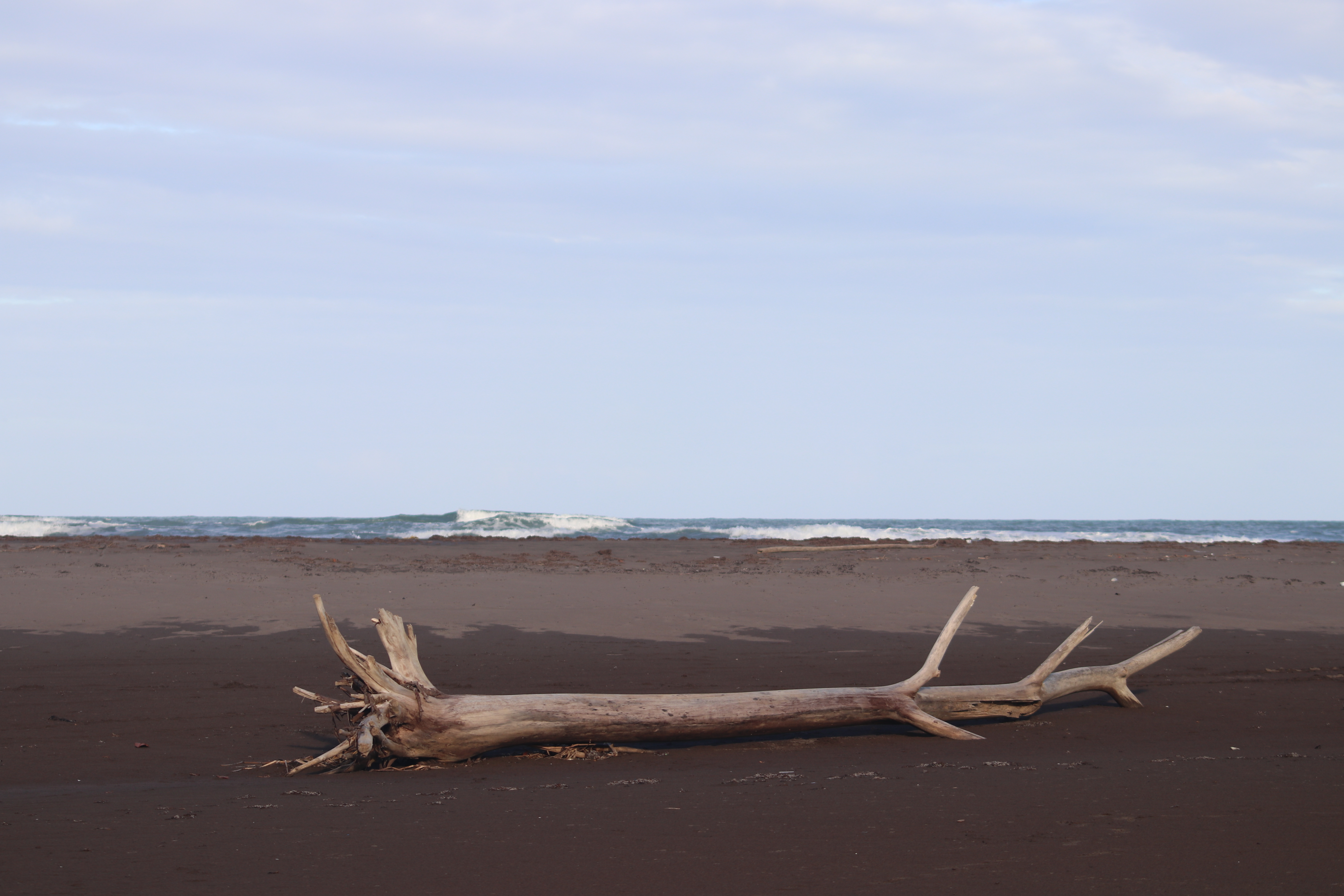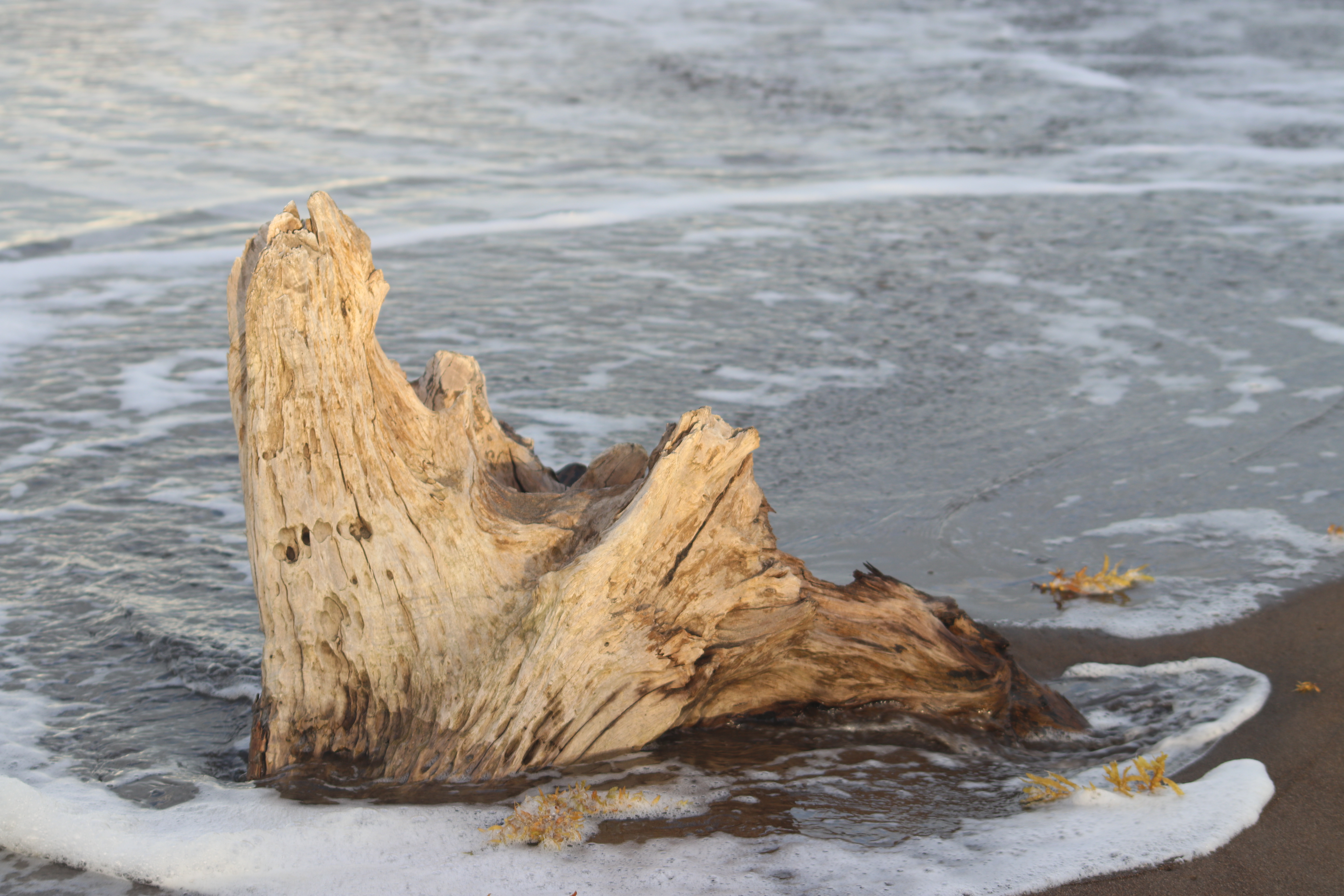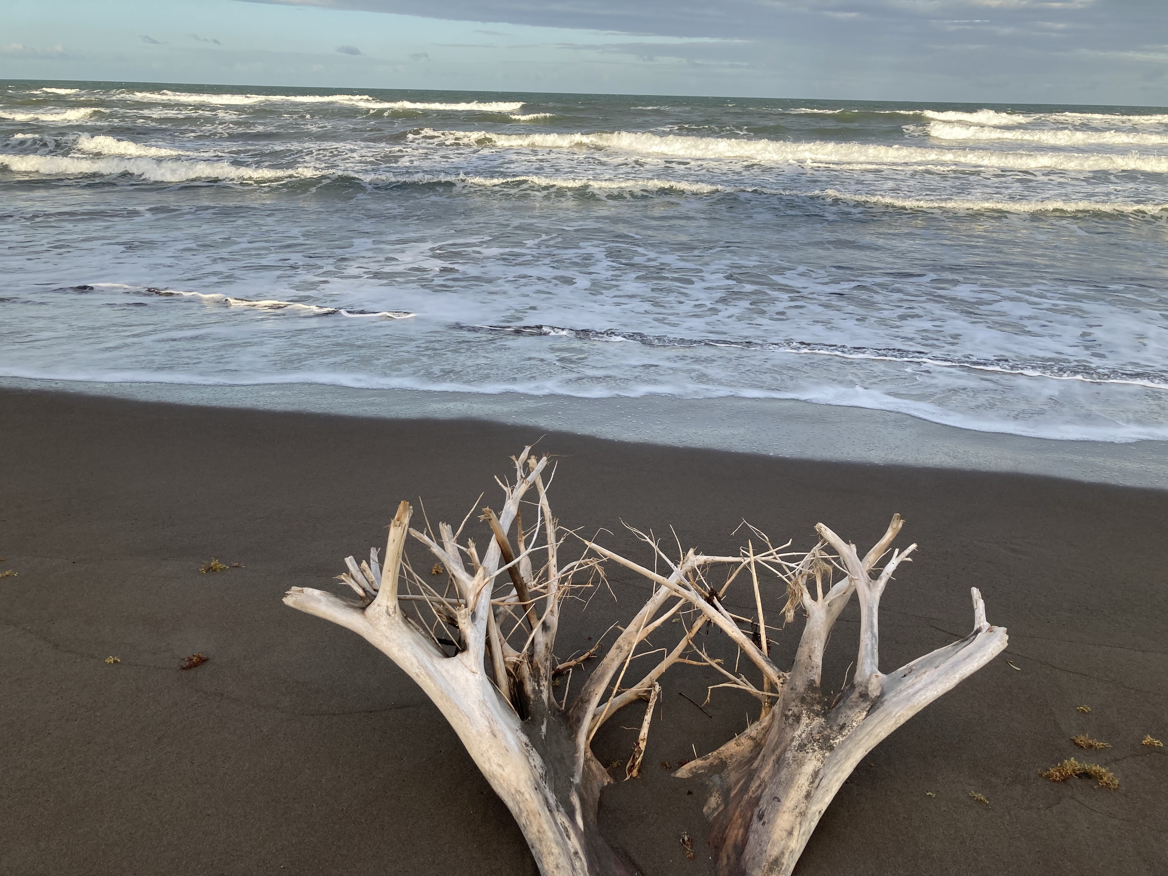 Des troncs d’arbres jonchent le sable, tantôt des racines à l’air et au vent, comme si elles cherchaient à accrocher le ciel ou à attraper les vagues. Parfois des forêts au sol se sont formées et vous ne savez où poser vos pieds ni où passer. C’est perturbant et effrayant. La mer retourne tout, dévaste tout et rien n’est pareil à chaque moment. Des troncs comme des proues de bateaux sont poussées par les vagues. Ou un bout de racine où les vagues s’enroulent pour former des paysages tristes.