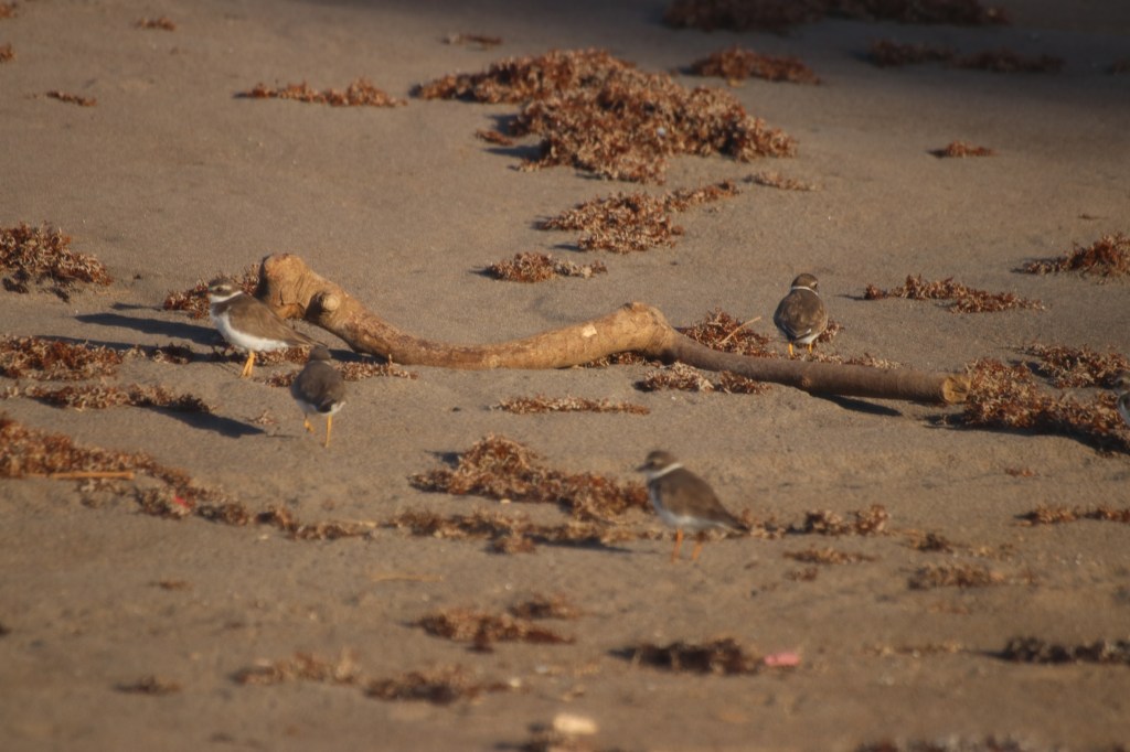 Et à vos pieds une cour de piafs tout petits qui picorent le sable à la recherche de crustacés ou de vers. C’est une danse d’oiseaux gris à collerette blanche autour du cou et des yeux avec un bout orange autour du bec.