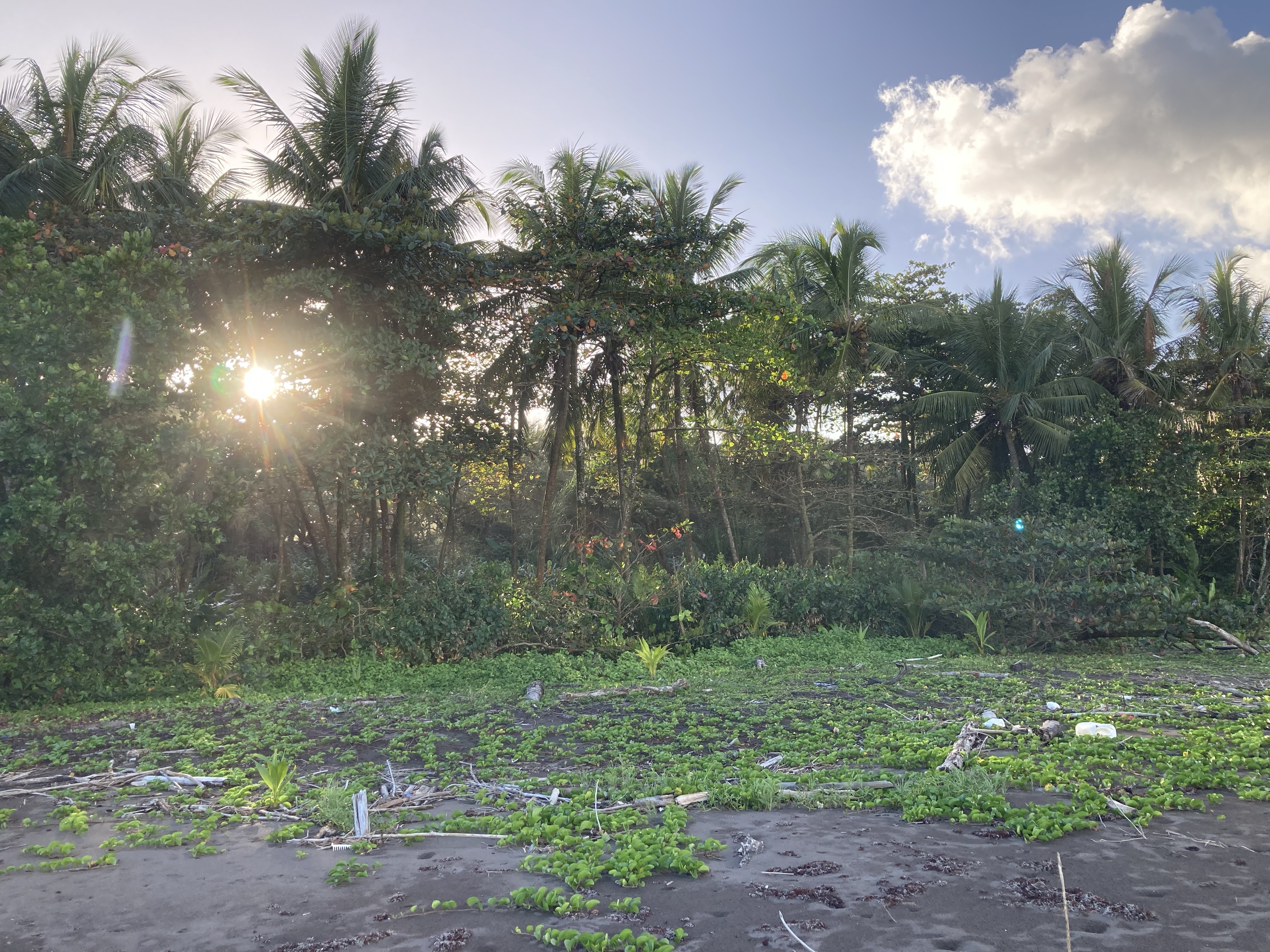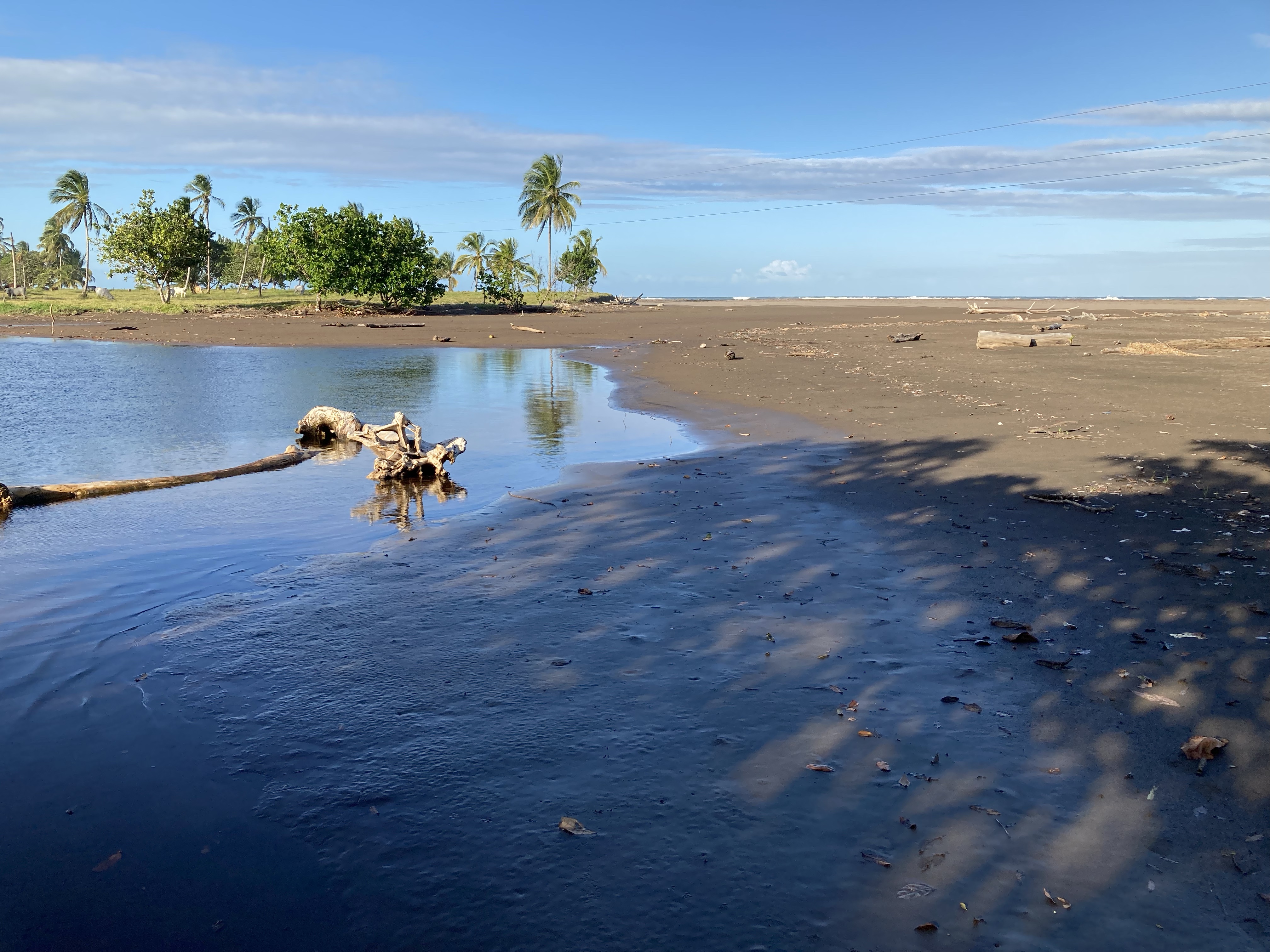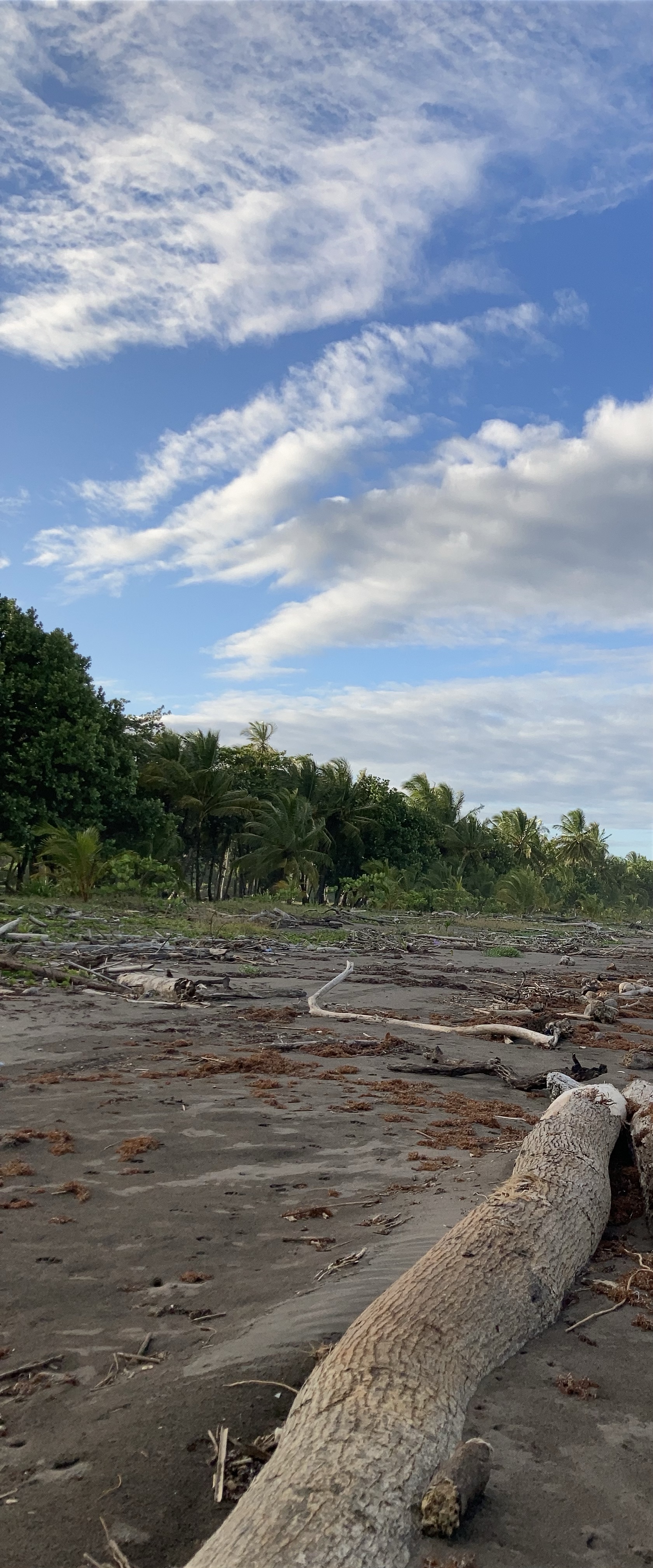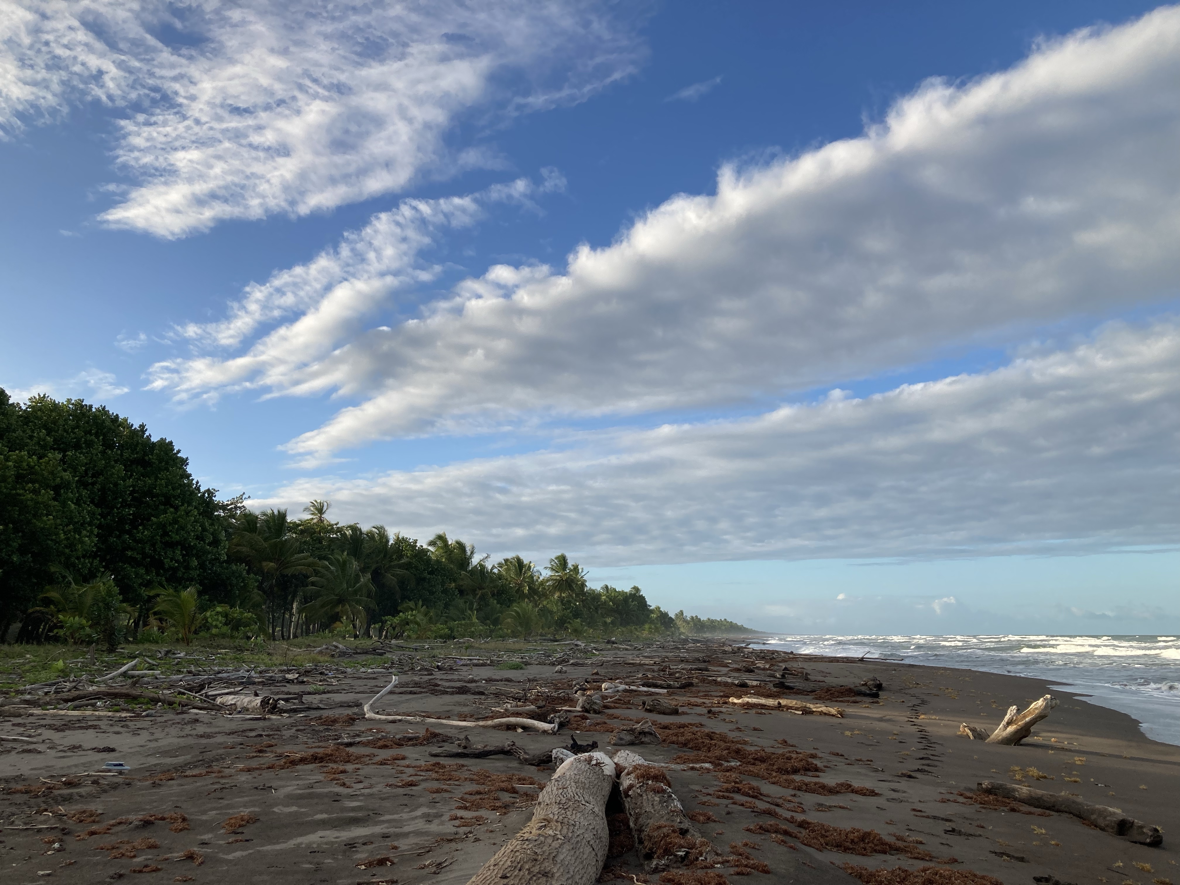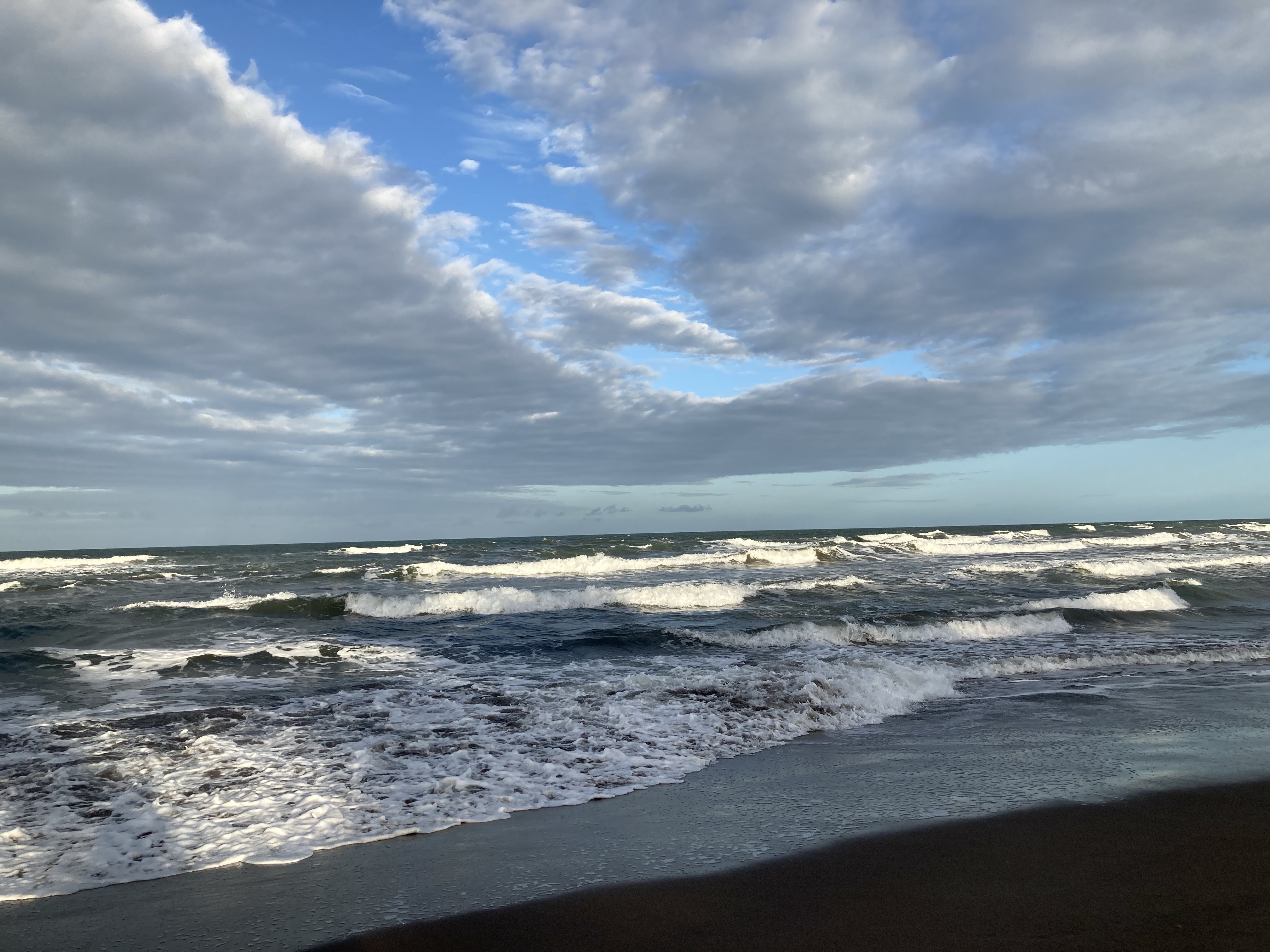 A gauche vous avez les champs de palmiers ou d’autres arbres inconnus de moi ; à droite le sable gris et la mer avec ses vagues qui roulent sur le sable et transportent tout ce que l’homme jette dans la mer.