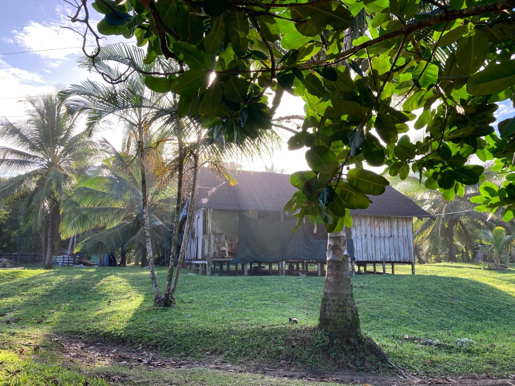 On découvre des maisons en bois avec des toits recouverts de branches de palmiers.