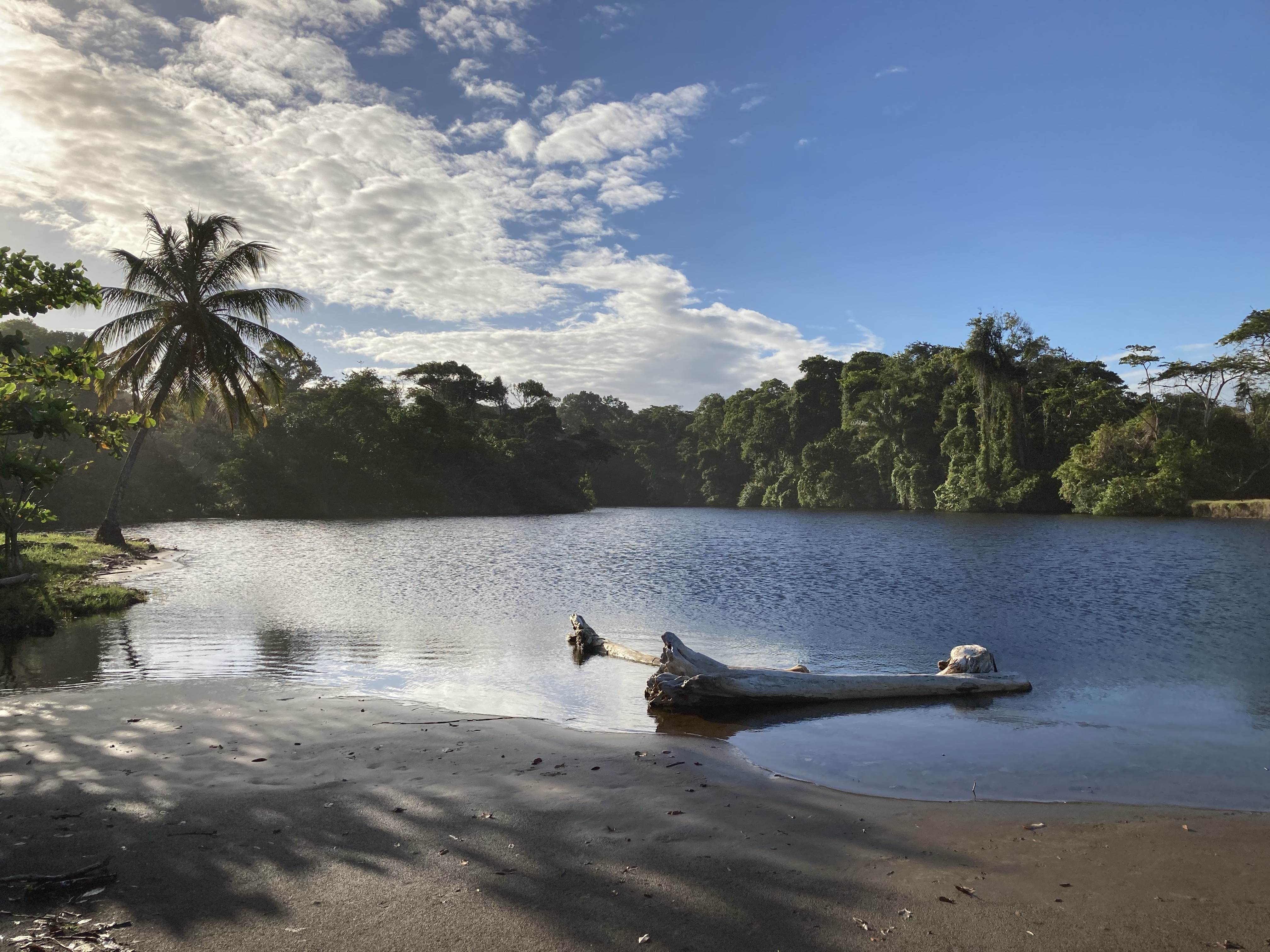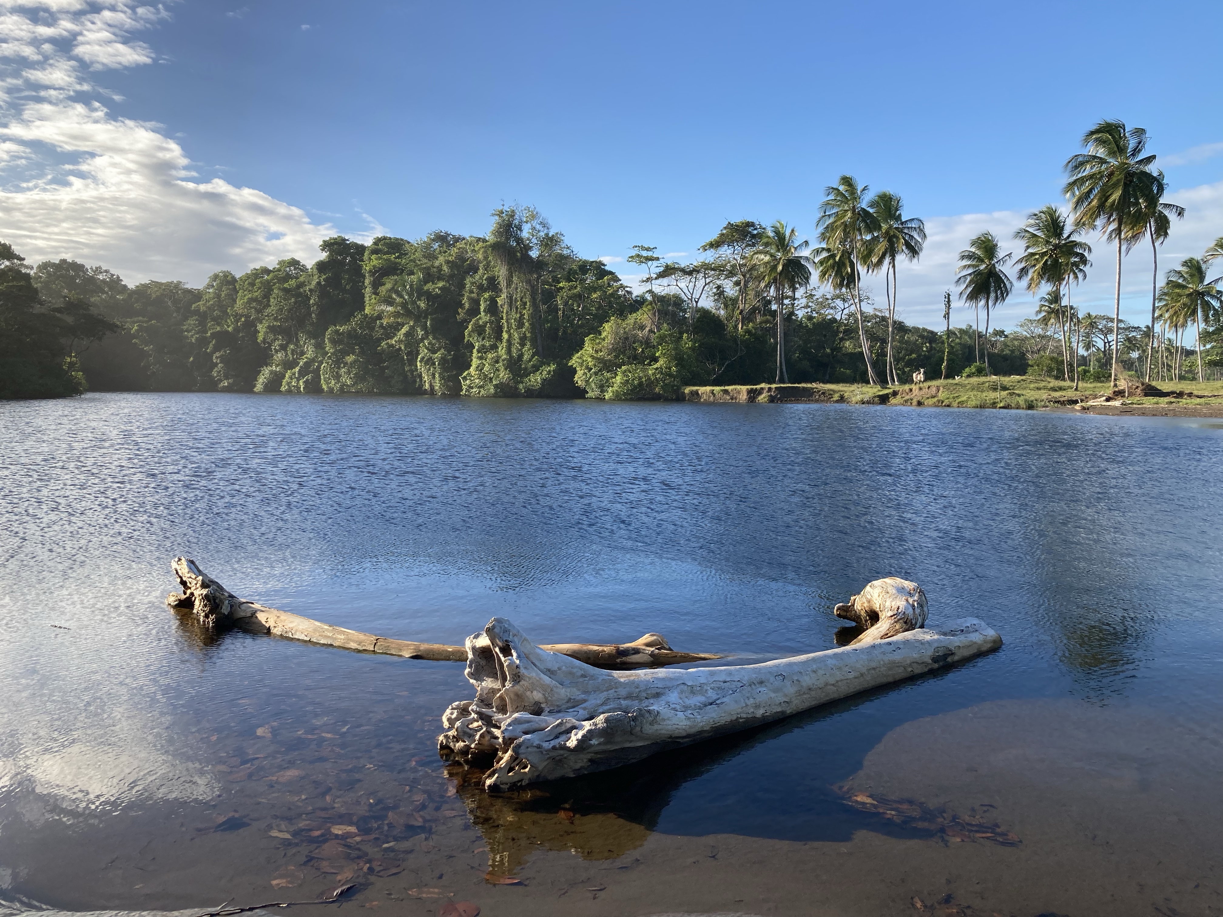 Le côté miracle de ce paysage c’est le reflet des nuages dans le lac, le bleu ciel dans le bleu du lac, les vaguelettes et les mouvements de l’eau et surtout ce tronc d’arbre blanc qui rend le décor paradisiaque comme au début du monde. Un calme olympien vous entoure et plus rien ne vous atteint. La mangrove vous entoure avec au fond les vaches qui paissent dans un pré et vous regardent comme si vous sortiez d’un autre monde inconnu d’elles.