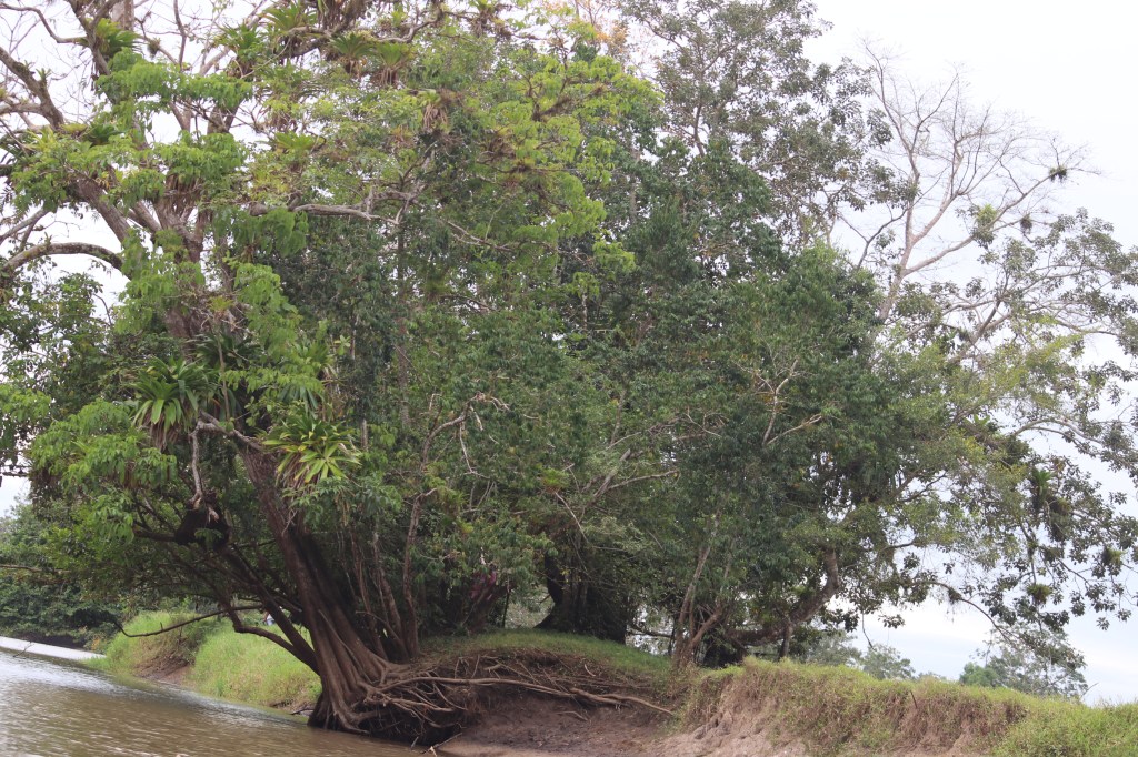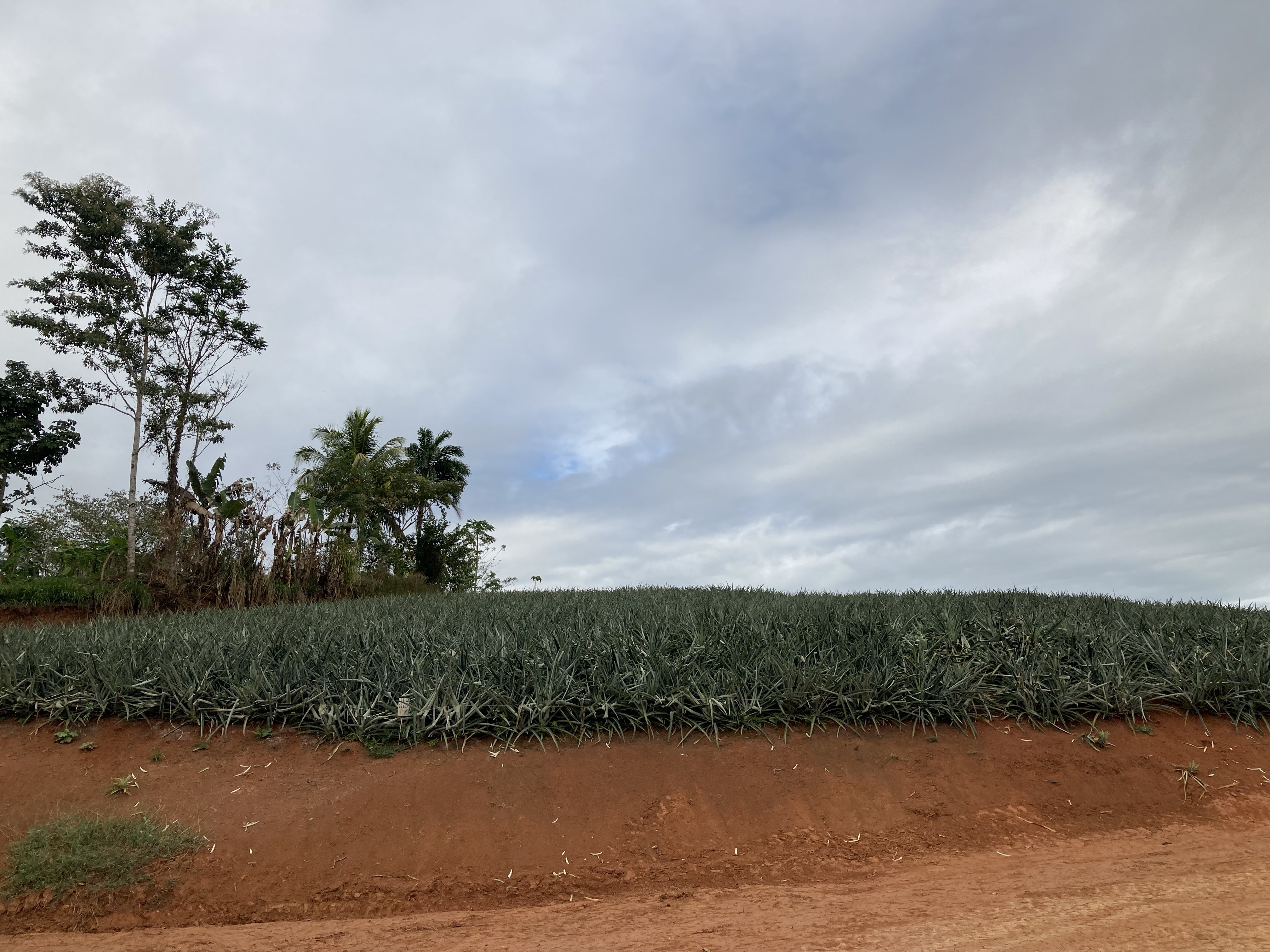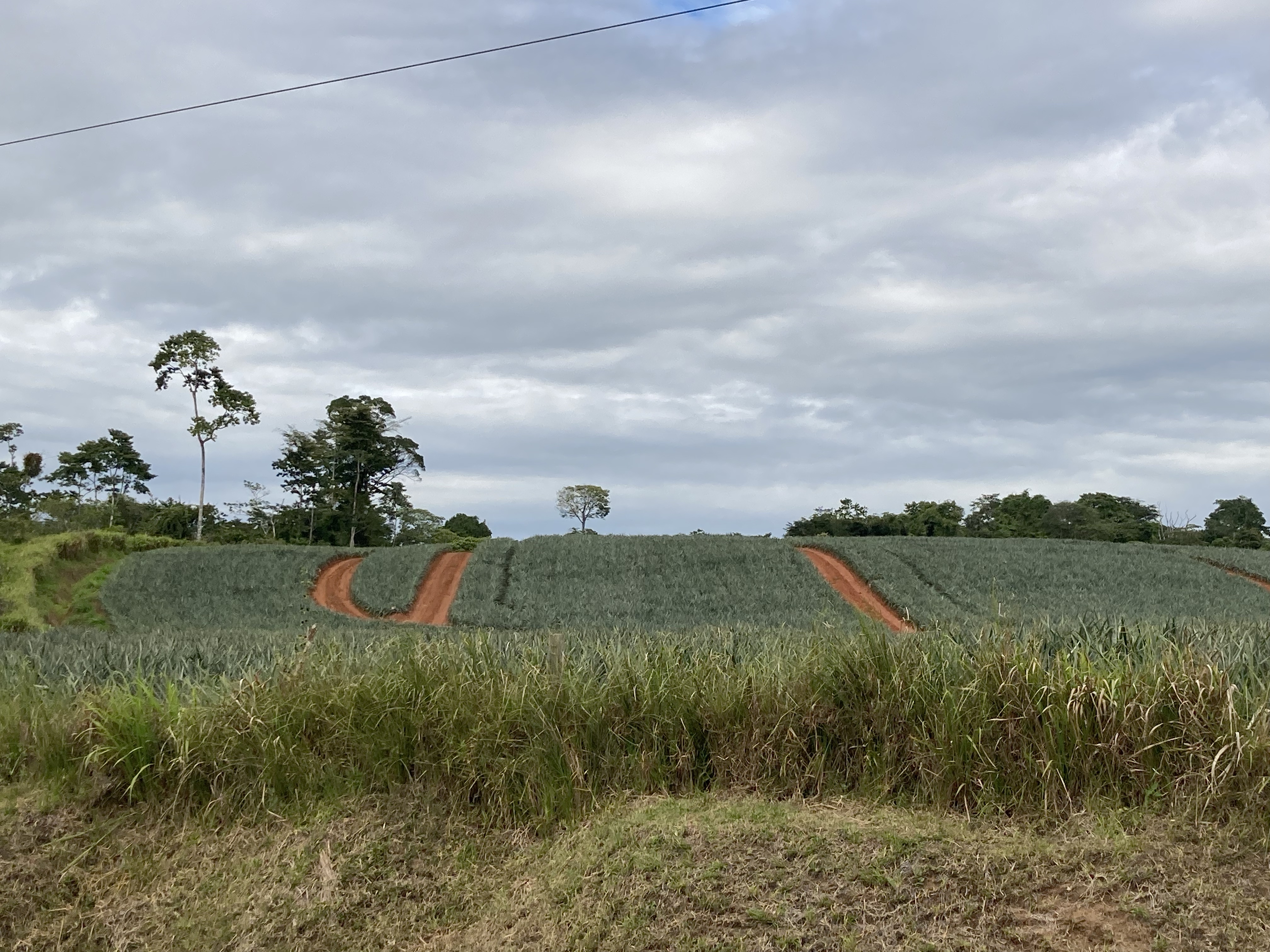 Le lendemain départ à 7h du matin par des routes non asphaltées avec Yves de l’hôtel L’Etoile Celeste et nous sommes partis pour le Cano Negro à travers des champs d’ananas, plantés bien serrés, sur une terre ferrugineuse juste incroyable. Ces champs d’ananas érodent la terre. Passé des villages pour arriver enfin sur le fleuve du Cano Negro.
