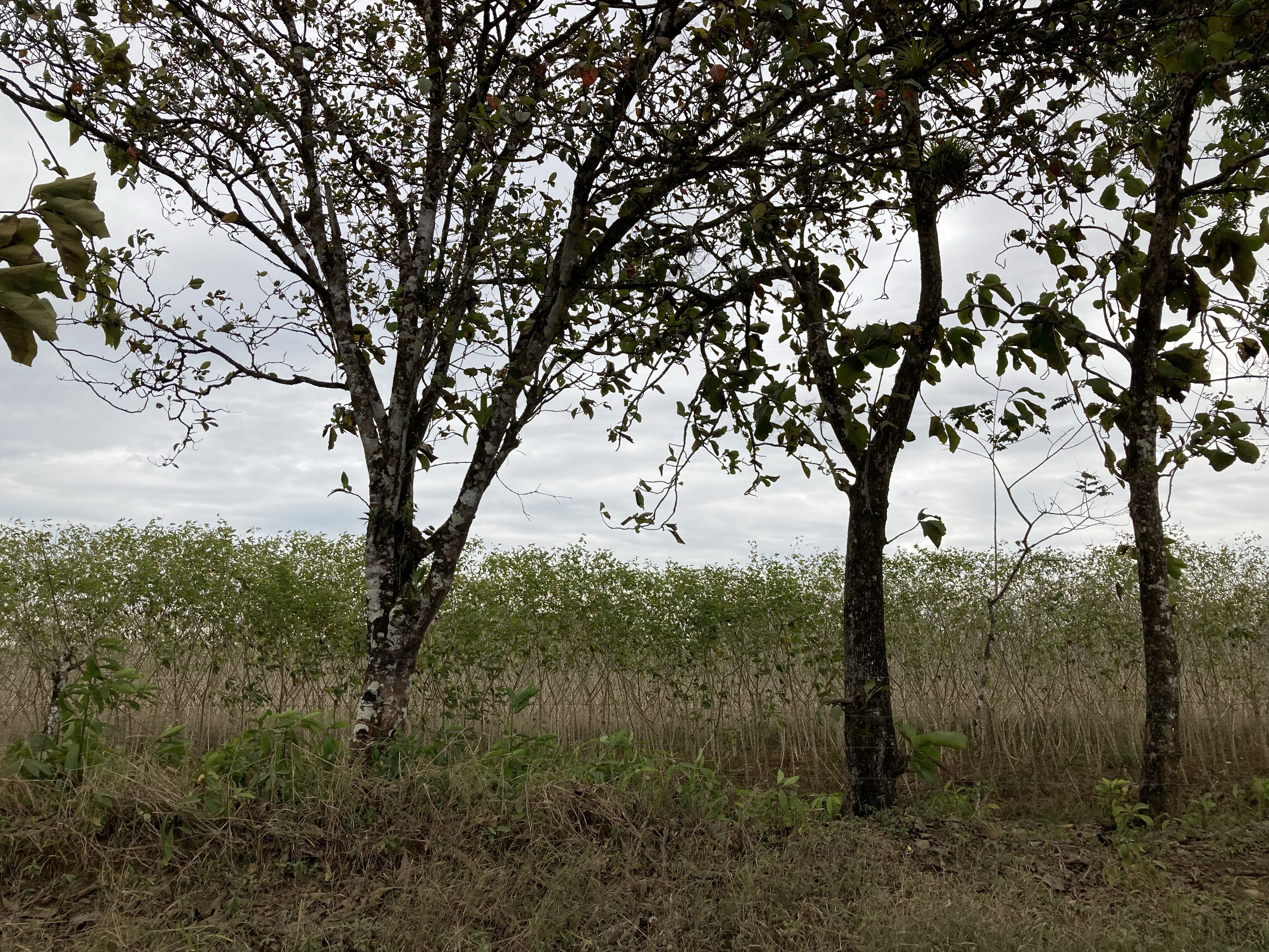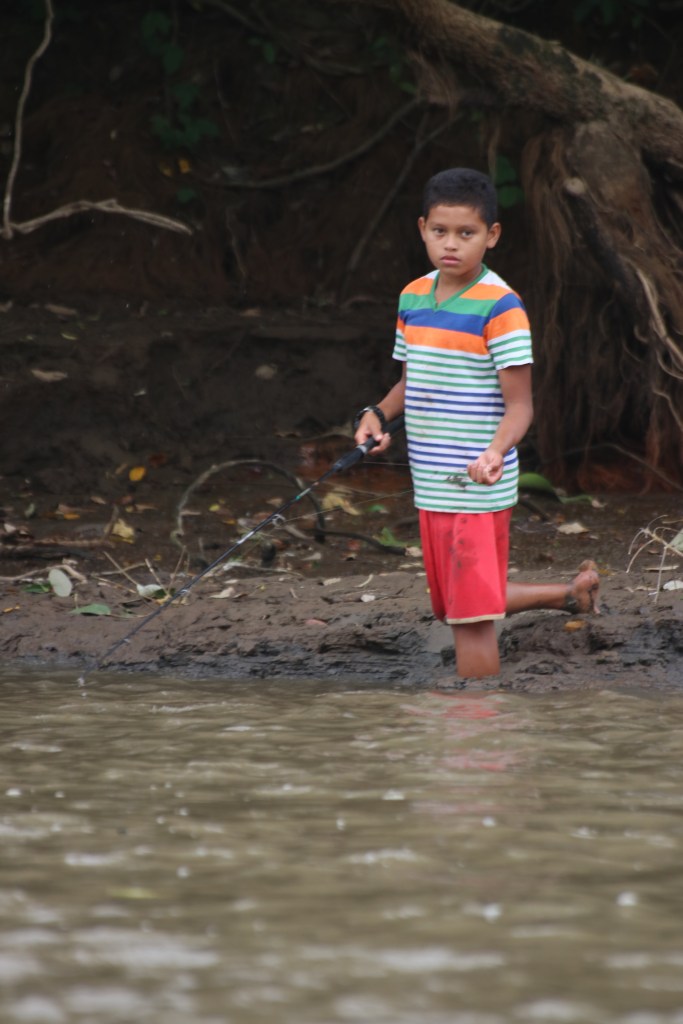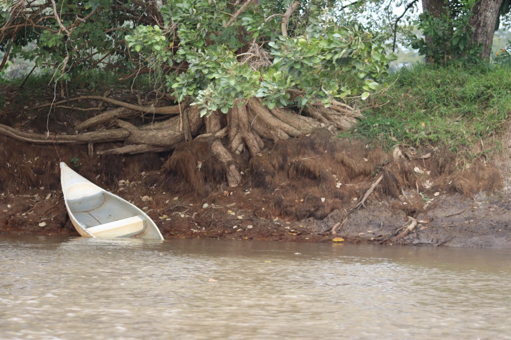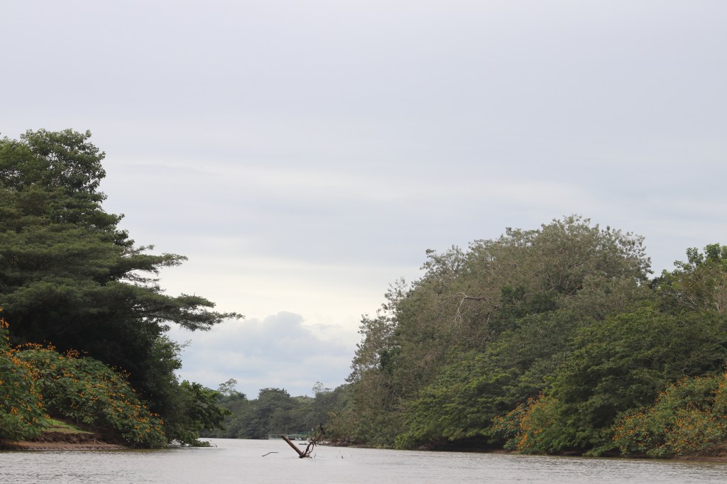 Le lendemain départ à 7h du matin par des routes non asphaltées avec Yves de l’hôtel L’Etoile Celeste et nous sommes partis pour le Cano Negro à travers des champs d’ananas, plantés bien serrés, sur une terre ferrugineuse juste incroyable. Ces champs d’ananas érodent la terre. Passé des villages pour arriver enfin sur le fleuve du Cano Negro.