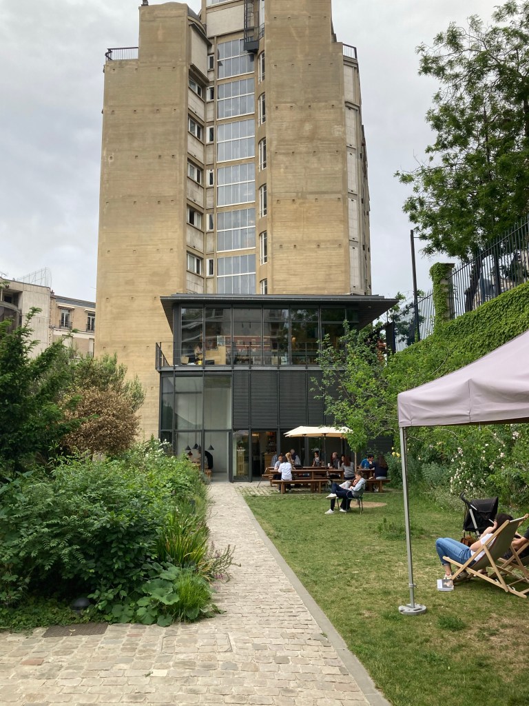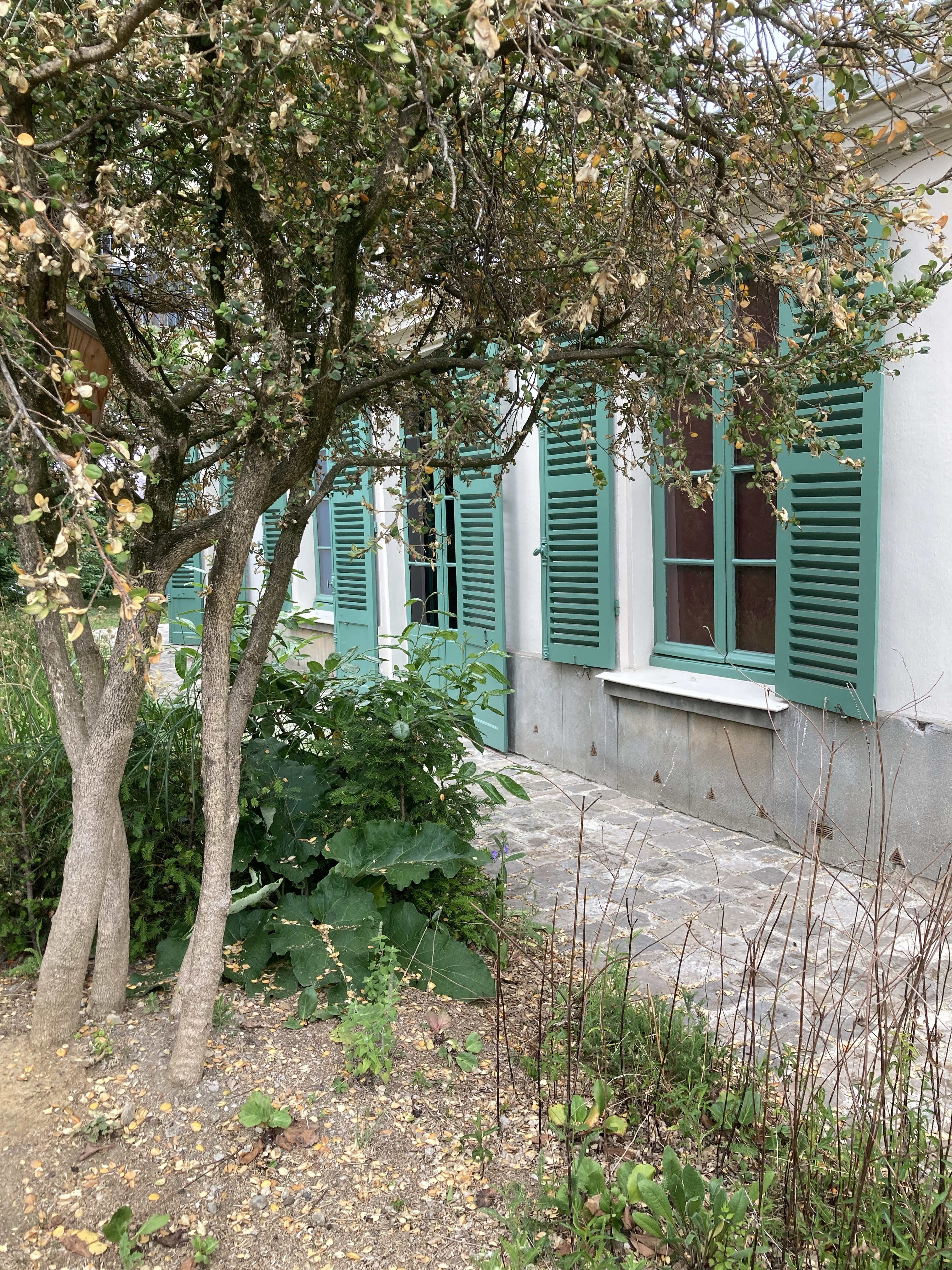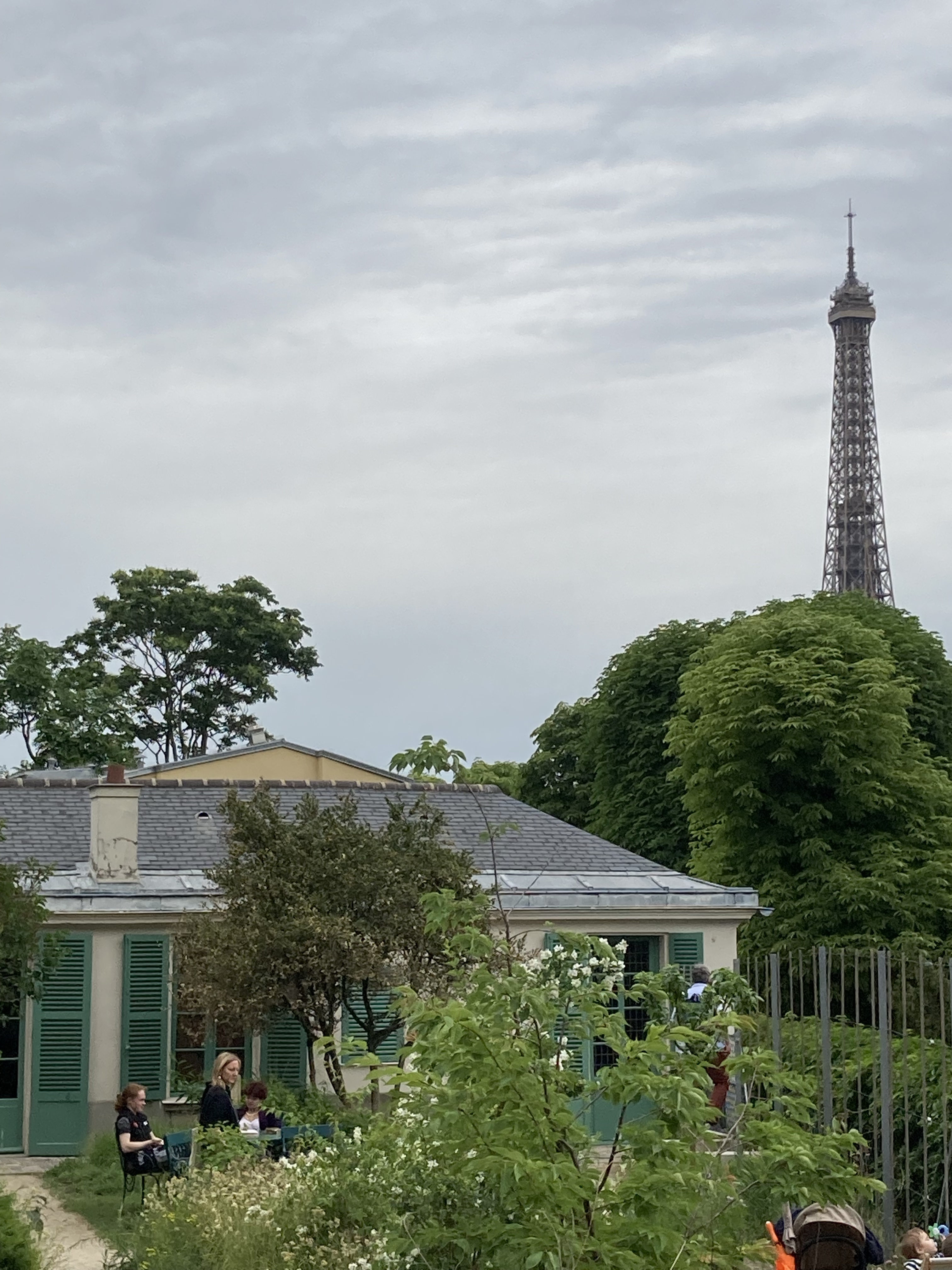 On descend des escaliers et l’on découvre un jardin aux herbes folles avec une vue sur la tour Eiffel impressionnant. Au bout du jardin on peut apercevoir, derrière des arbres, une maison aux volets verts, implantée dans toute la largeur du terrain.