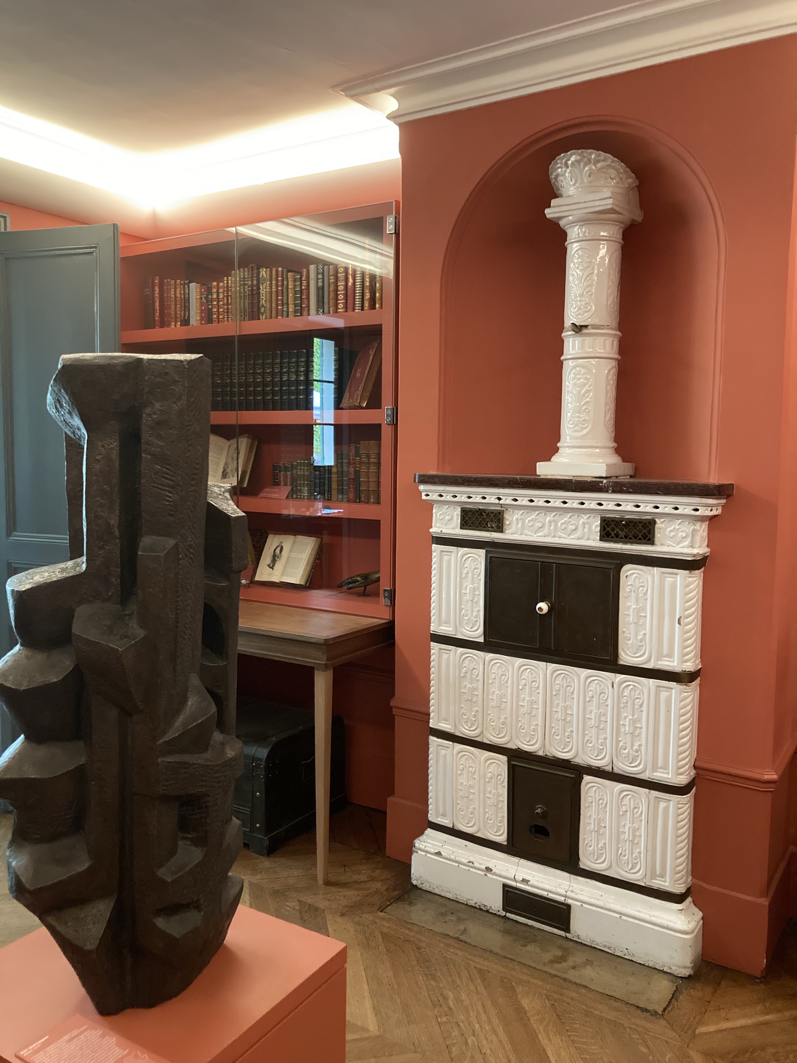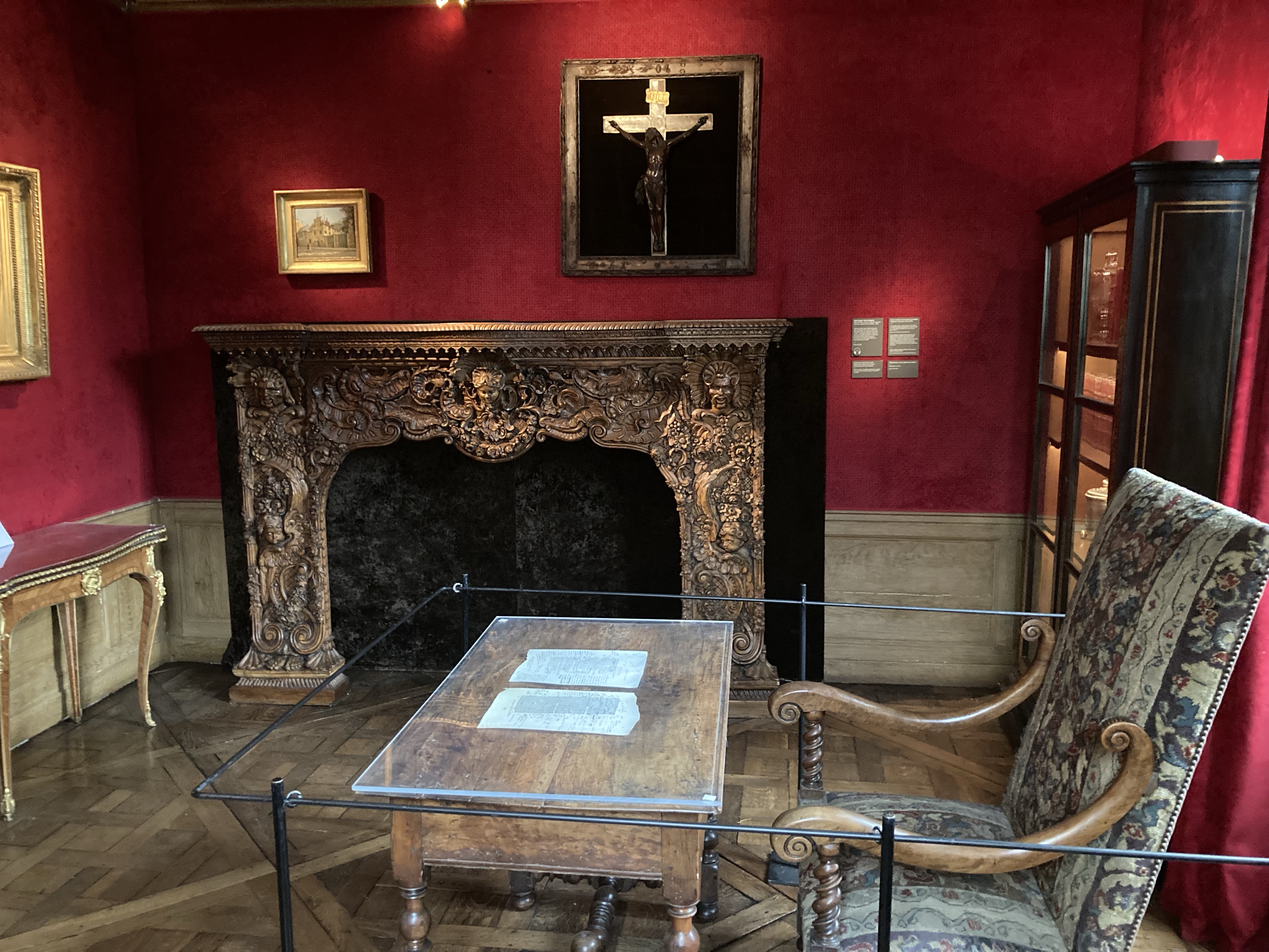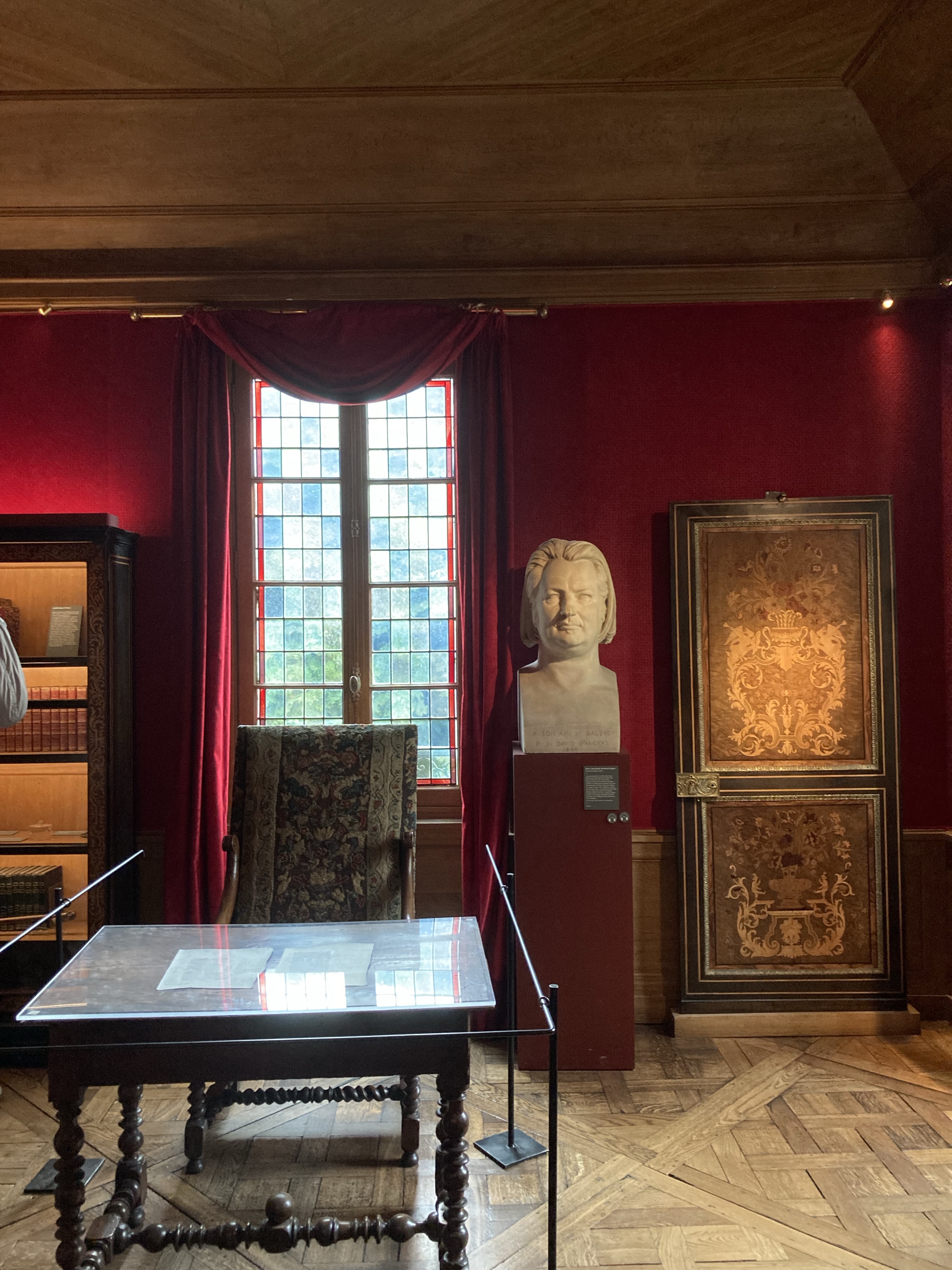 Mais pour moi le clou de la visite c’est le bureau de Balzac « prison » ou « cellule » comme il le disait lui-même, où il corrigea « La divine comédie ». Cette pièce aux tentures rouges est très austère et l’énorme cheminée décorée lourdement en impose. Le bureau et le fauteuil se détachent et une porte en deux morceaux en marqueterie attire l’œil. Des objets personnels comme son sceau ou bien un bijou de sa femme Mme Hanska se trouvent dans la bibliothèque avec des livres de Rousseau. La pièce est sombre et étouffante.