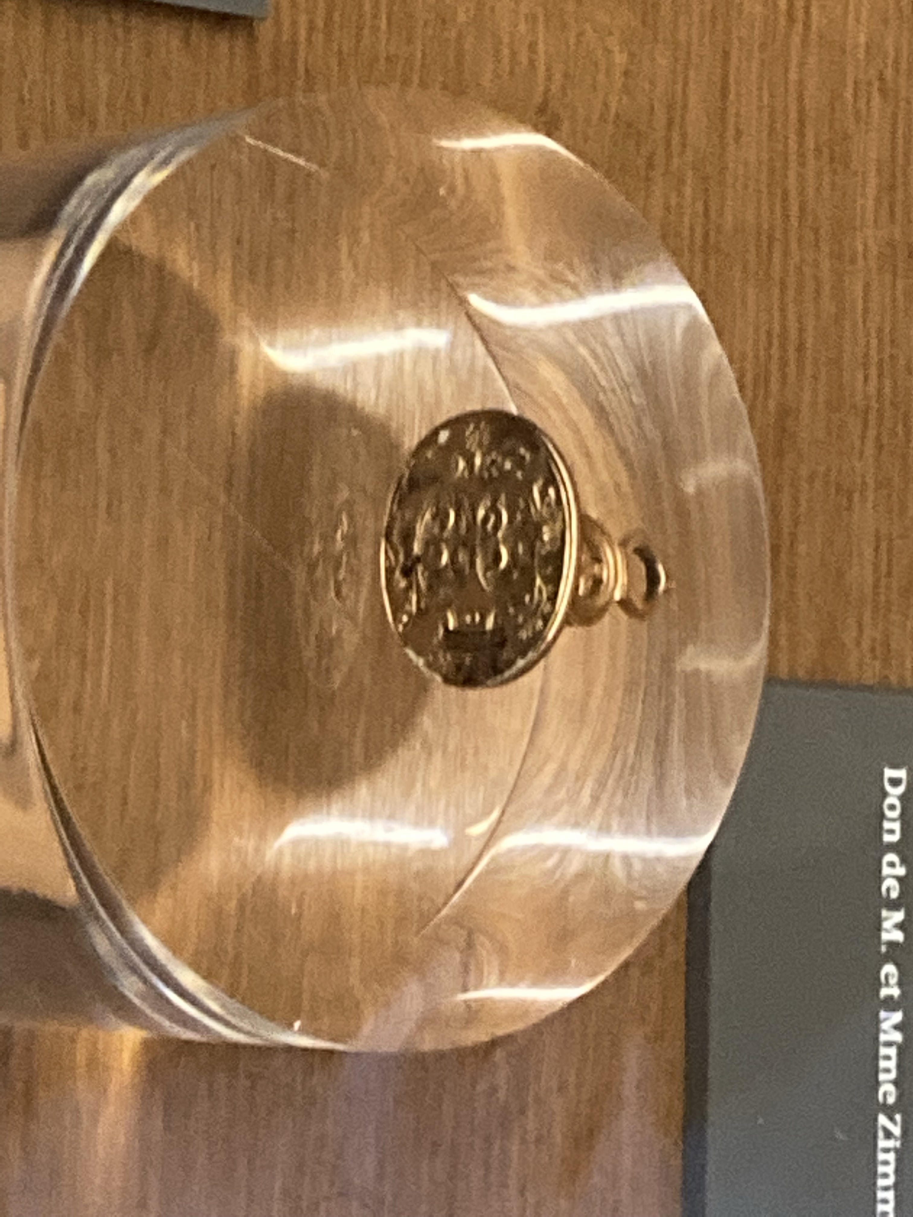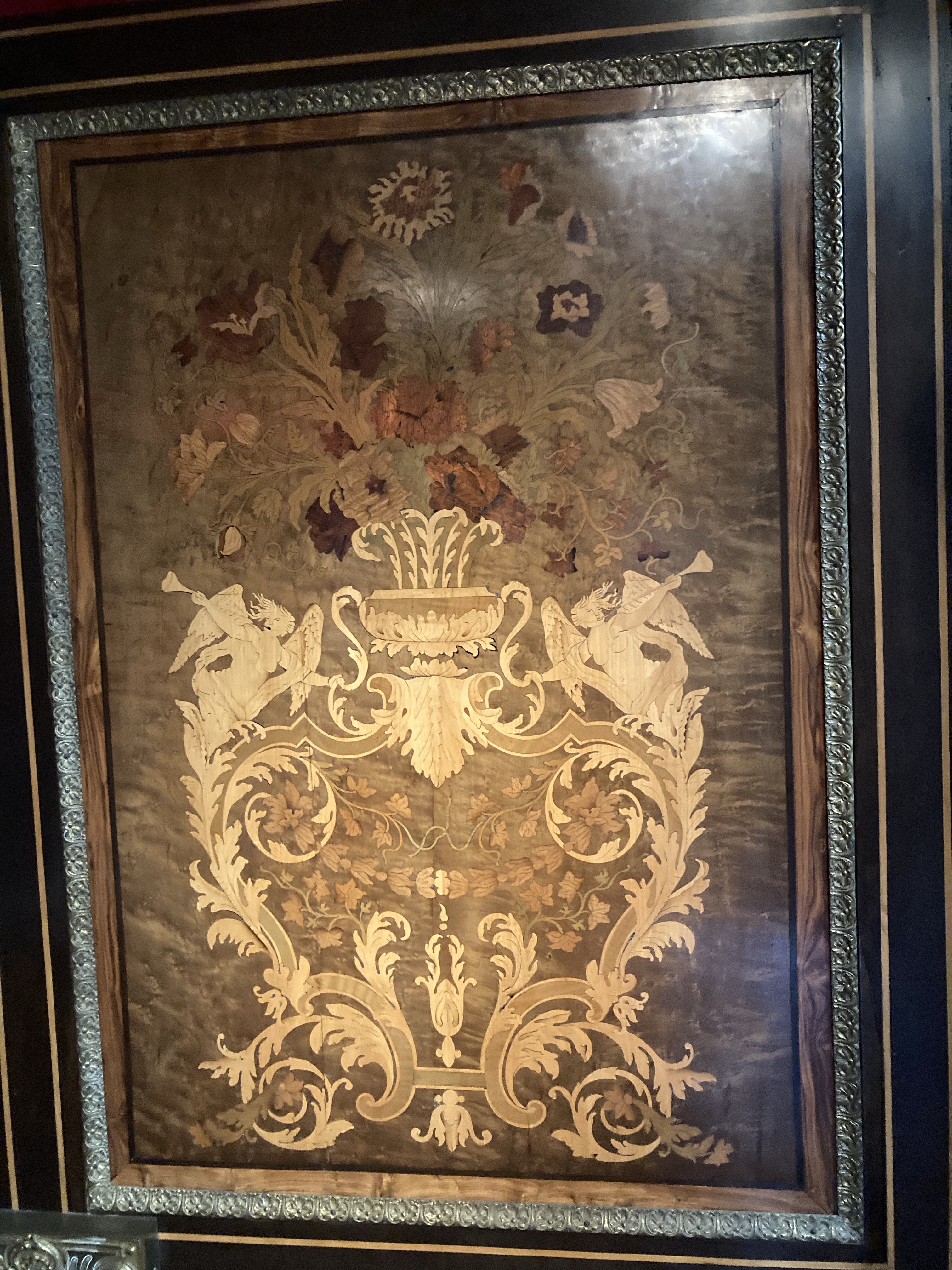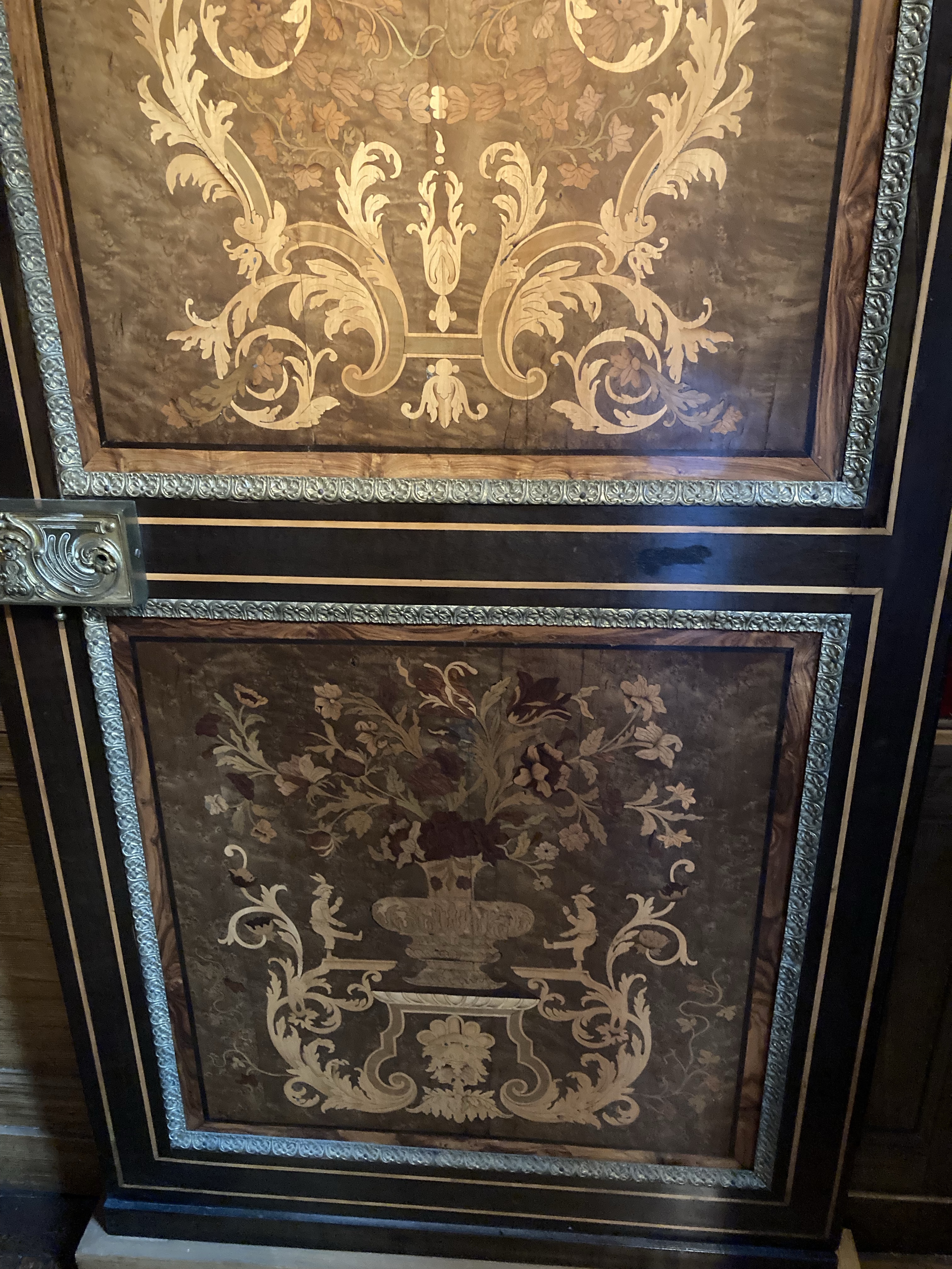 Mais pour moi le clou de la visite c’est le bureau de Balzac « prison » ou « cellule » comme il le disait lui-même, où il corrigea « La divine comédie ». Cette pièce aux tentures rouges est très austère et l’énorme cheminée décorée lourdement en impose. Le bureau et le fauteuil se détachent et une porte en deux morceaux en marqueterie attire l’œil. Des objets personnels comme son sceau ou bien un bijou de sa femme Mme Hanska se trouvent dans la bibliothèque avec des livres de Rousseau. La pièce est sombre et étouffante.