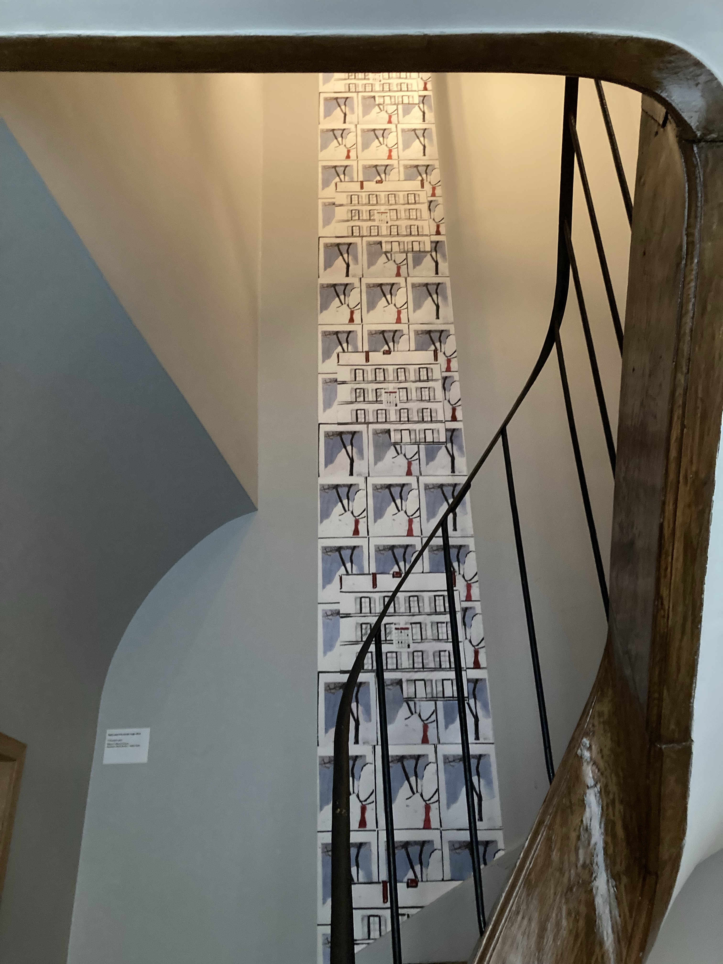 Par un escalier on peut descendre au rez-de-chaussée de la maison pour y trouver une exposition des œuvres de Pierre Buroglio sur le thème de la maison et aussi des fonds sur Balzac.