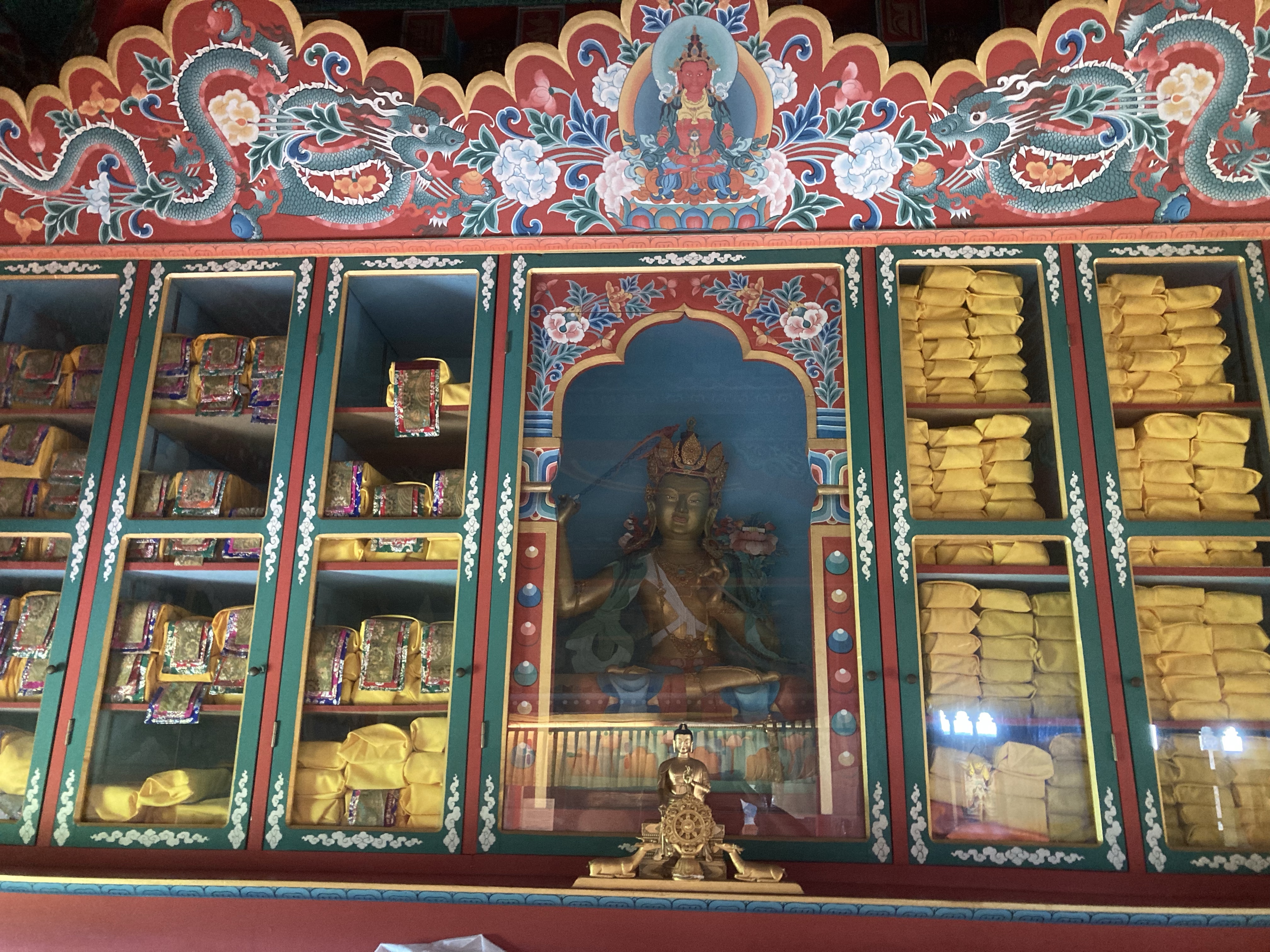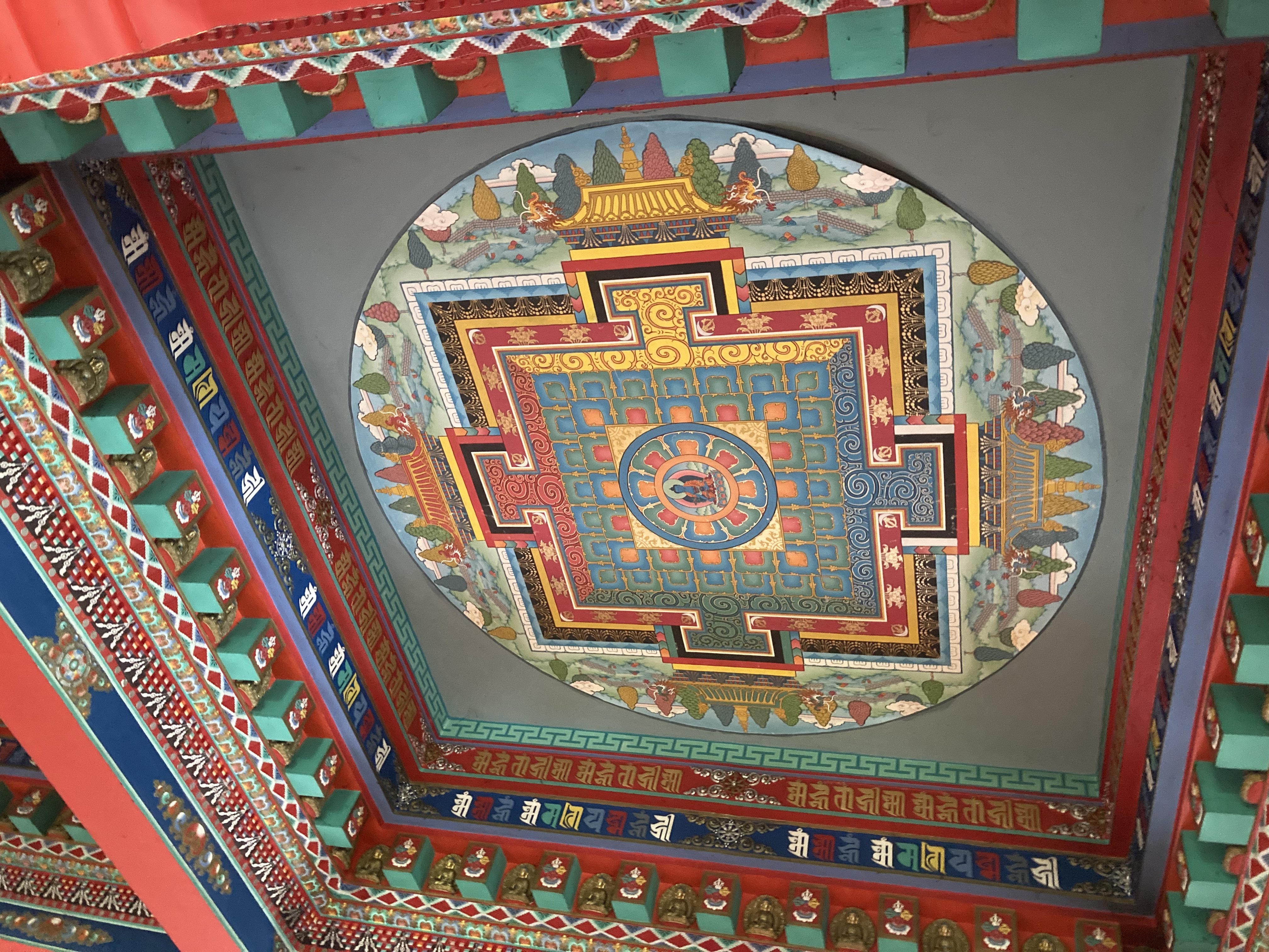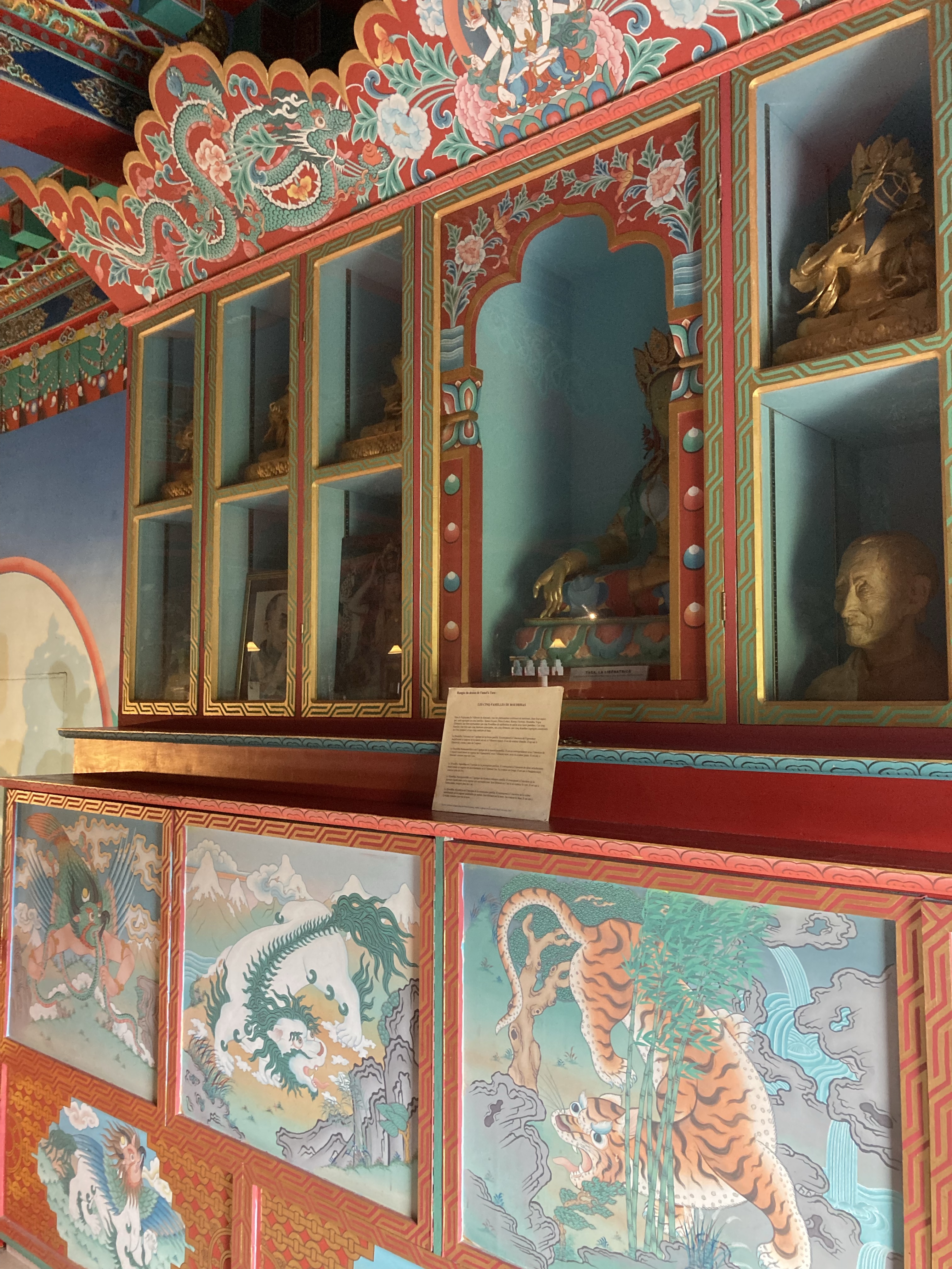 Un grand escalier peint en blanc vous mène au temple et à son intérieur tout coloré. Vous êtes alors plongé dans un monde de mandalas, de déités immenses, de drapeaux, d’animaux mythiques et il ne vous manque plus que le son des prières ou du gong ou des cymbales pour vous sentir au Tibet. Mais en fait vous entrez dans le monde du silence et des pas des visiteurs. Car point de prières, ni de bruit, pas de moines, vous frôlant, ni de rires de moinillons, ni de sons de portable ni de débats bruyants . Le silence et le silence ! Lieu perdant de sa spiritualité et d’une vie grouillante comme on les trouve au Bhoutan et au Tibet.
