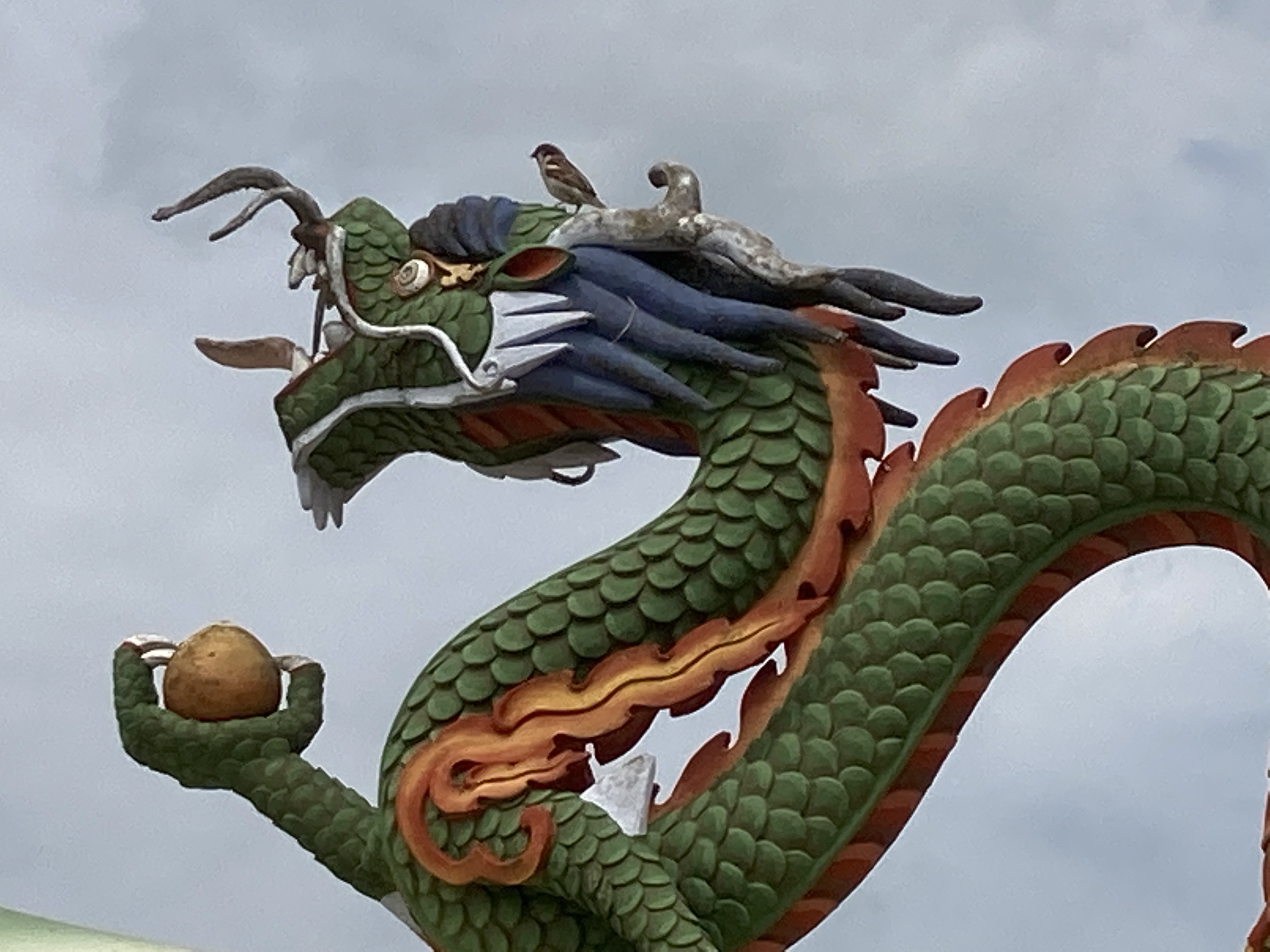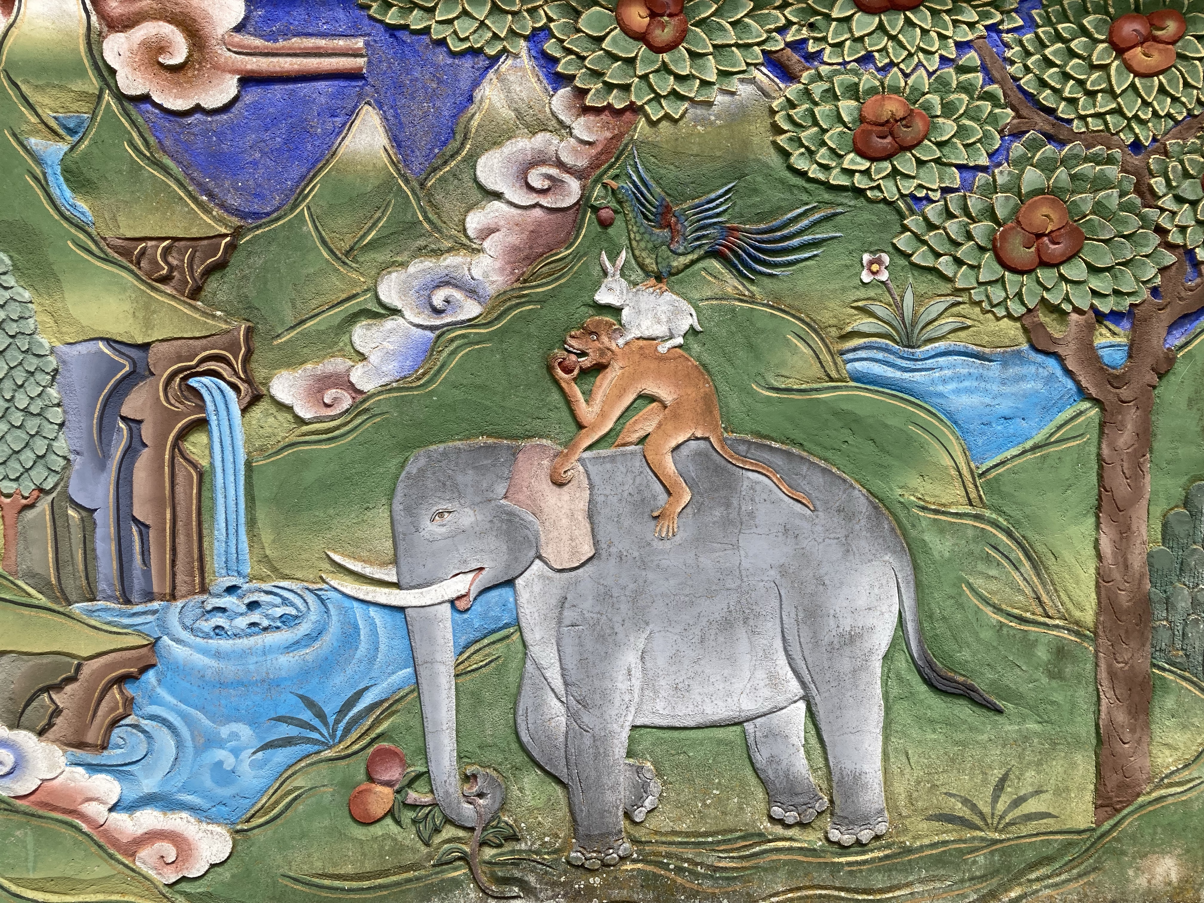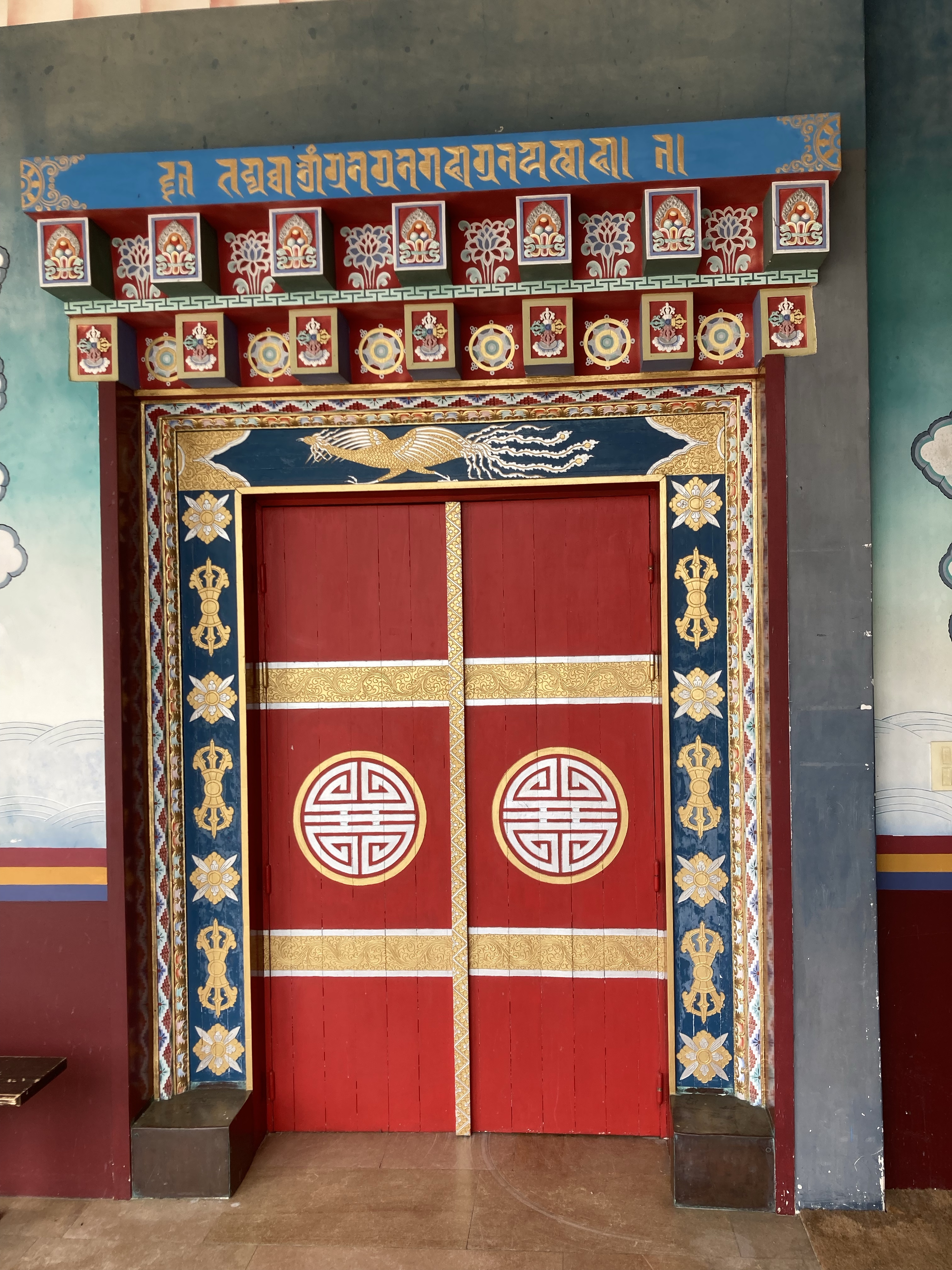 Un grand escalier peint en blanc vous mène au temple et à son intérieur tout coloré. Vous êtes alors plongé dans un monde de mandalas, de déités immenses, de drapeaux, d’animaux mythiques et il ne vous manque plus que le son des prières ou du gong ou des cymbales pour vous sentir au Tibet. Mais en fait vous entrez dans le monde du silence et des pas des visiteurs. Car point de prières, ni de bruit, pas de moines, vous frôlant, ni de rires de moinillons, ni de sons de portable ni de débats bruyants . Le silence et le silence ! Lieu perdant de sa spiritualité et d’une vie grouillante comme on les trouve au Bhoutan et au Tibet.