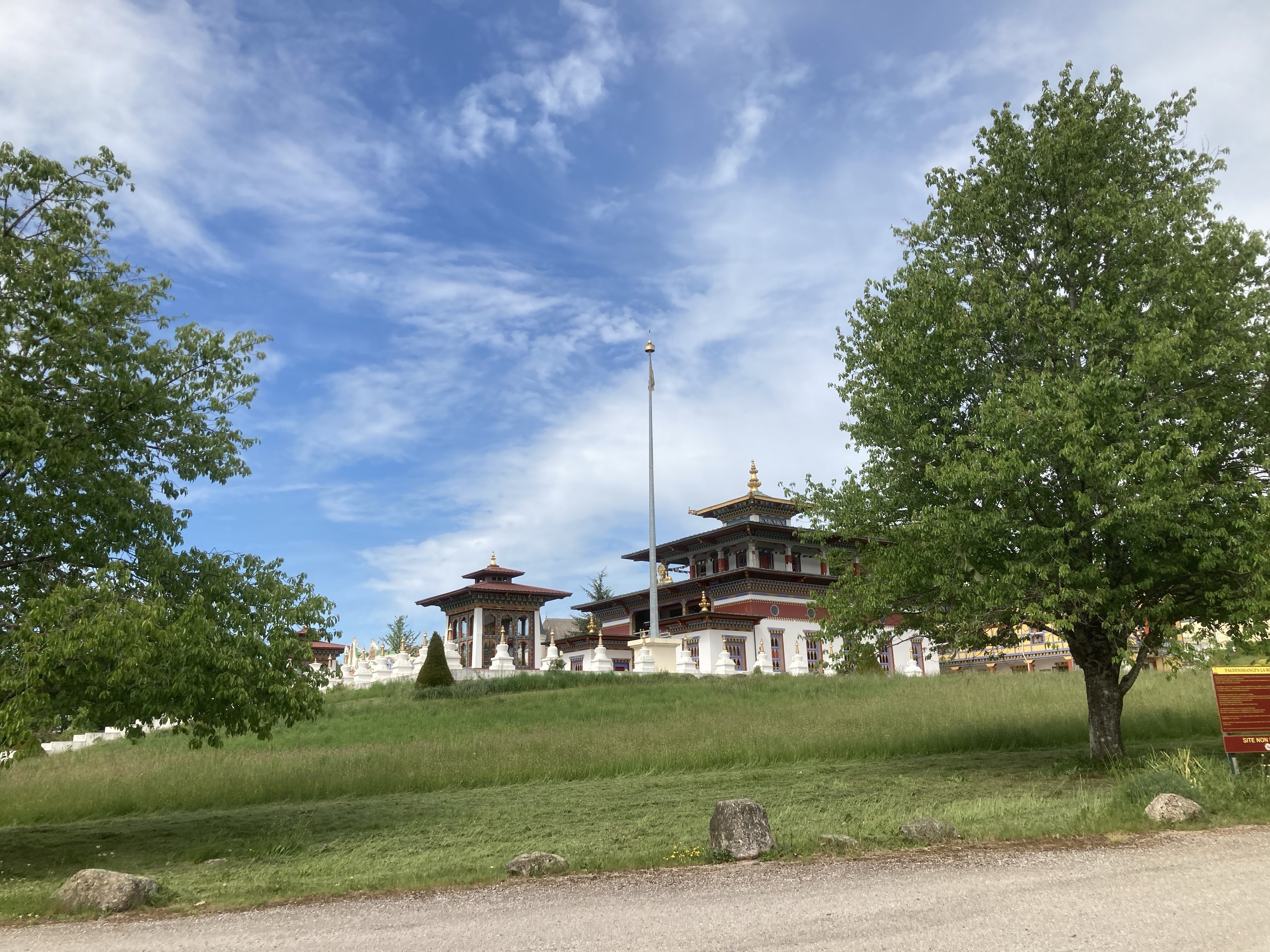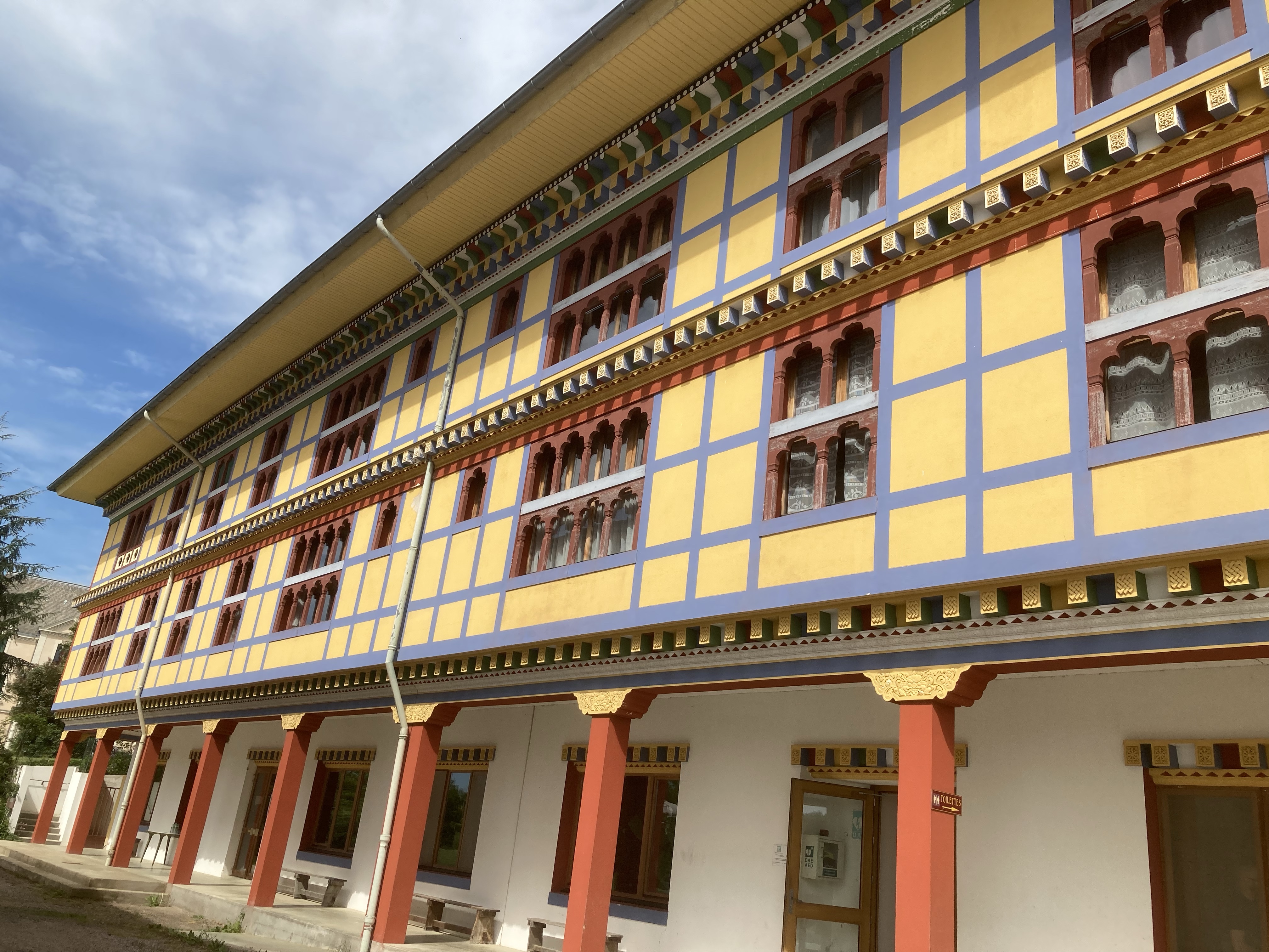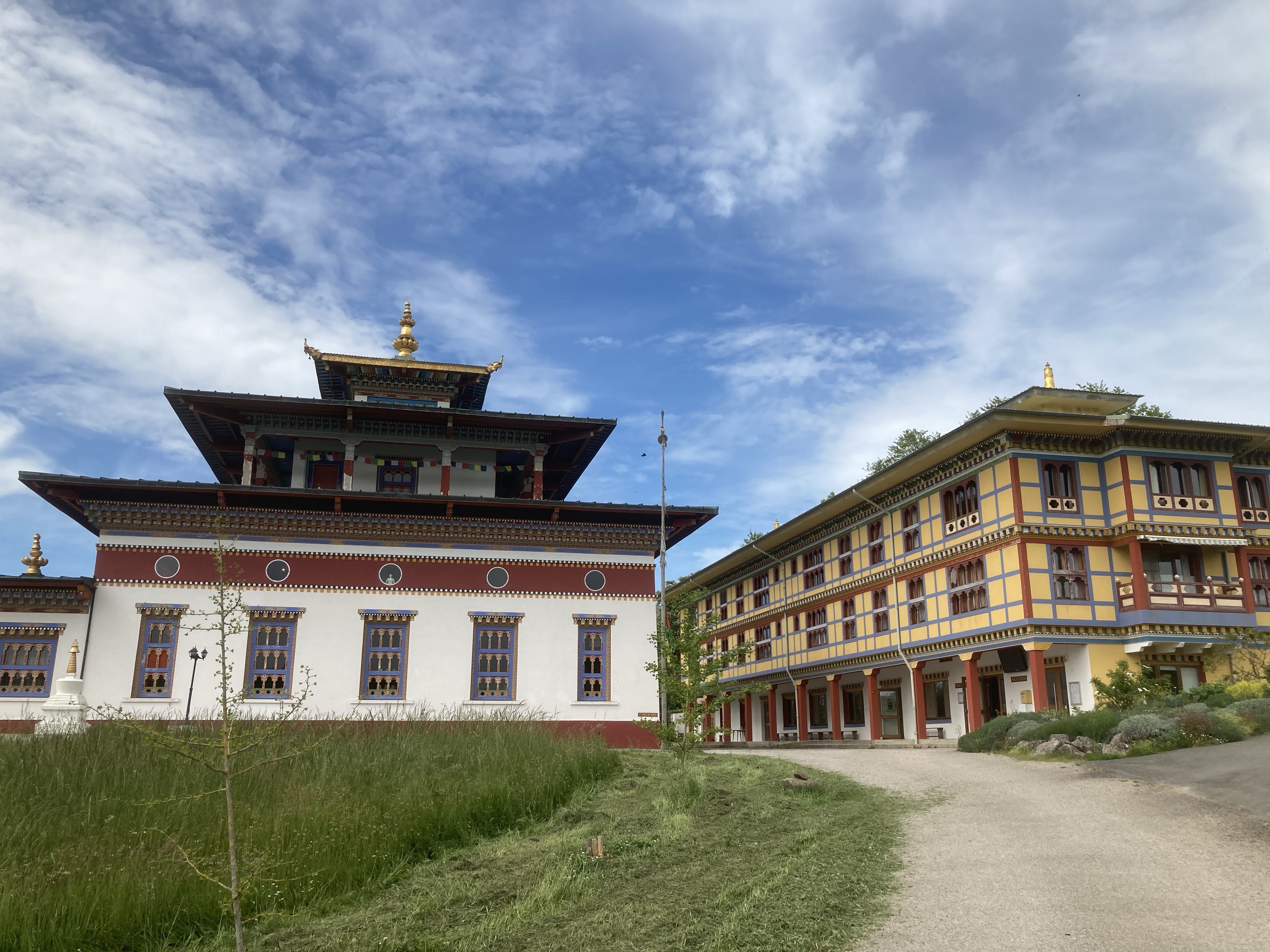 Devant moi se dresse le temple et ses stupas dont une avec une roue pour effectuer les Om Om et Om Padme Um, et à l’arrière le bâtiment jaune comprend les chambres de la congrégation, des personnes faisant des retraites et de ses moines. Des drapeaux tibétains colorés sont plantés un peu partout dans le parc et sur l’esplanade. Un vent tibétain vous prend et vous transporte dans la félicité.