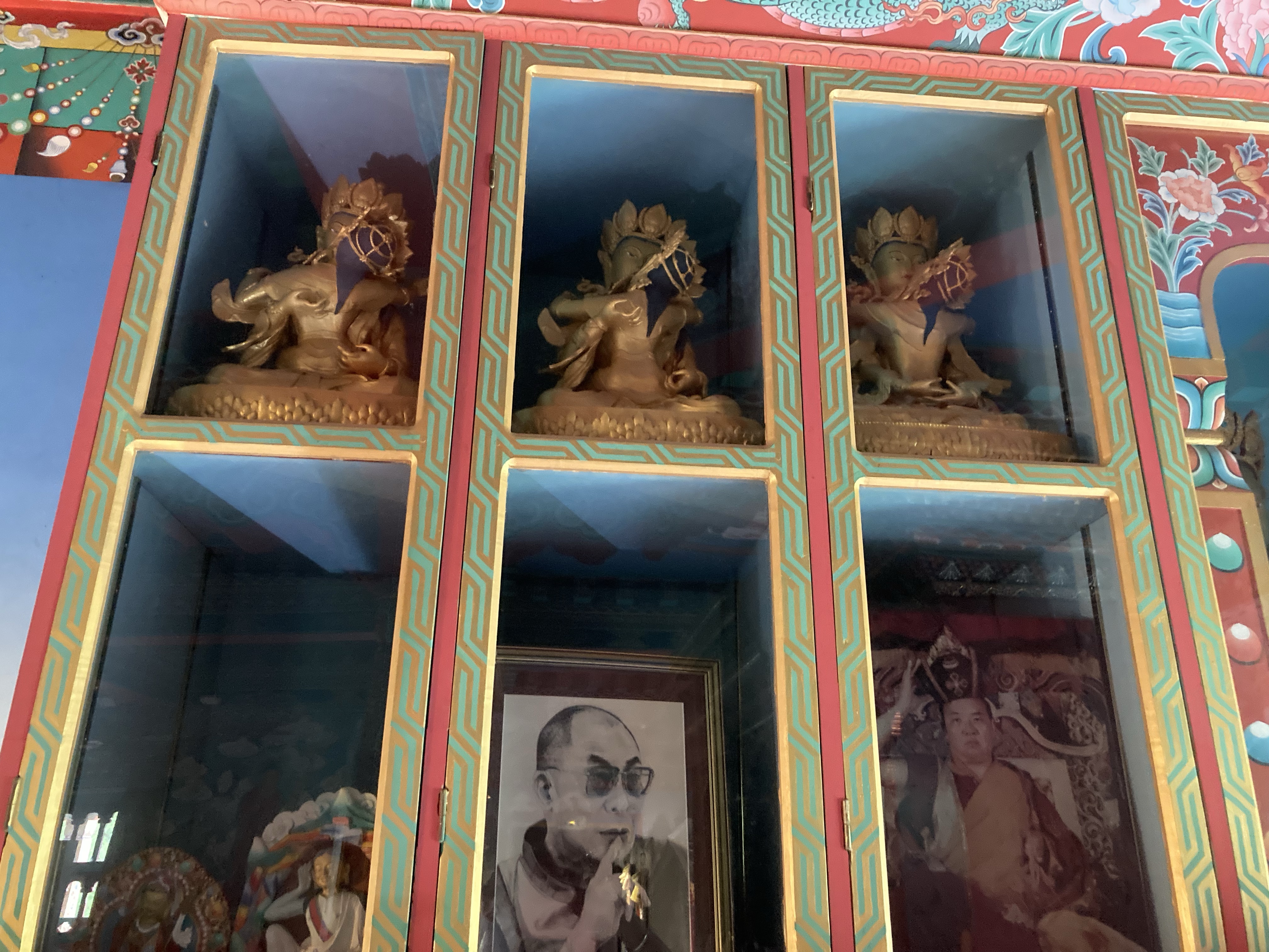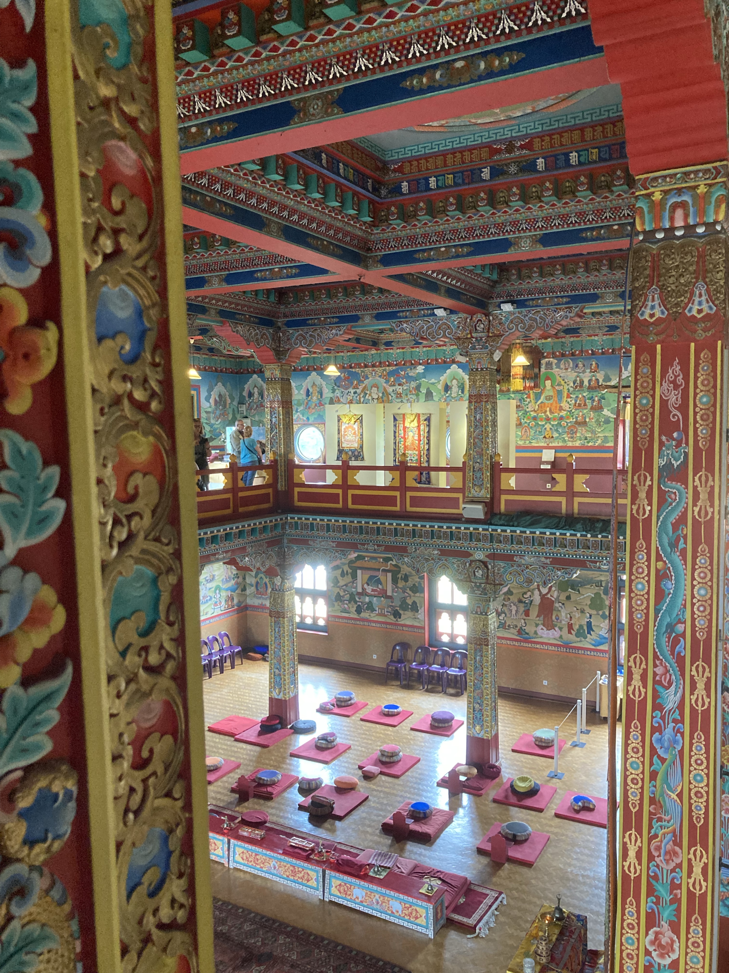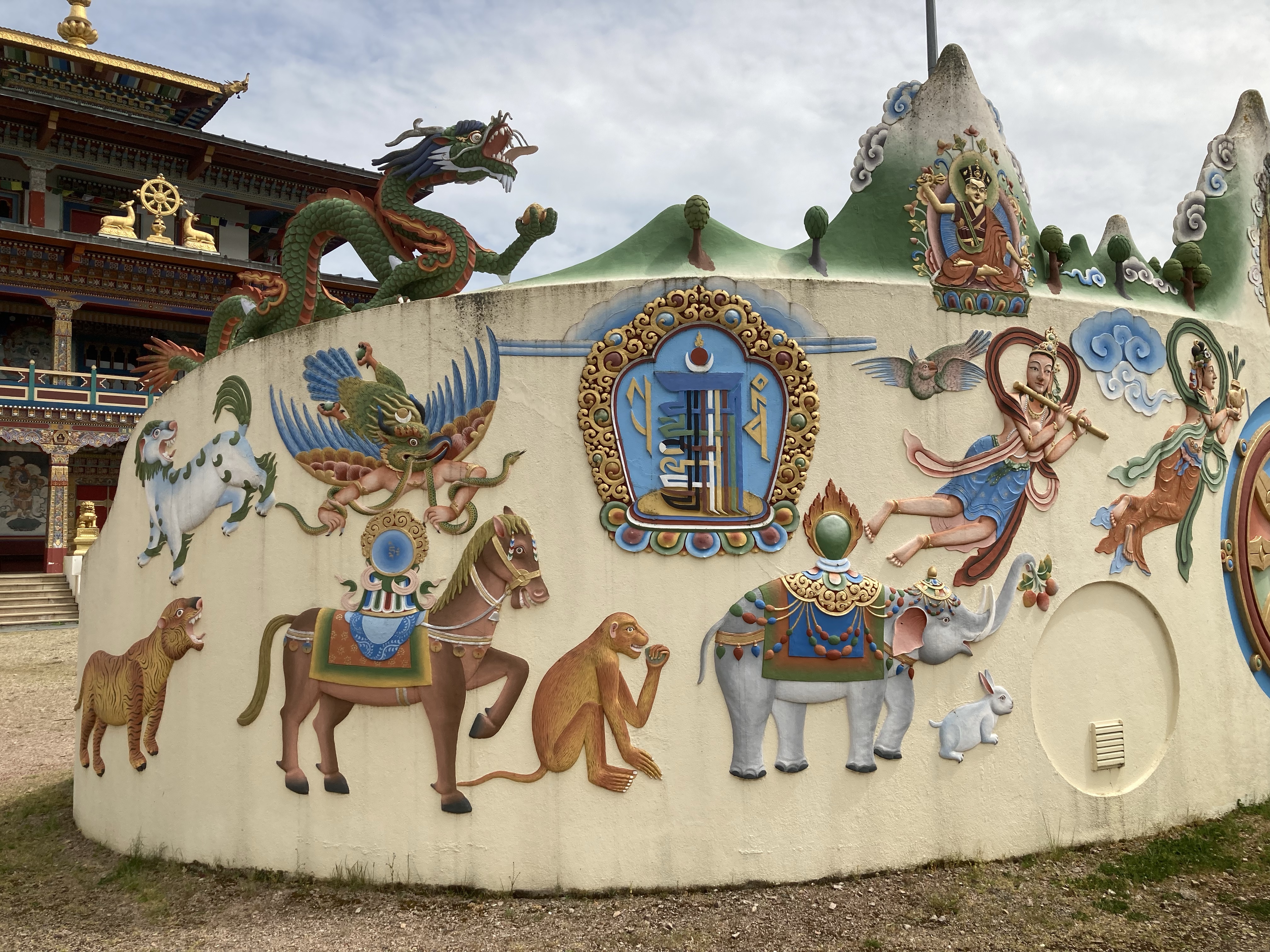Devant moi se dresse le temple et ses stupas dont une avec une roue pour effectuer les Om Om et Om Padme Um, et à l’arrière le bâtiment jaune comprend les chambres de la congrégation, des personnes faisant des retraites et de ses moines. Des drapeaux tibétains colorés sont plantés un peu partout dans le parc et sur l’esplanade. Un vent tibétain vous prend et vous transporte dans la félicité.