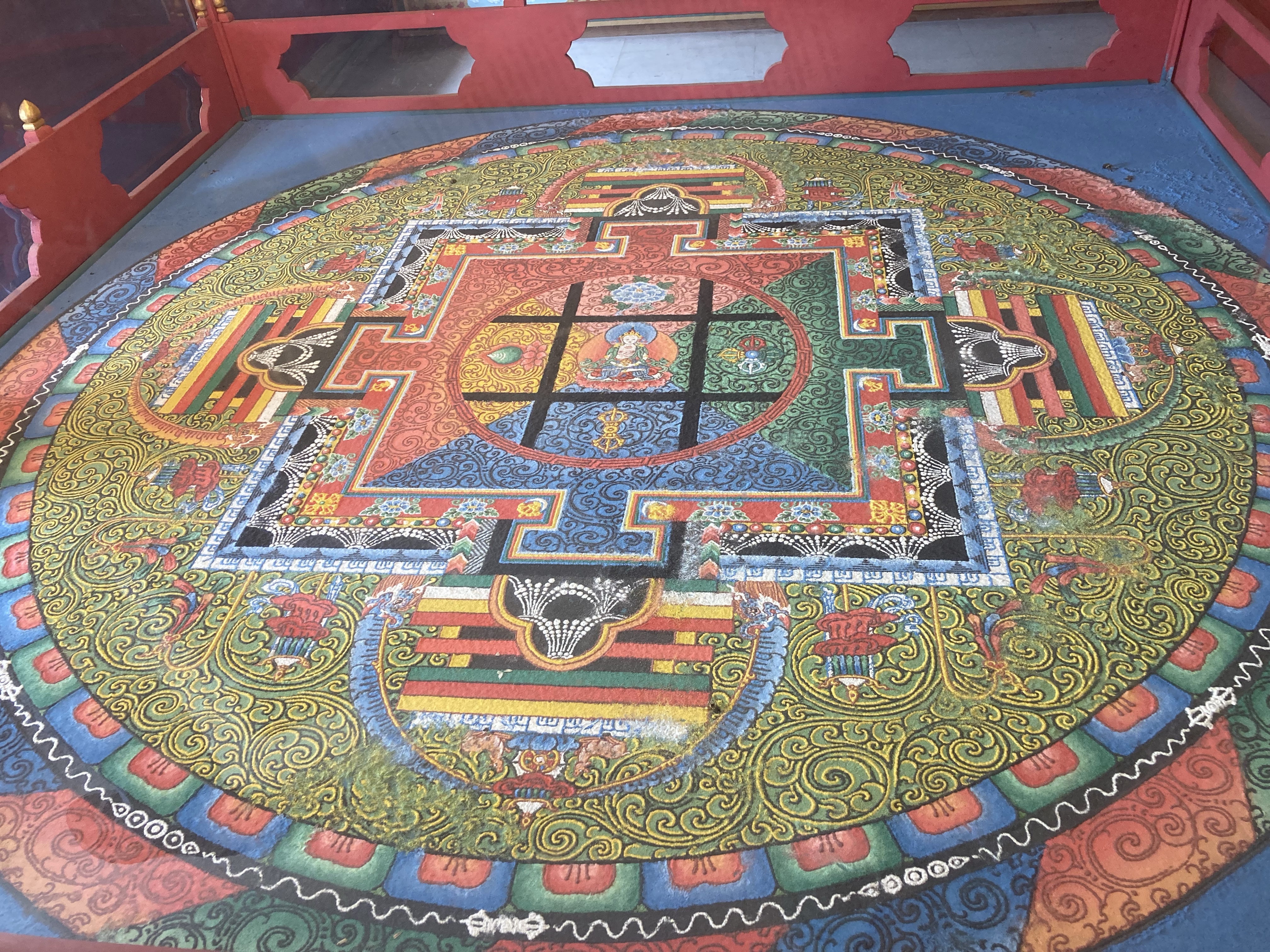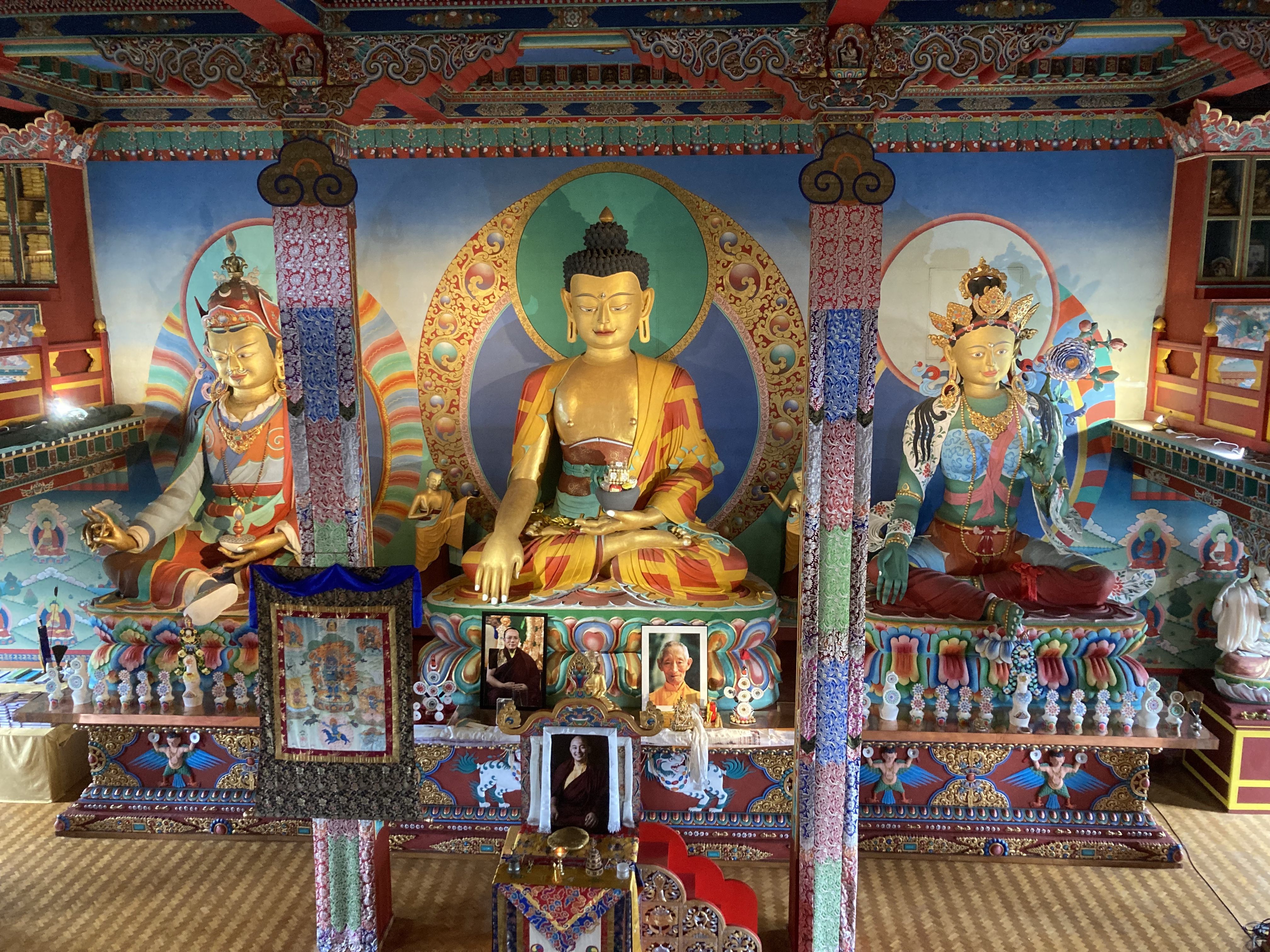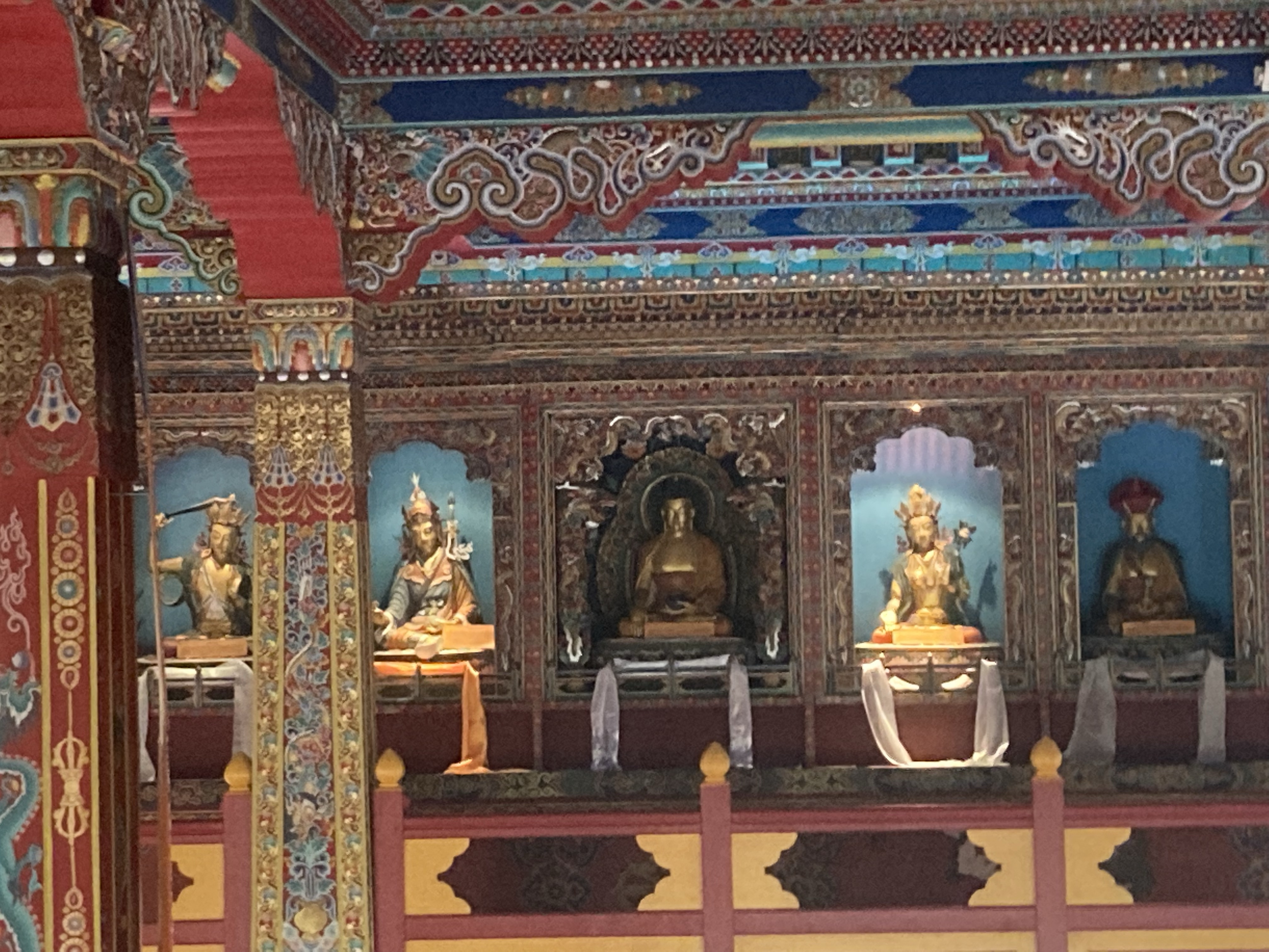 Le cadre est imposant avec ses déités debout (6 à 7 mètres de haut) et la hauteur des plafonds peints de mandalas qui font écho à celui éphémère à gauche dans la salle du haut. Au centre se trouve Bouddha, à gauche Gourou Rinpoché, à droite Tara.