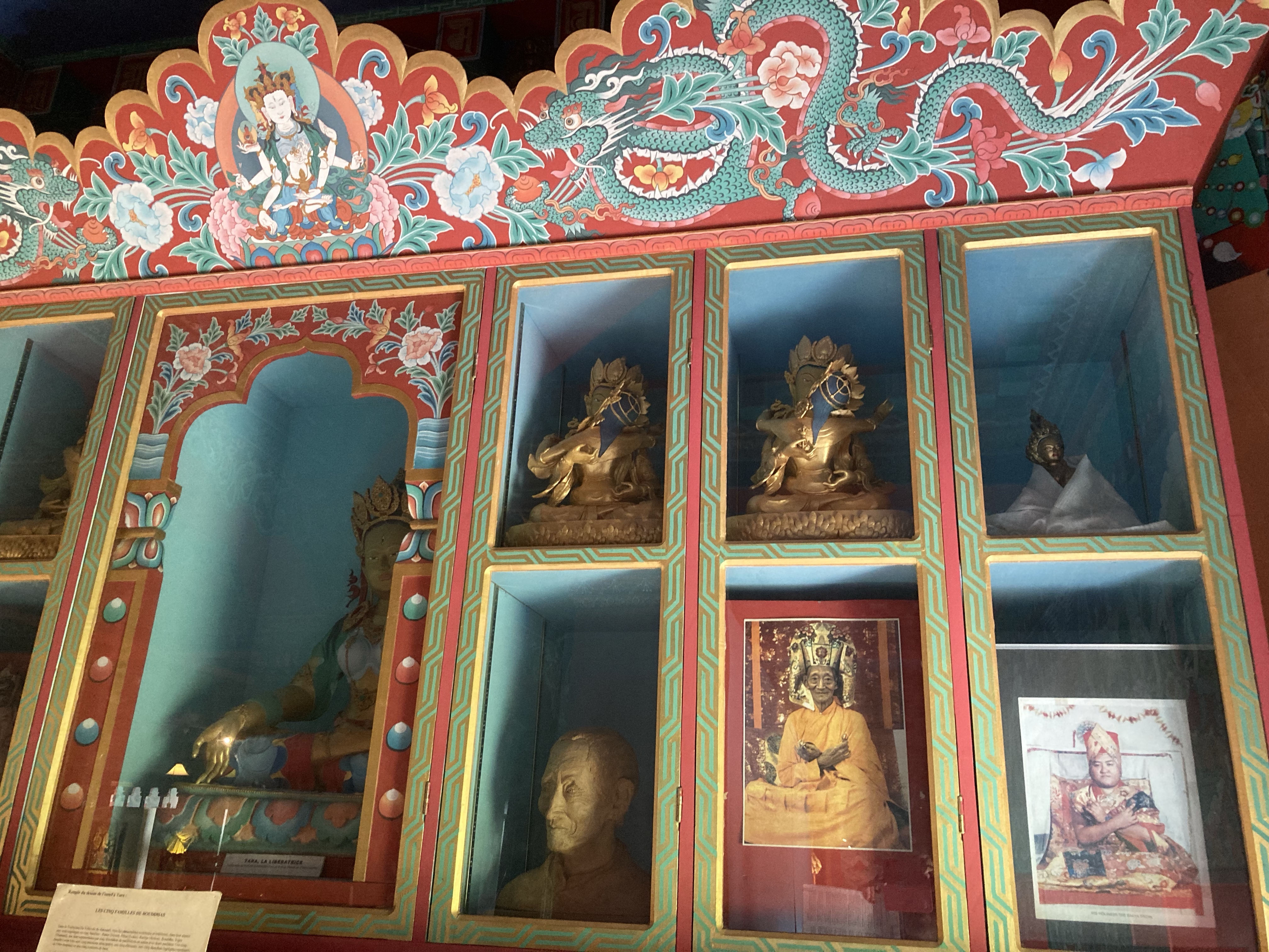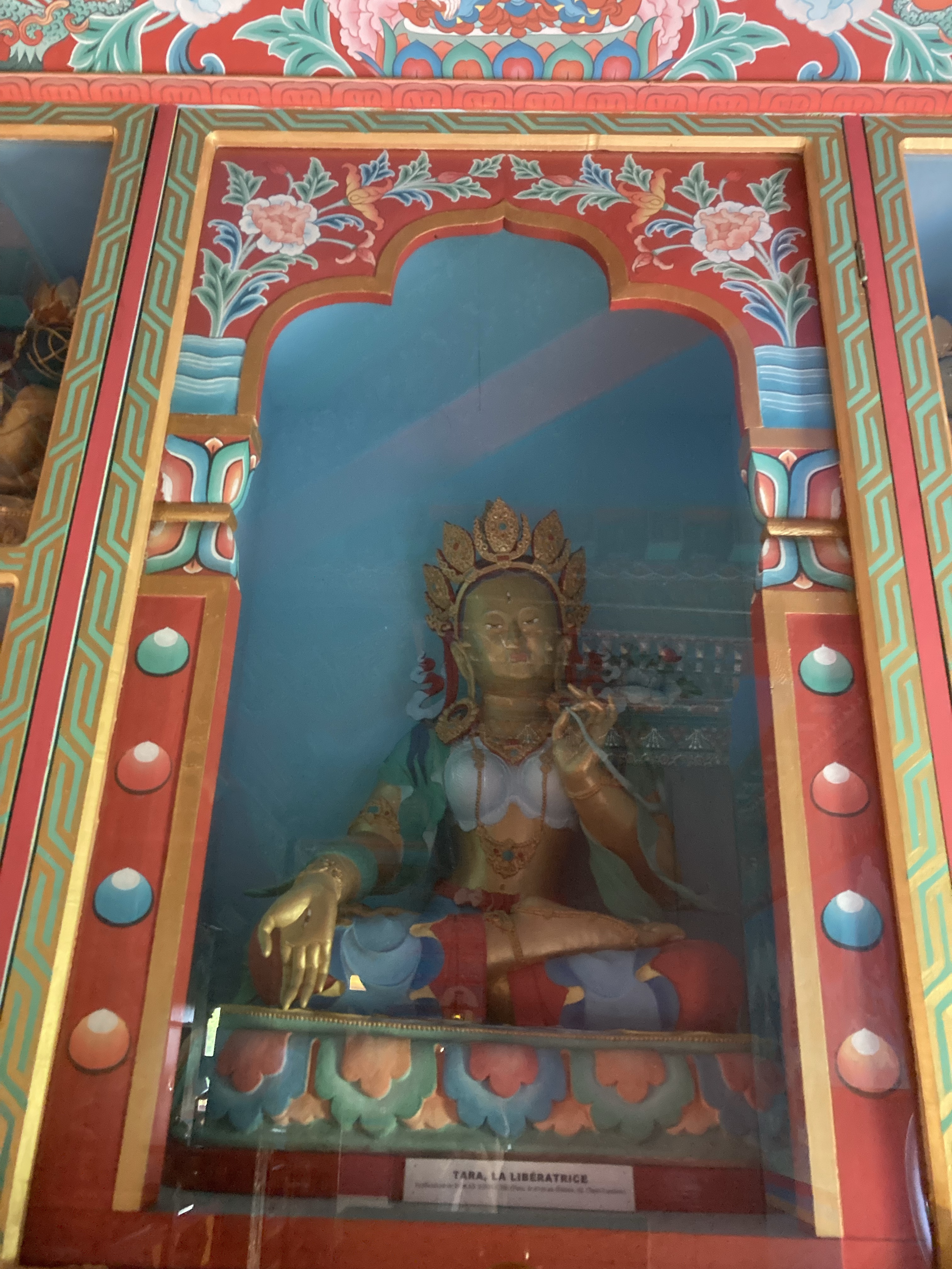 Les couleurs sont chatoyantes et chaudes – on se sent comme porté en lévitation. Un très beau meuble bhoutanais contient un certain de nombre de déités et de Bouddhas. Un meuble de Tara dans le fond. Tara dans le bouddhisme est très importante car elle représente la compassion et est celle qui écarte la peur et le danger provenant de l’ego, manifestation de notre esprit qui nous joue des tours.
