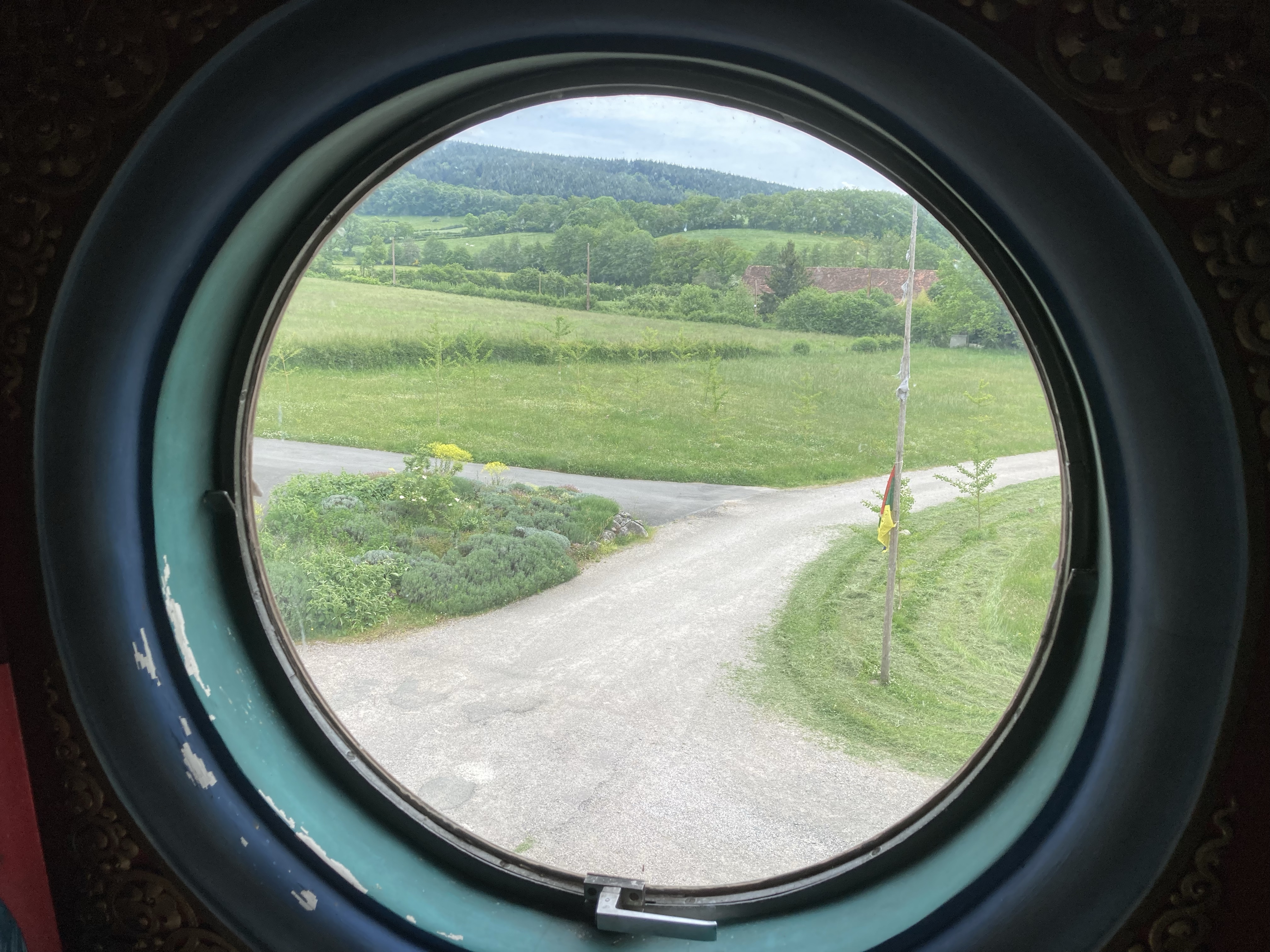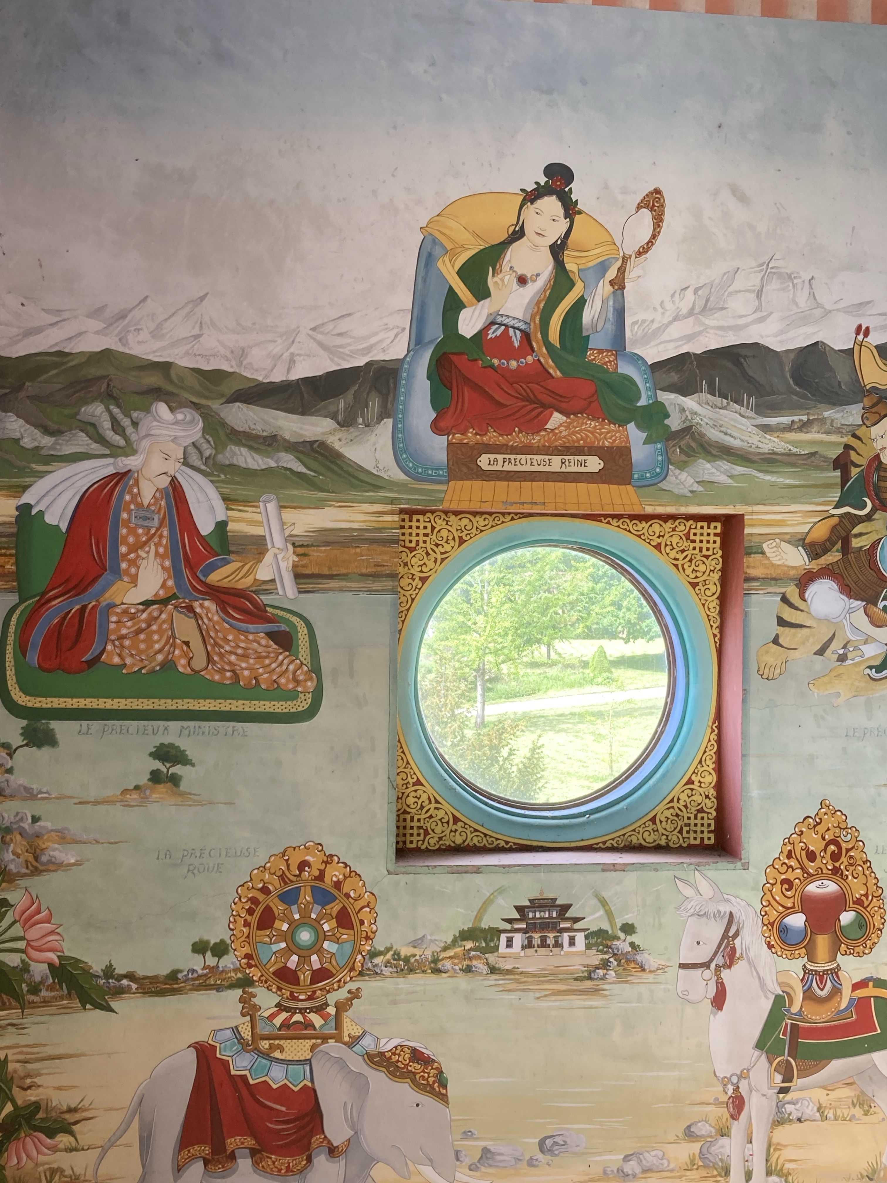 Le site se trouve en pleine région verdoyante et vallonnée – un endroit au calme où recueillement et méditation seront les maitres mots. Niché dans des arbres et dans un jardin à ciel ouvert, la porte d’entrée du temple remplie de couleurs jaune, bleu, d’or et de peintures racontant la vie de Bouddha donnent le ton. Et dans l’encadrement de la porte vous avez la vue la plus belle à 360° sur le temple. Me voilà transportée au Bhoutan ou bien au Ladakh ou encore au Népal. Mais non je suis bien en Bourgogne même si deux biches et la roue qui surplombent la porte du temple me précisent que j’entre dans le monde de la sagesse et de la paix intérieure.