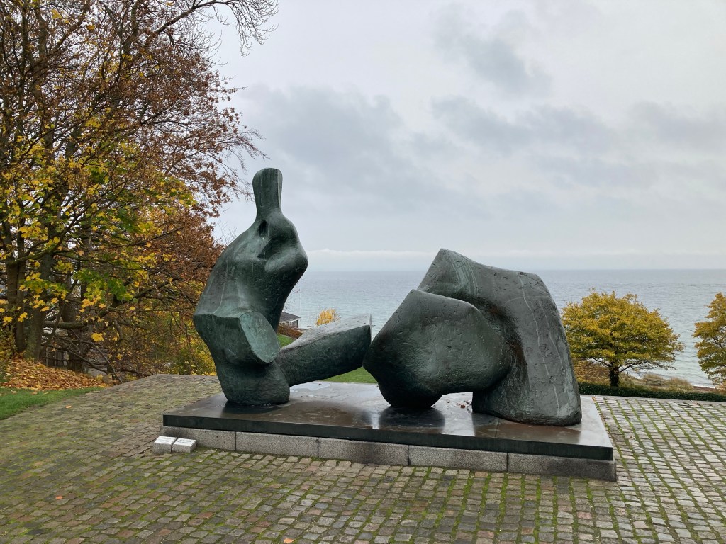 Les œuvres qui m’ont parlé sont celles de Henry Moore qui fait face à la mer : Two pieces reclining Figure n°5. Deux formes ou bien deux corps se faisant une cour assidue et obligeant les corps à se tordre.