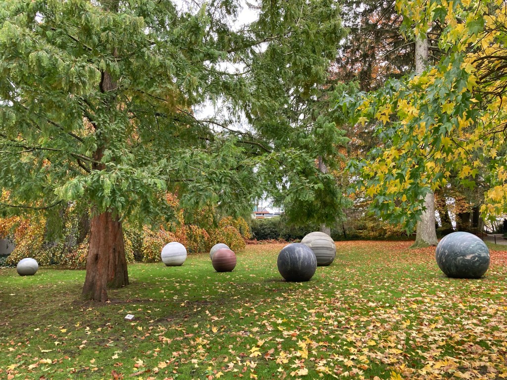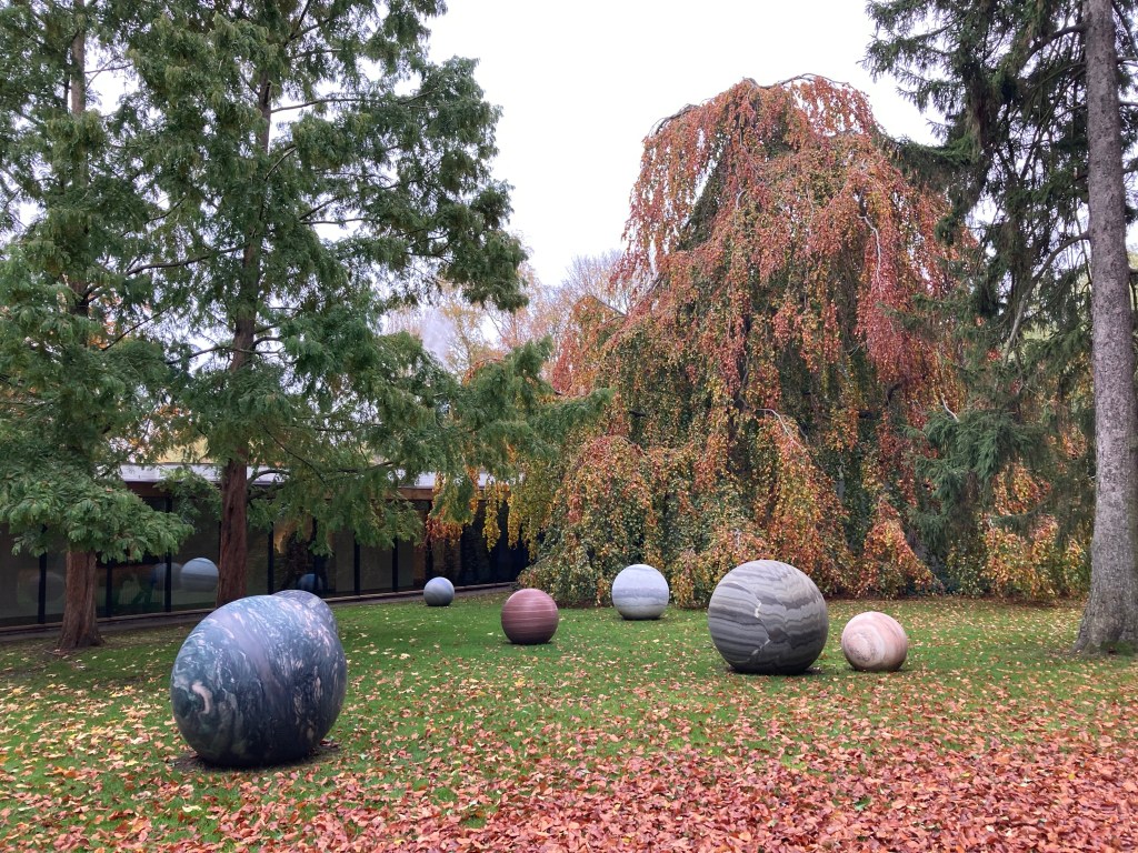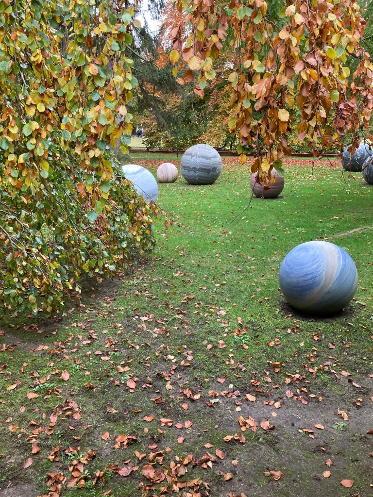 J’ai adoré à l’opposé du jardin les œuvres « Pars Pro Tato » d’Alicja Kwade boules rondes de pierres de différentes couleurs et provenant de différents lieux du monde qui s’harmonisent aux couleurs de l’automne et vous donnent envie de vous asseoir dessus. Elles sont posées à différents endroits sur la pelouse verte entre des saules pleureurs, des hêtres qui les regardent avec compassion. On dirait des boules représentant le monde des étoiles et des planètes qui composent notre galaxie. Celles avec des stries représente Jupiter, la bleue on dirait la Terre. Je vous laisse imaginer les autres.