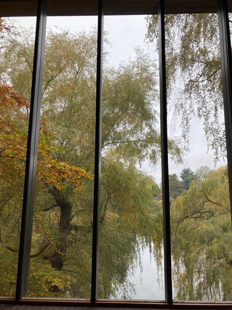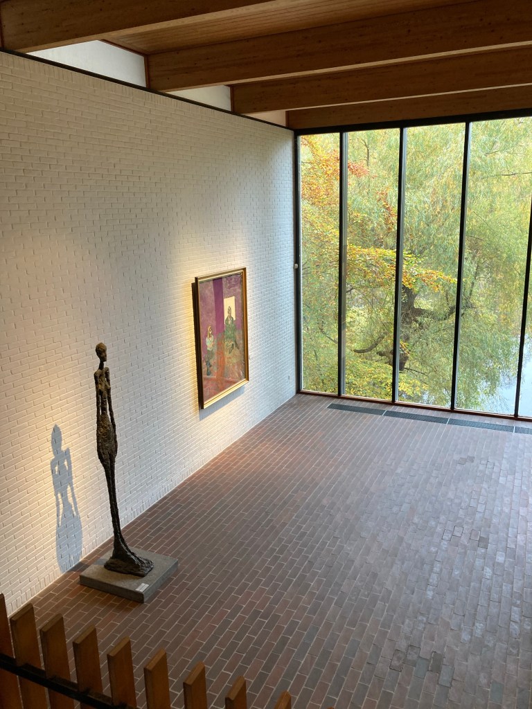 Et puis j’ai filé de l’autre côté du parc vers le lac en contre-bas d’une autre partie du musée – partie que l’on peut admirer de l’intérieur dans la salle où se trouvent les œuvres de Giacometti dite Galerie de Giacometti – ses hommes maigres et en longitude – lieu d’où vous avez une vue sur le lac à travers les grandes vitres de l’ex-atelier d’artiste. Un endroit de rêve et de calme qui ouvre vos chakras. Je suis descendue en longeant les escaliers qui y mènent et je me suis surprise à respirer le grand air et admirer les couleurs argentées du lac et des reflets des arbres se mirant dedans. On peut aussi admirer l’interaction entre le bâtiment en bois et la nature, tous deux se fondant l’un dans l’autre. Lieu magique !
