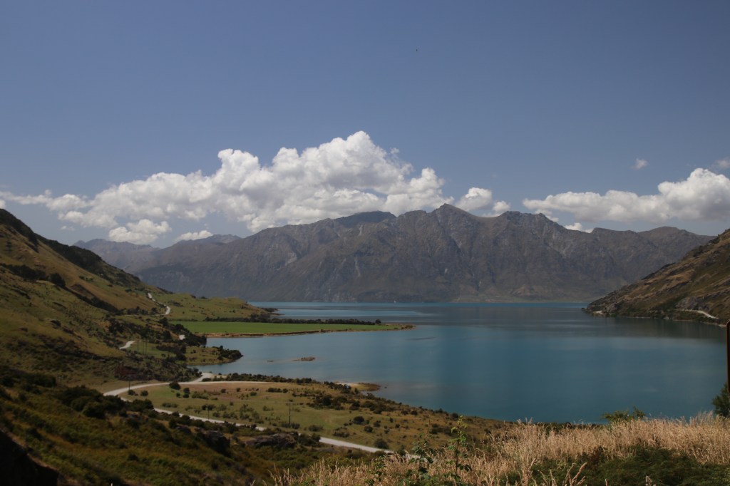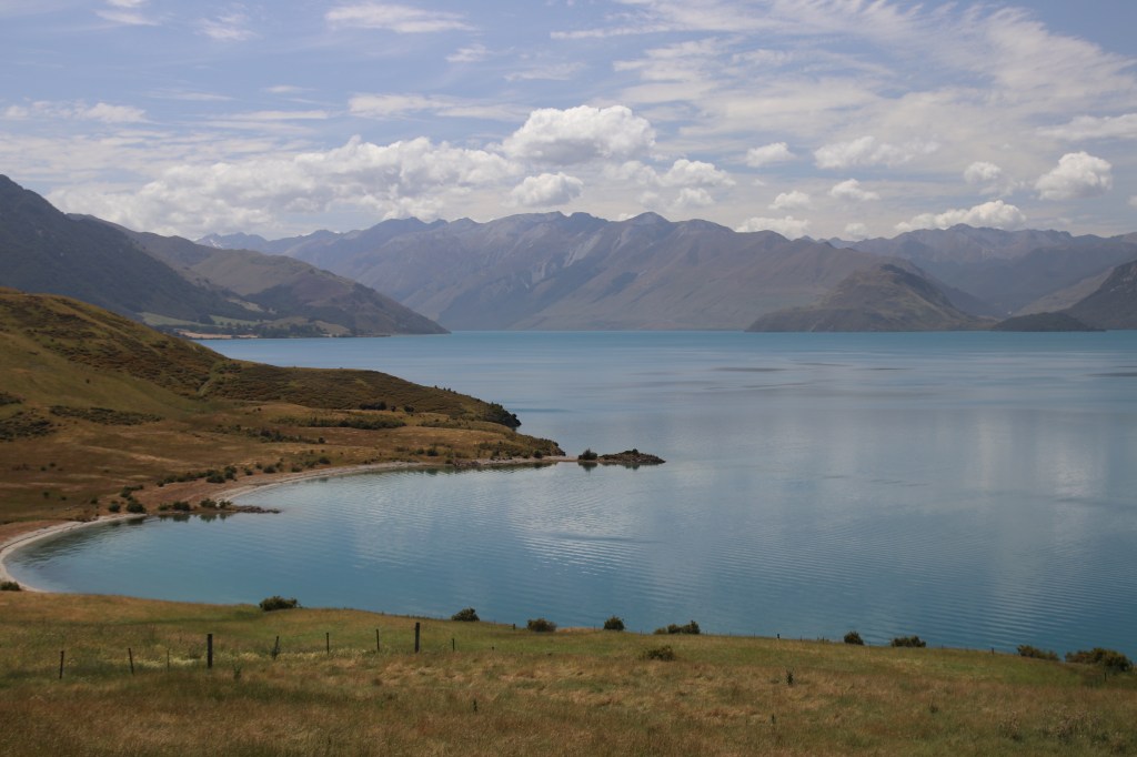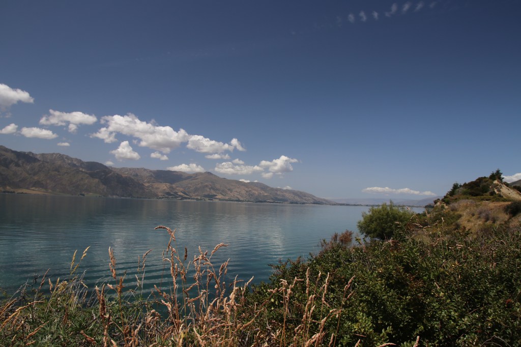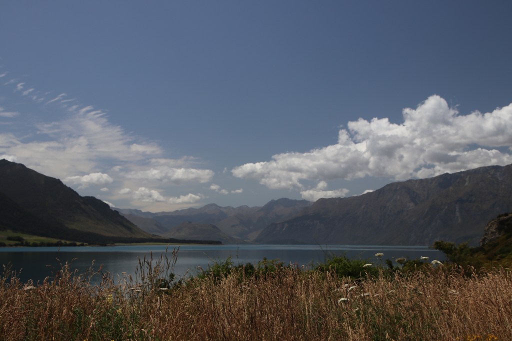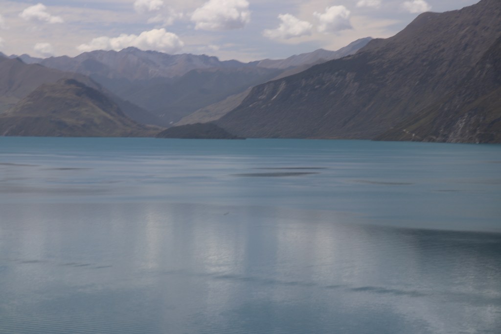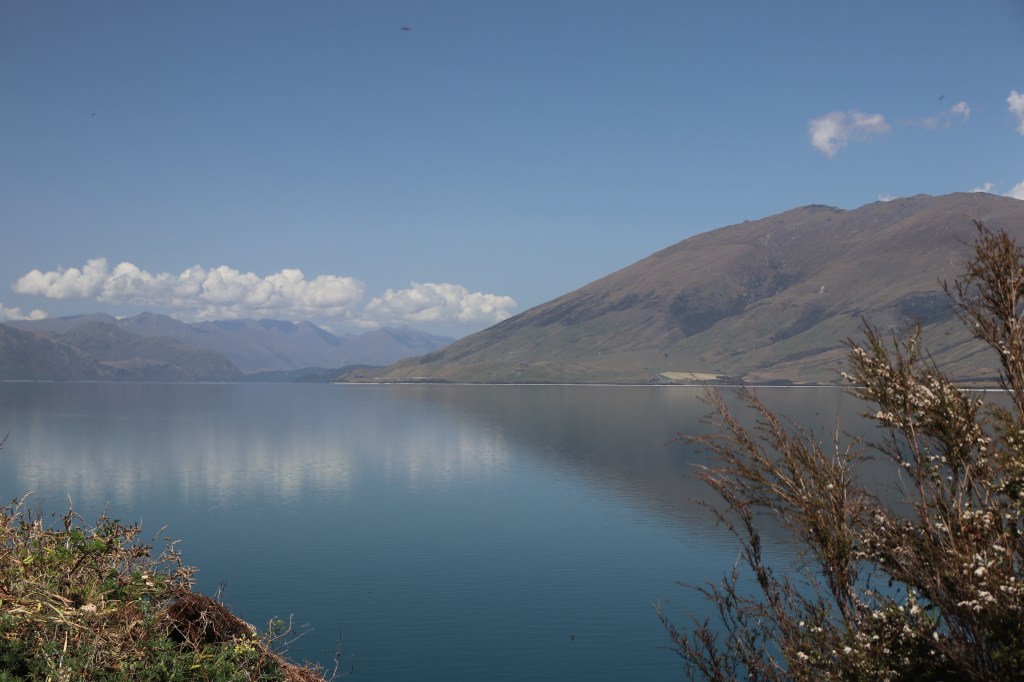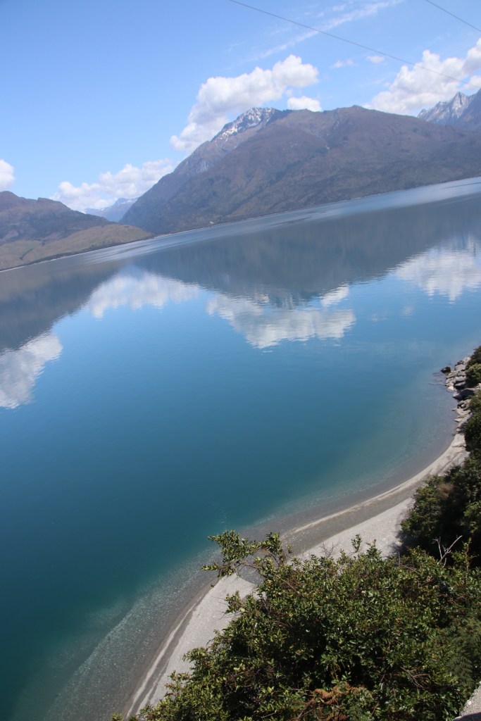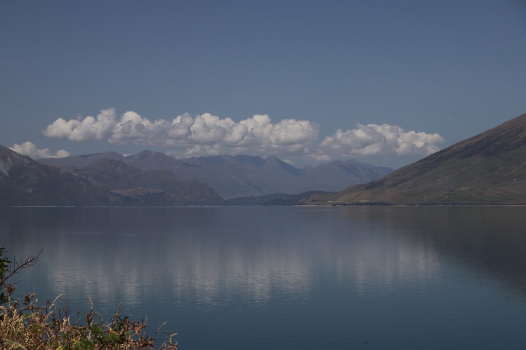 La route offre une vue sur les montagnes sur la côte ouest du lac magnifique. Les monts enneigés se reflètent dans l’eau bleu foncé du lac et les nuages en font de même. On dirait une procession de nuages voguant sur le lac ; des plages faisaient surface le long de la route et je me suis arrêtée pour me délasser de la voiture et humer l’air du coin. Quelles vues sur les horizons qui s’offrent à vous et surtout sur la longueur du lac qui cache sa fin. Là aussi la méditation, le recueillement et la paix intérieure vous faisaient entrer en vous et le paysage vous subjuguait. Je serais bien restée là des heures mais la route m’attendait pour rejoindre Wanaka.
