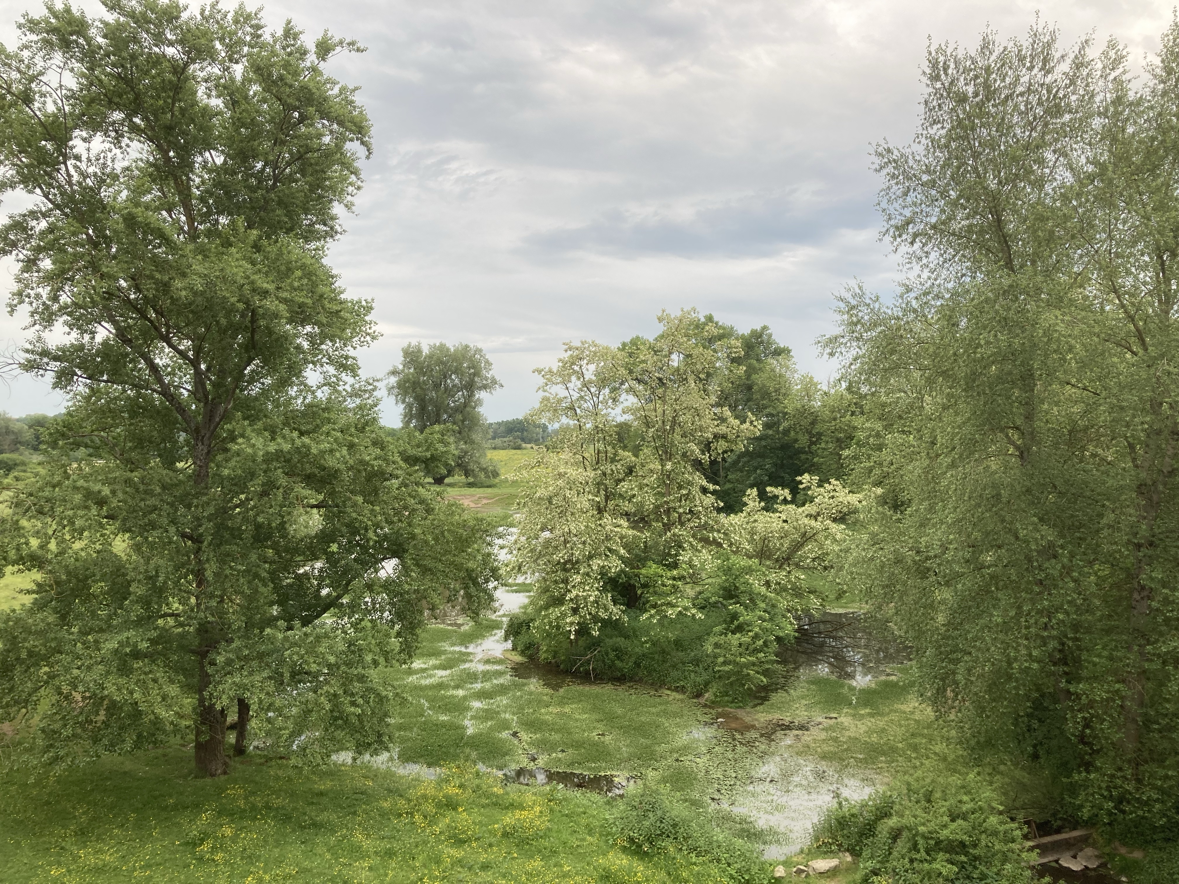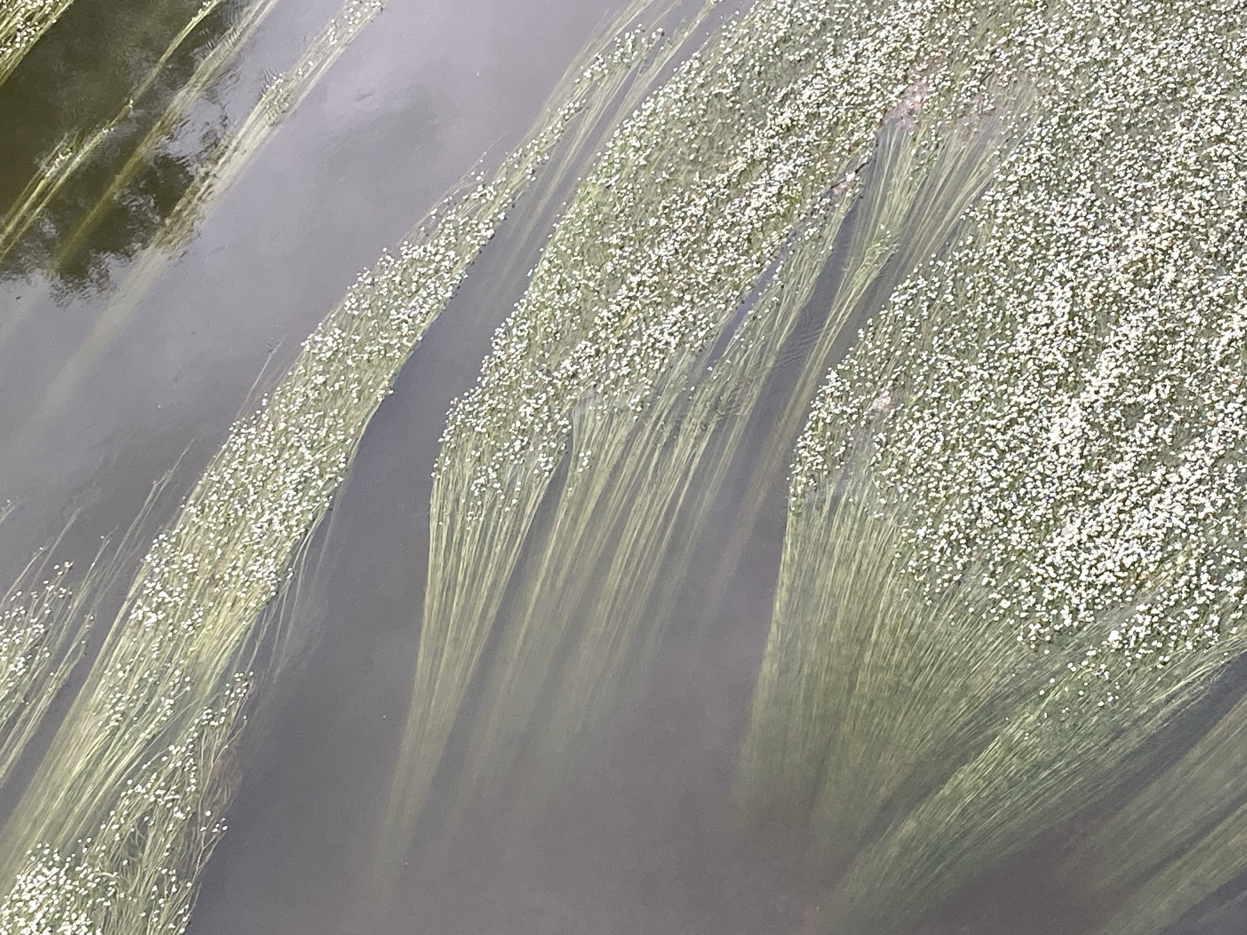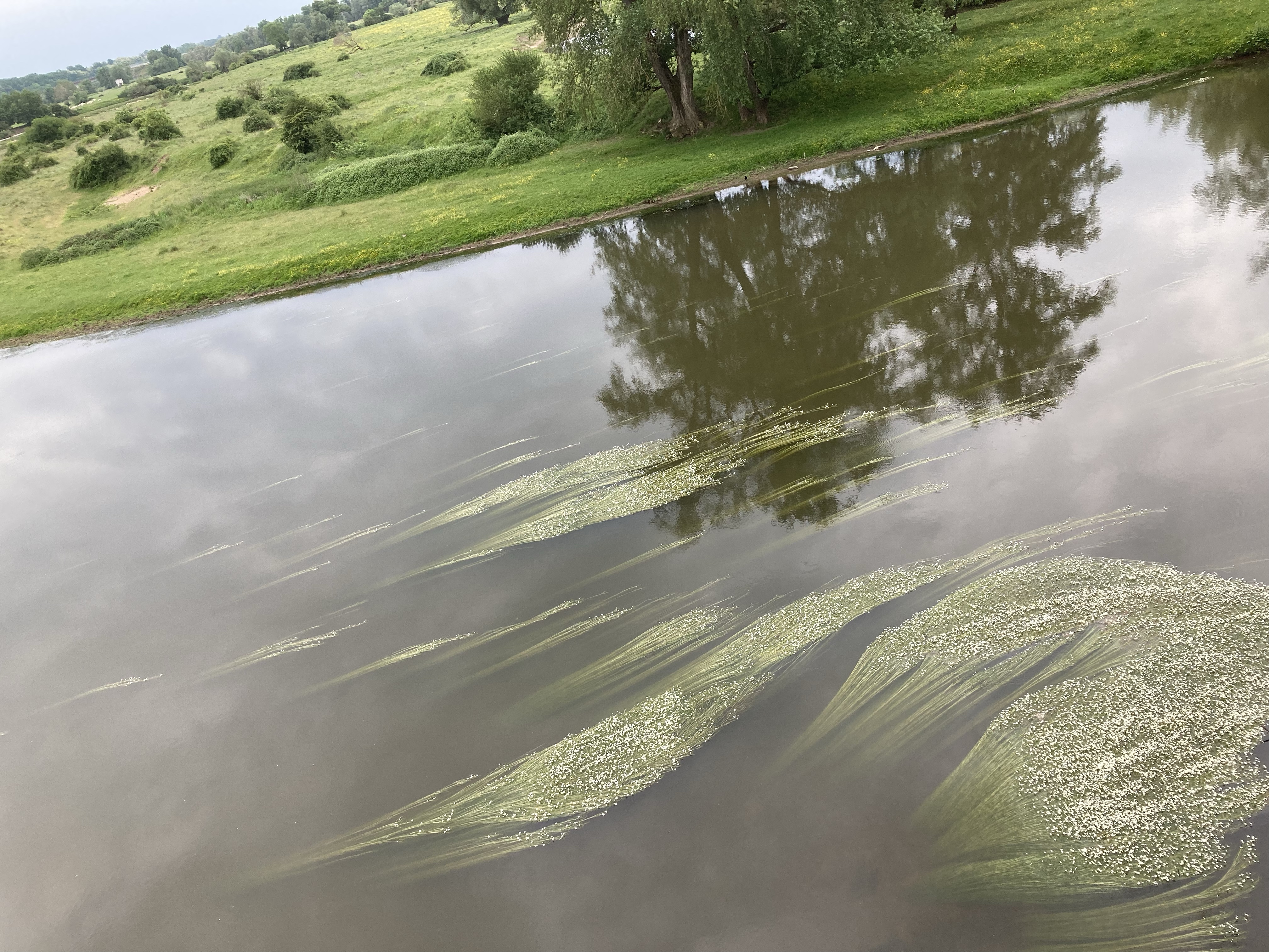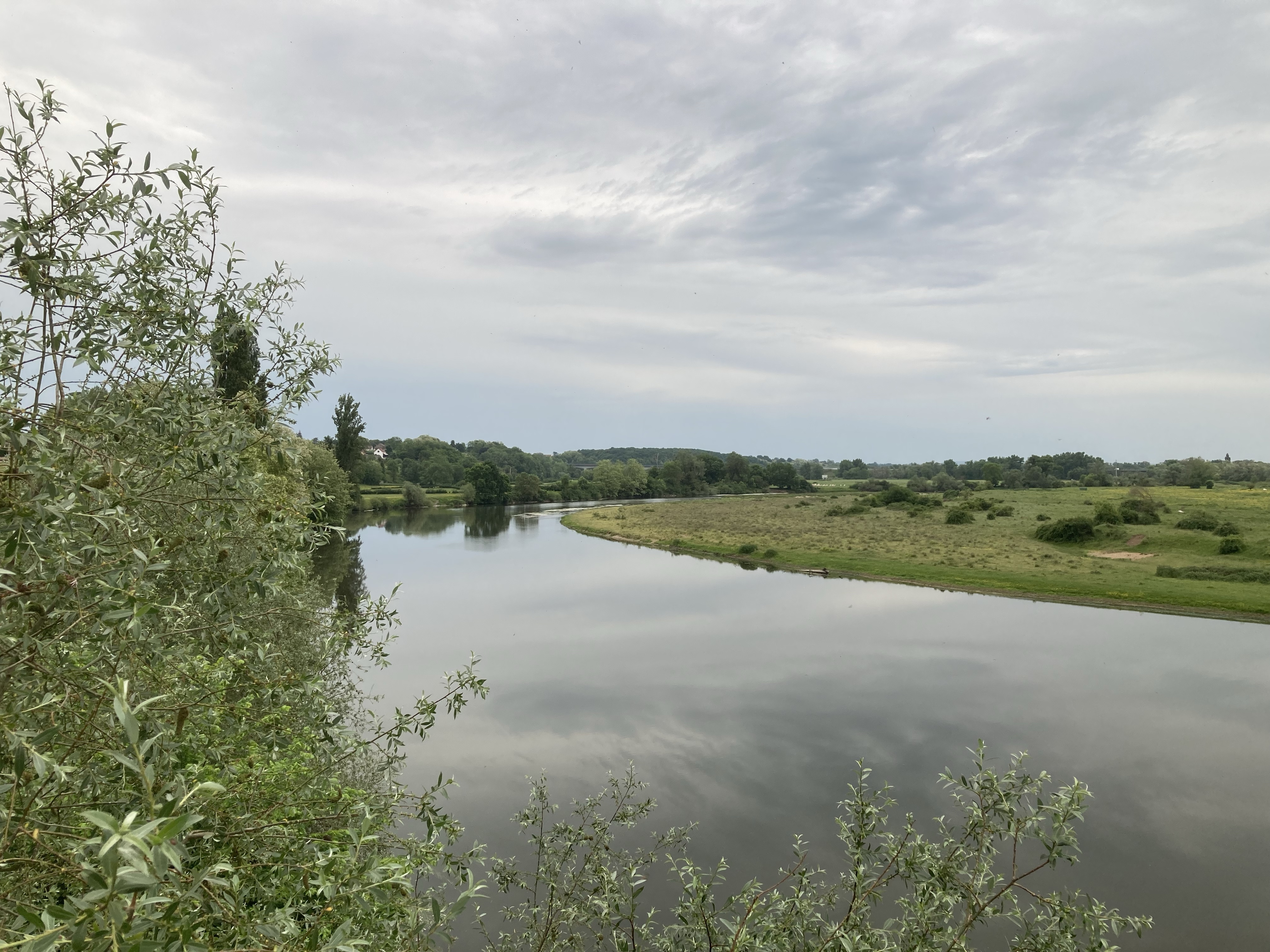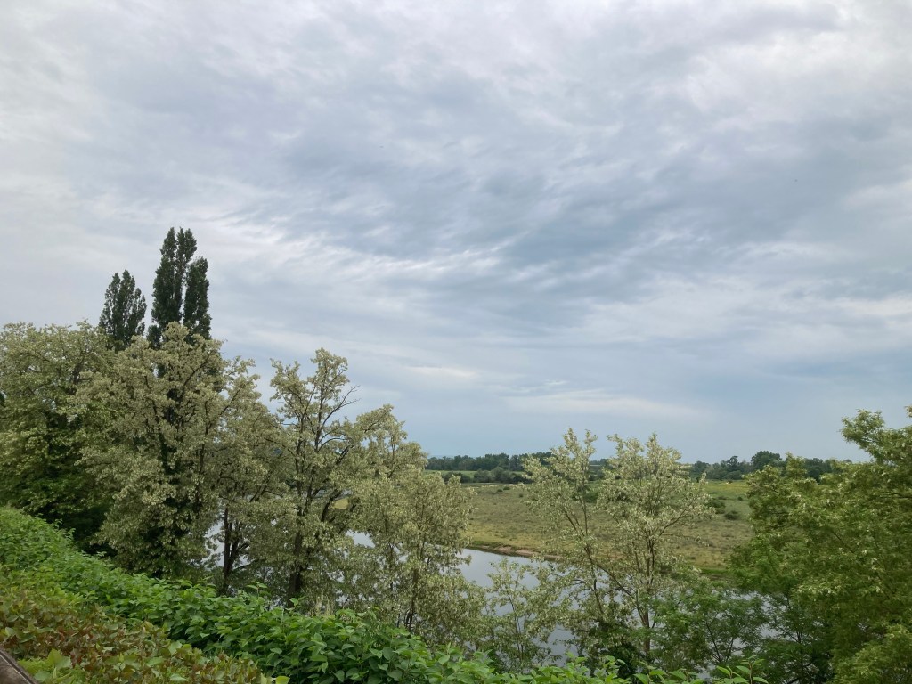 La vue sur la Loire est époustouflante car on le surplombe. Les arches se reflètent dans l’eau et donne une impression d’insertion dans l’eau. Les algues vertes longues et tortueuses suivent les mouvements du fleuve et sont fleuries. Elles font comme de longues trainées vertes et blanches. Une ile sépare les deux côtés du fleuve, pleine d’eau et de vase, et plain d’arbres en fleurs miroitent. On peut y croiser des canards.