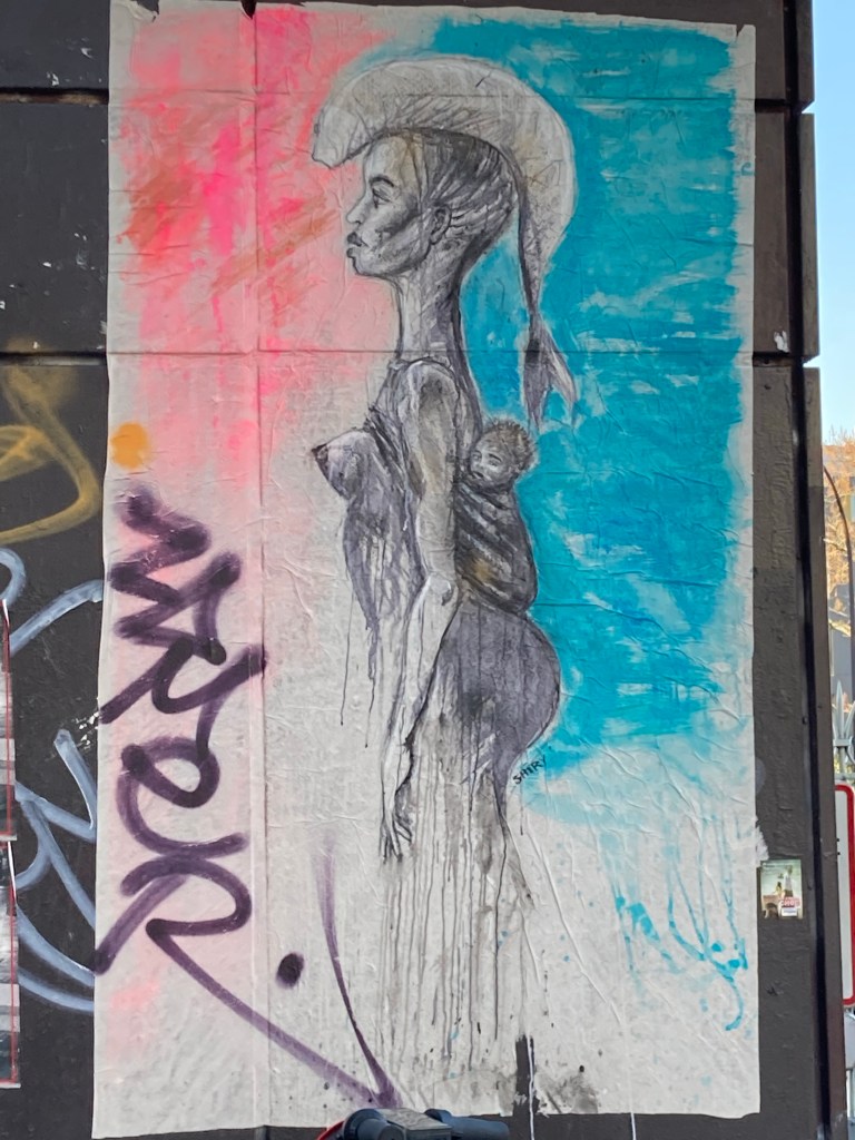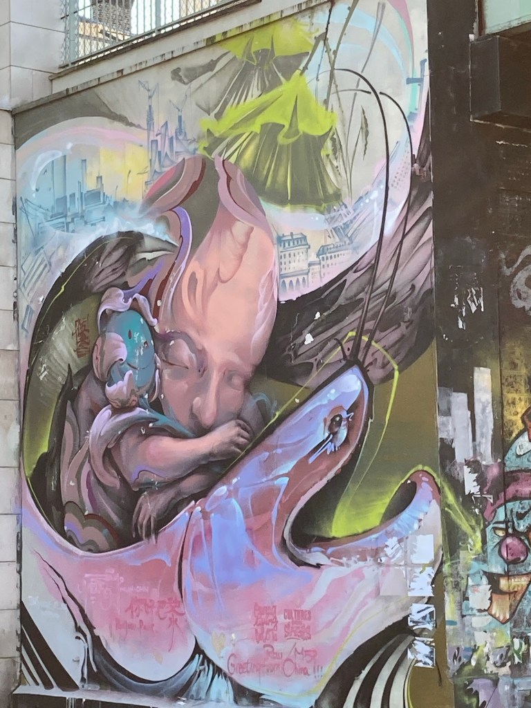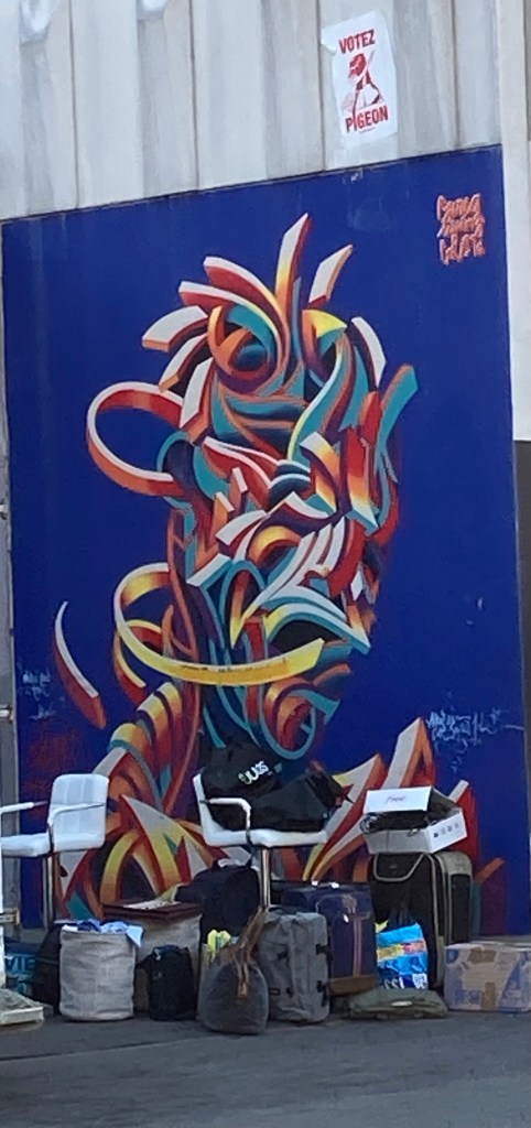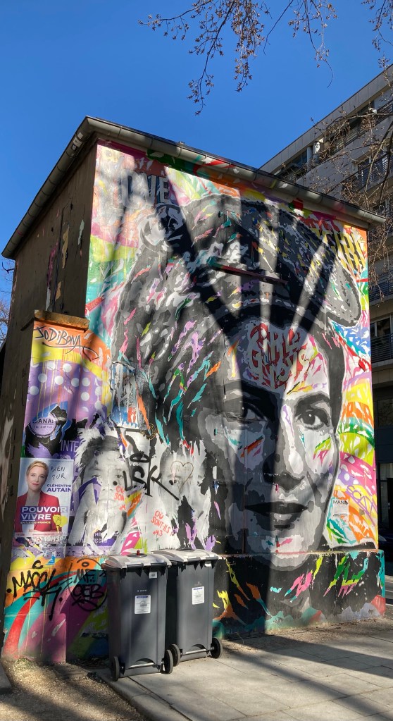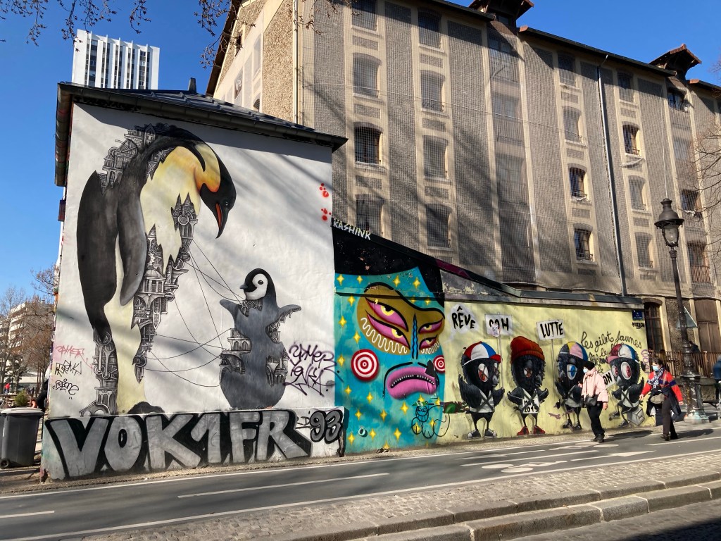 Des pingouins vous font de l’œil et s’occupent de leur petit et regardant des poussins noirs qui ont des slogans au-dessus de leurs têtes. « Rêve, Lutte … Les gilets jaunes ras le fion ! » Cela nous parle d’une époque où les français se sont révoltés il n’y a pas si longtemps ! Cela donne le ton dans le quartier. J’adore la tête de ces poussins aux casquettes bleu blanc rouge à la mode de chez nous.
