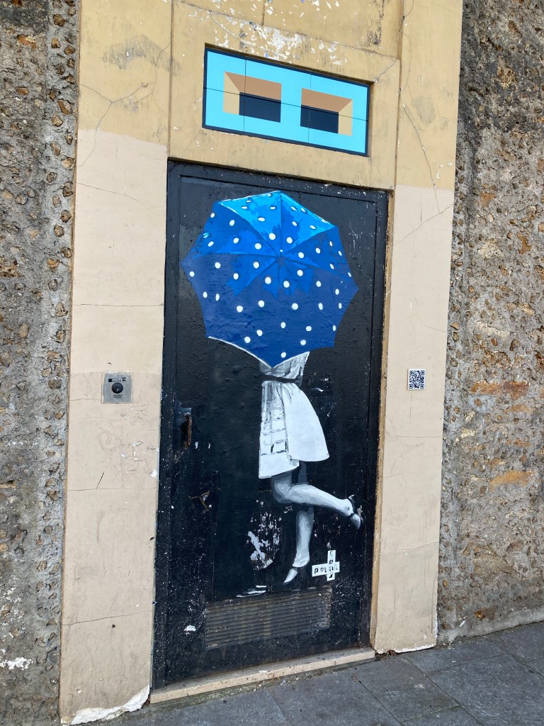 A une porte une femme en blanc, de dos, avec son parapluie bleu à petits pois blancs essaie de traverser cette porte sans pouvoir y arriver. Elle nous laisse une envie d’y aller avec elle ou bien de chanter sous la pluie sous son parapluie. Les jolies chaussures noires du dimanche avec ses talons hauts vous invitent à la suivre. Il est signé Bear Polar.