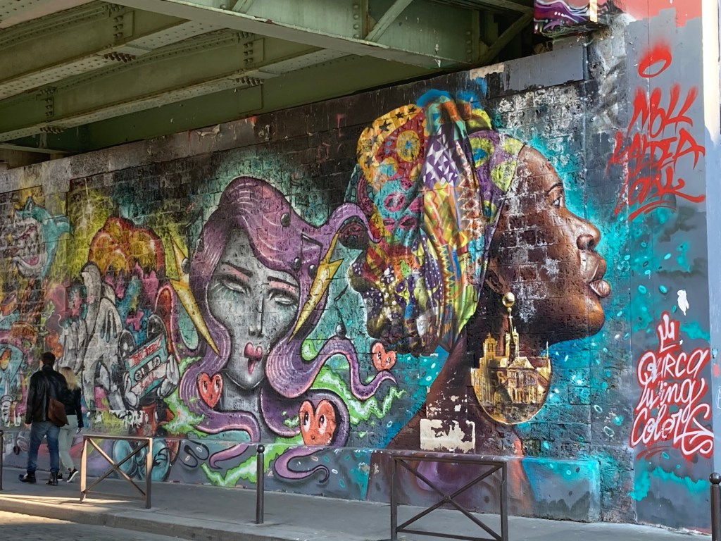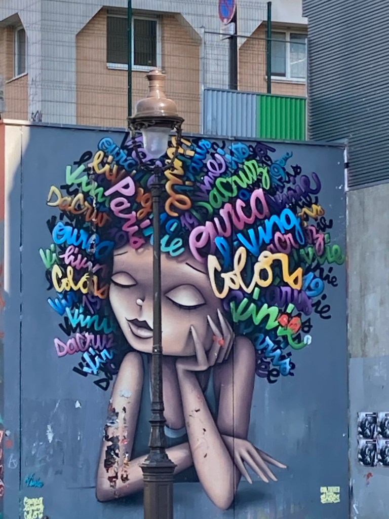 Et nous repartons avec des visages de femmes noires ou blanches aux cheveux mauves ou bien retenus par un foulard coloré et avec des boucles d’oreilles supportant Notre Dame. C’est tout un monde qui se profile devant nous.