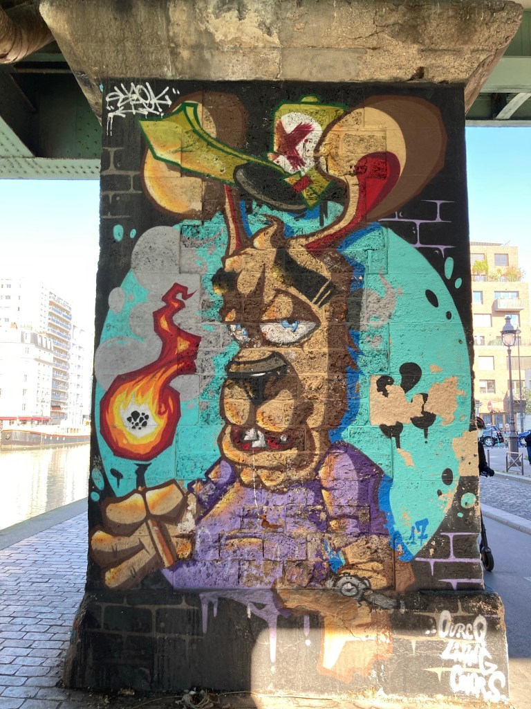 Sur un autre pilier un chien avec une allumette va faire exploser le pont ? Ou bien la girafe et le caméléon qui lui font face vont-ils éteindre l’incendie ? Un bestiaire nous offre sa vue du monde et du monde du 19e arrondissement.