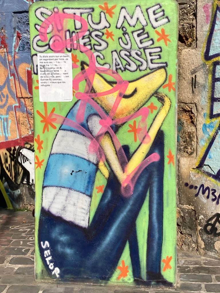 L’artiste Selor a peint aussi une sorte de chien mi rat mi humain assis recroquevillé sur lui-même qui réfléchit et dis « si tu me colles je me casse ». Ca en dit suffisamment. Et dessus est collé un écrit pas forcément très lisible mais qui dit que les animaux sont mieux traités que les réfugiés. Triste monde dans lequel nous vivons !