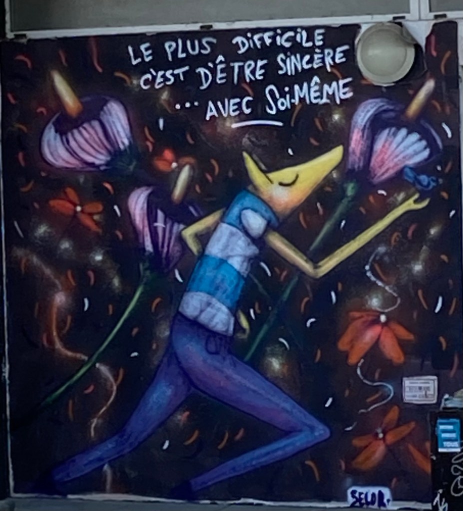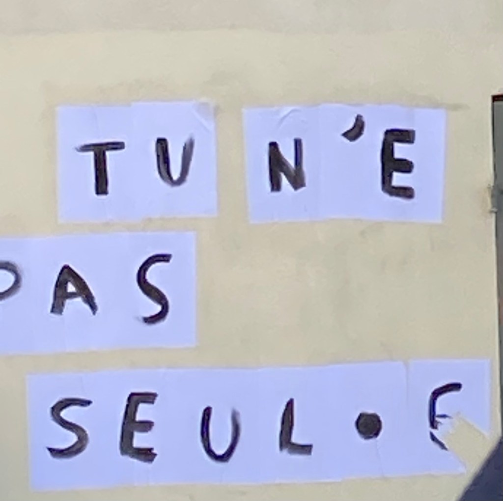 Et puis ce collage sur un mur jaune « tu n’e pas seul-e » – triste vérité du monde dans lequel nous vivons.