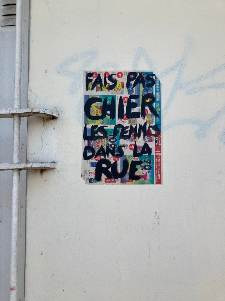 Et je terminerais par ce collage peinturluré : « Fais pas chier les femmes dans la rue » qui est bien de notre temps et fait appel à toutes les informations de viol, inceste…. Qui parsèment le monde d’avant de d’aujourd’hui.