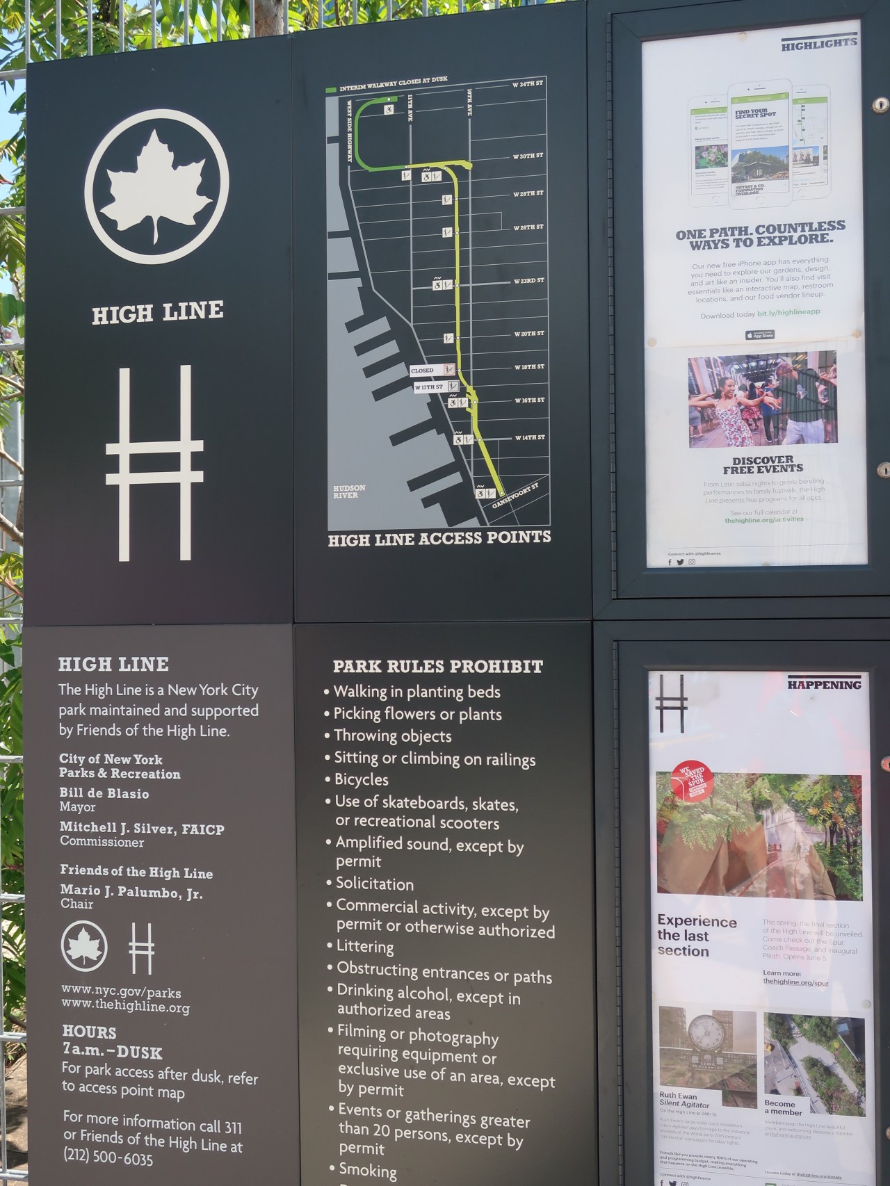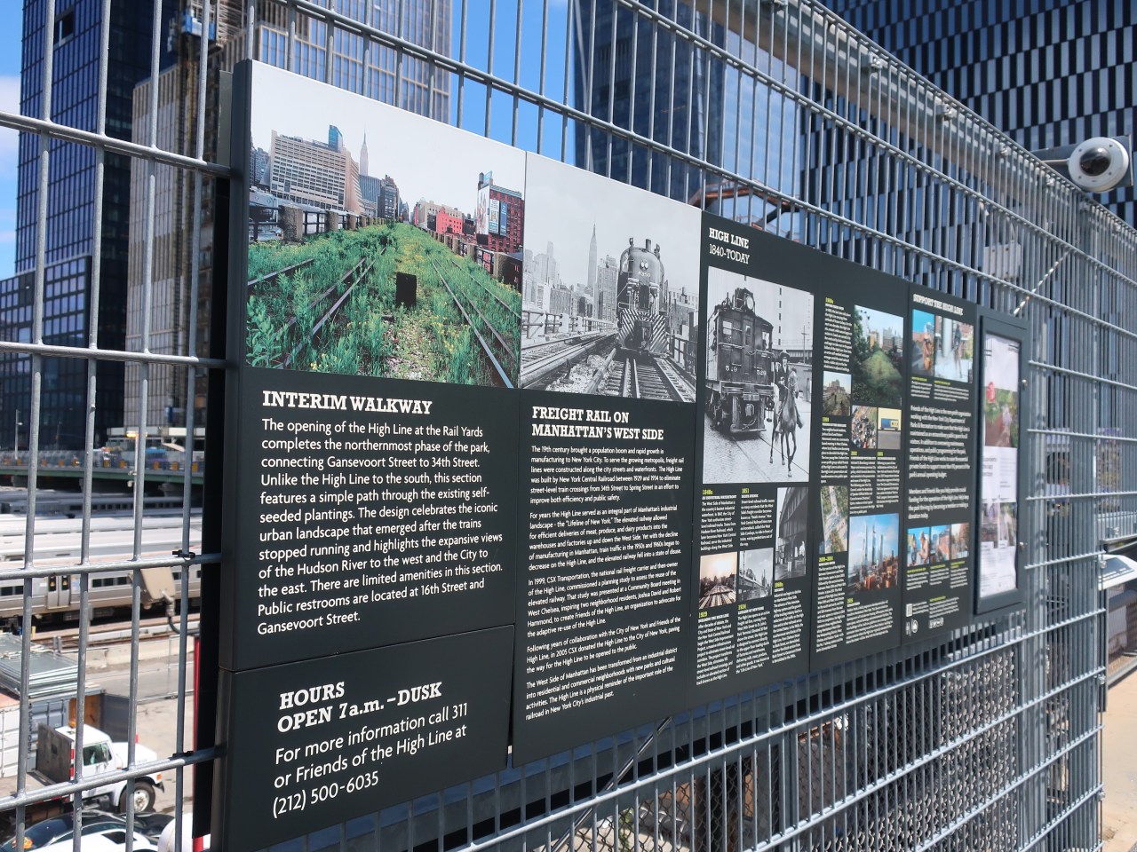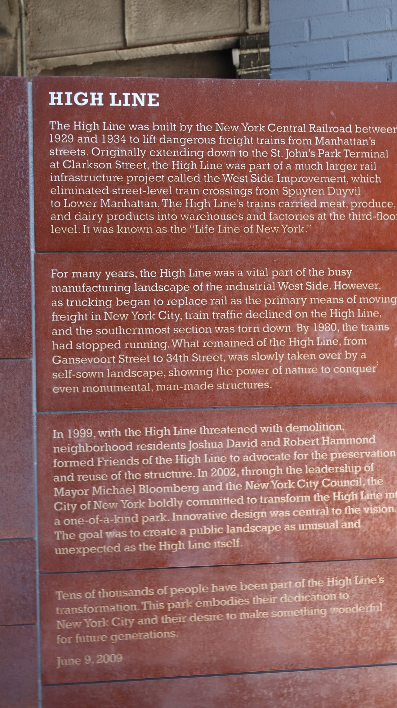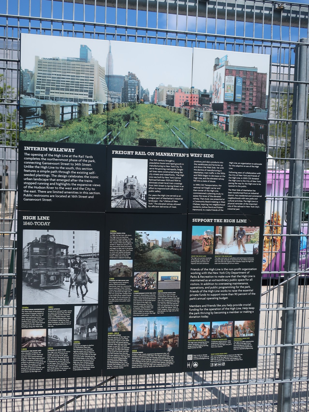 Juste pour situer la High Line Park est construite sur la portion sud désaffectée de la West Side Line allant jusqu’à Lower West Side. Elle passe par Gansevoort Street, trois pâtés de maisons en dessous de la 14th Street, dans le Meatpacking District, à travers Chelsea jusqu’à la limite nord de West Side Yard sur la 34th Street près du Javits Convention Center. Je vous laisserais lire le panneau pris en photo sur l’histoire de la High Line.